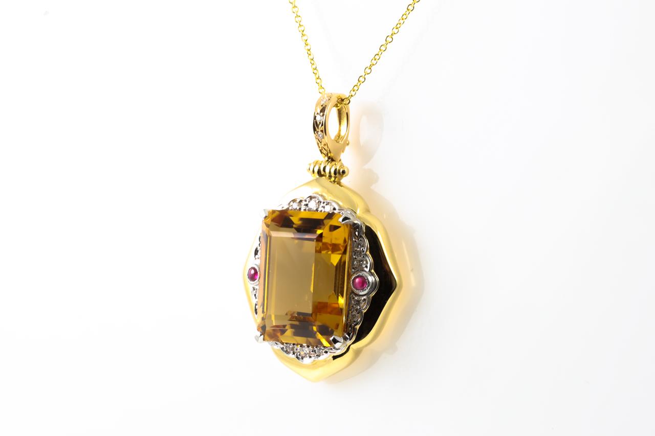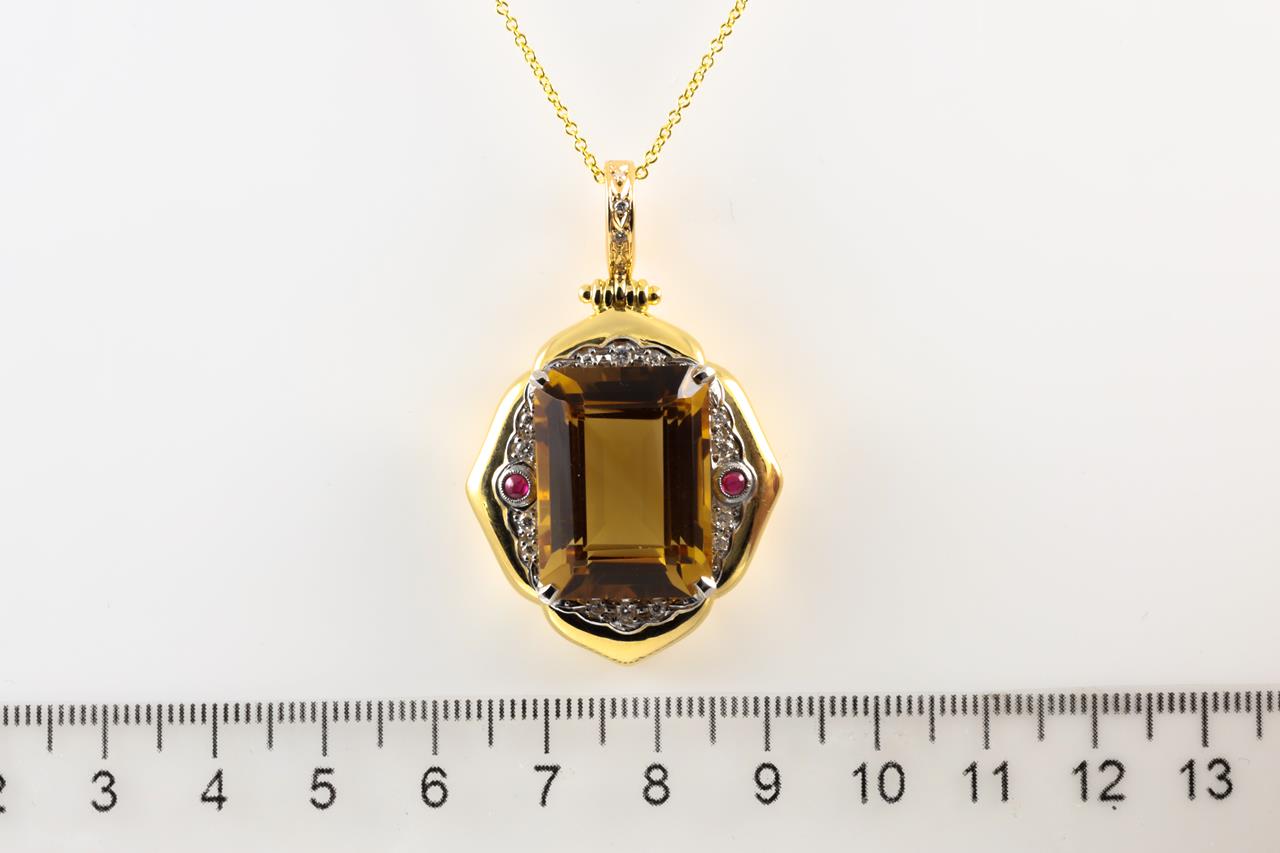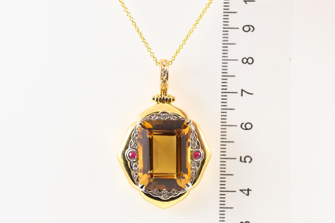 Citrine and Diamond pendant with an emerald cut Citrine of 24.36ct, Rubies totalling 0.19cts and Diamonds totalling 0.24cts. 18ct yellow gold. Weight: 19.1g (Pre-owned)