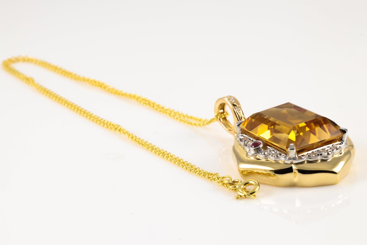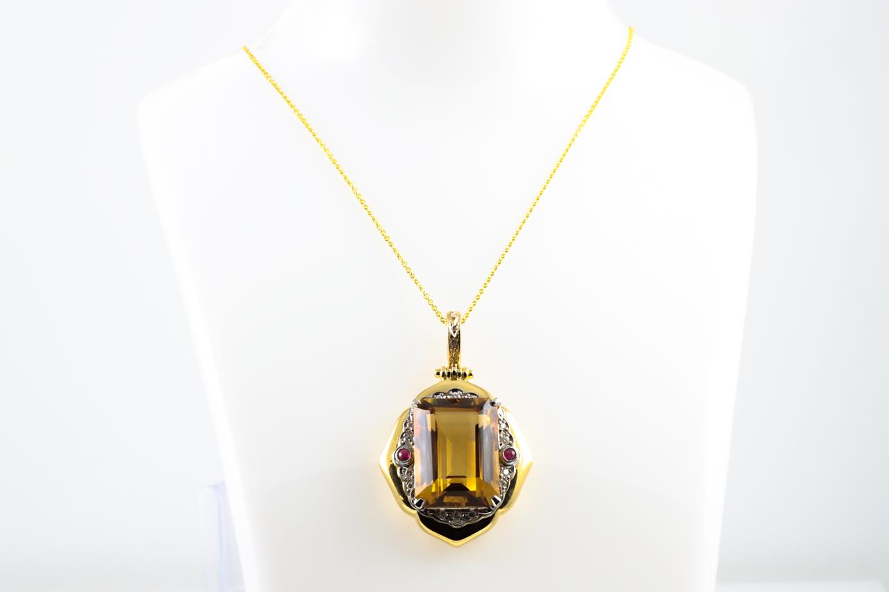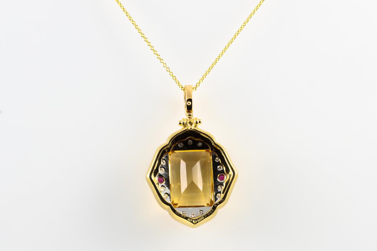 Citrine and Diamond pendant with an emerald cut Citrine of 24.36ct, Rubies totalling 0.19cts and Diamonds totalling 0.24cts. 18ct yellow gold. Weight: 19.1g (Pre-owned)