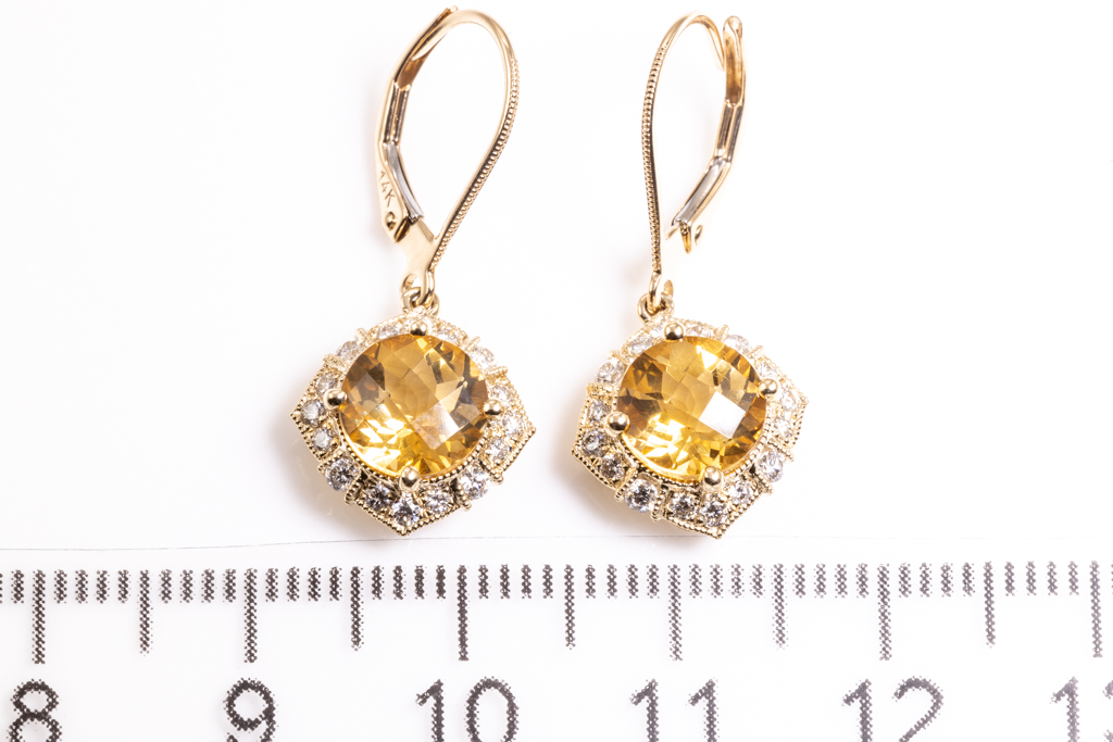 Citrine and Diamond leverback earrings with round Citrine totalling 2.43cts and round Diamonds totalling 0.36cts. (Estimated grading: H SI). 14ct yellow gold. Weight: 3.5g. (New)