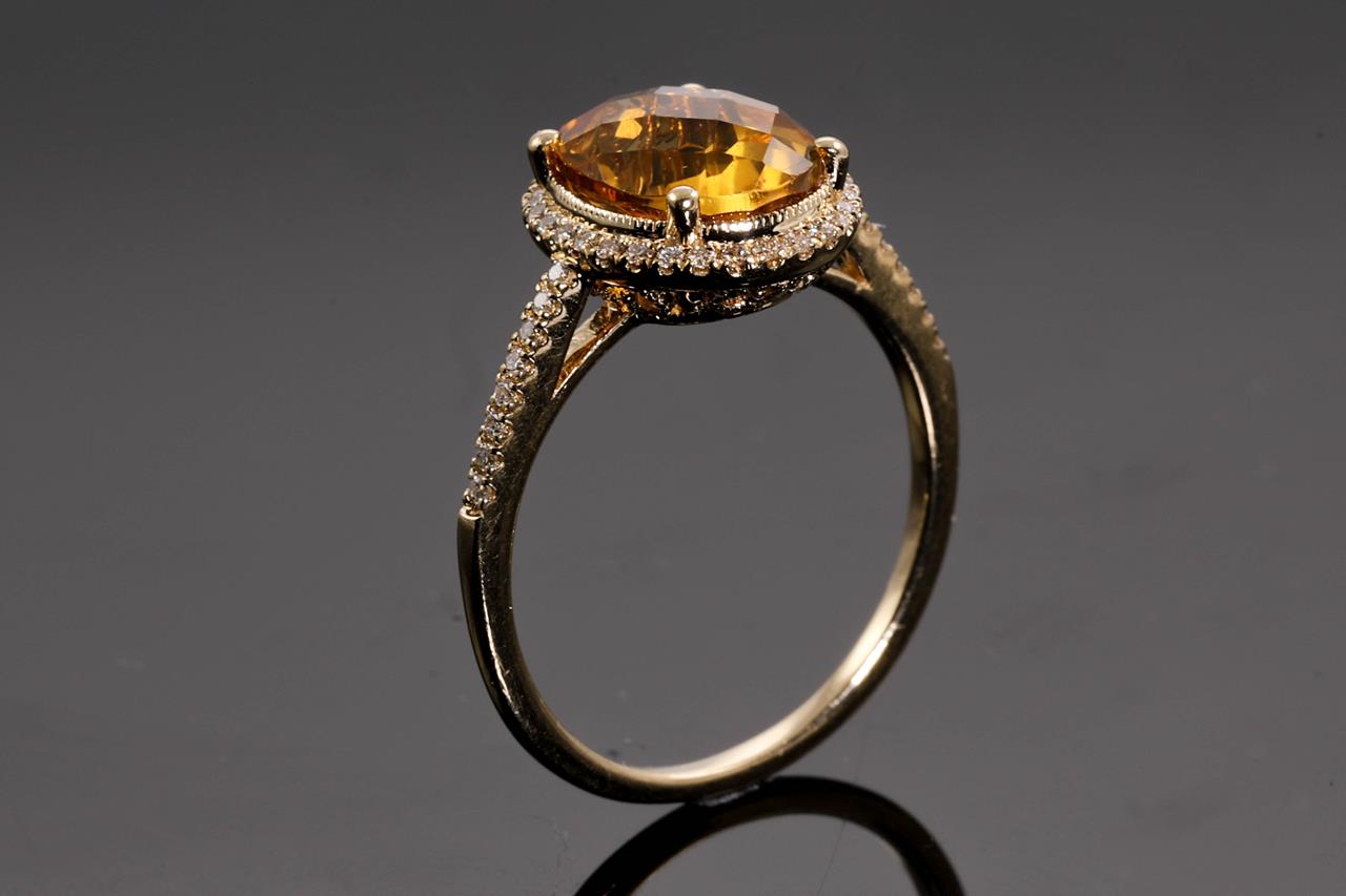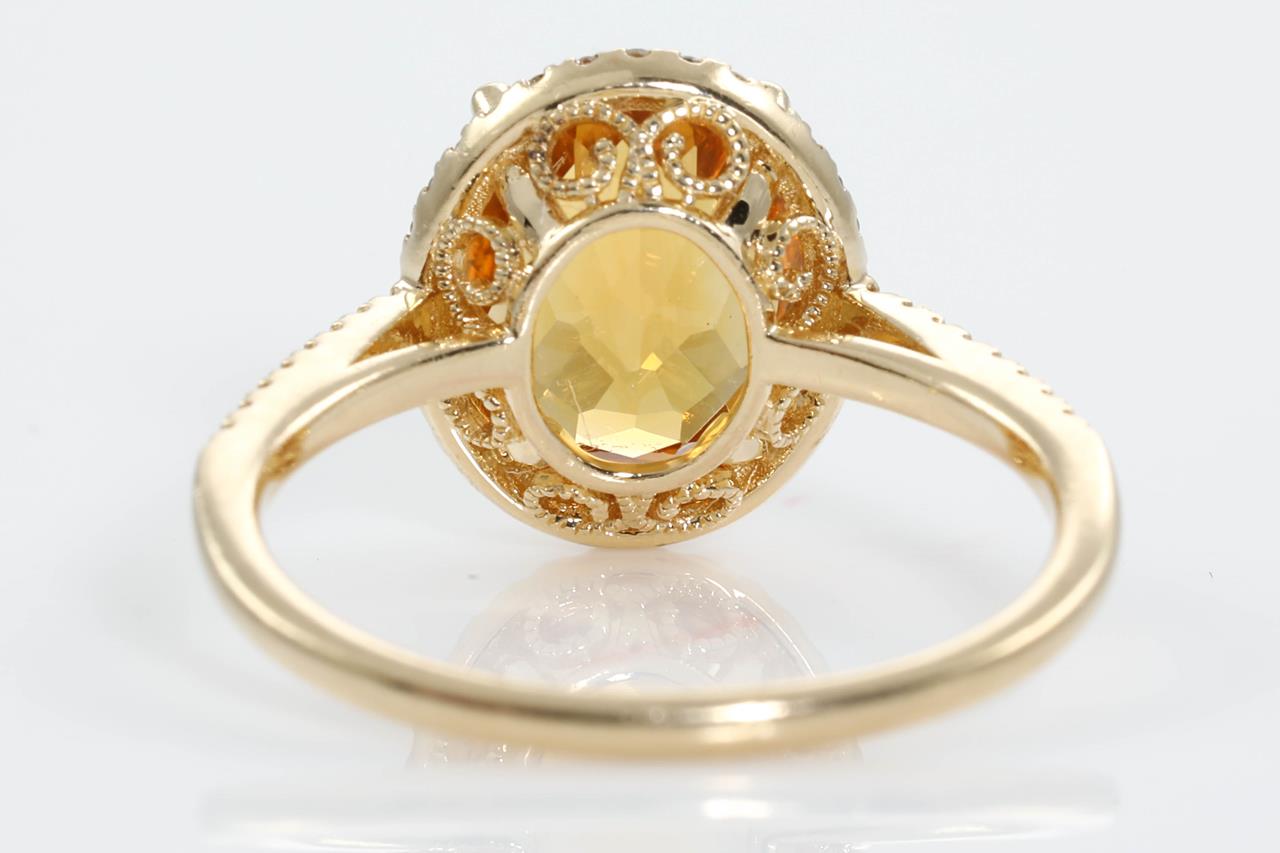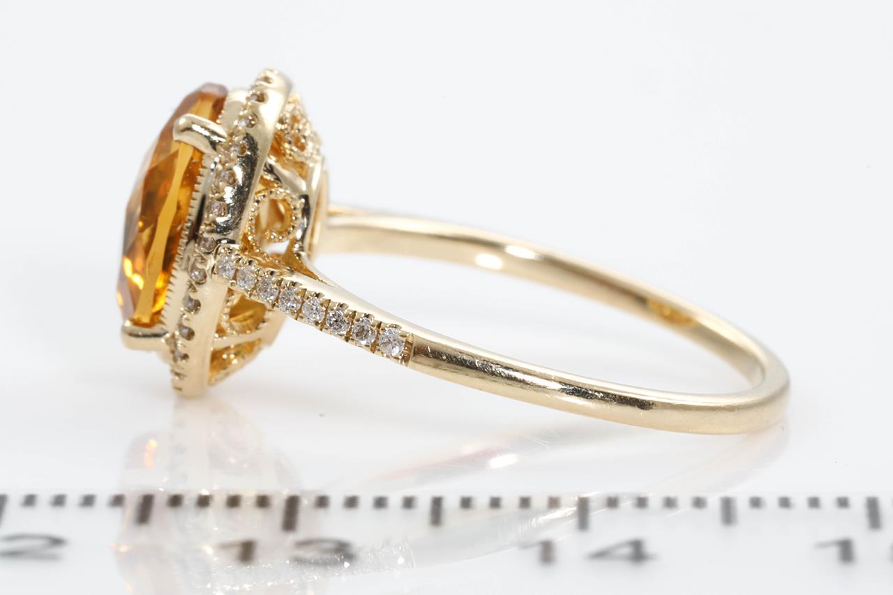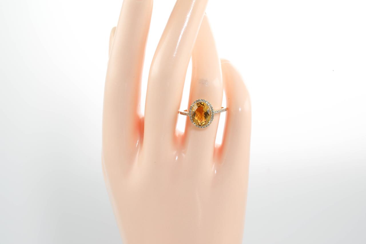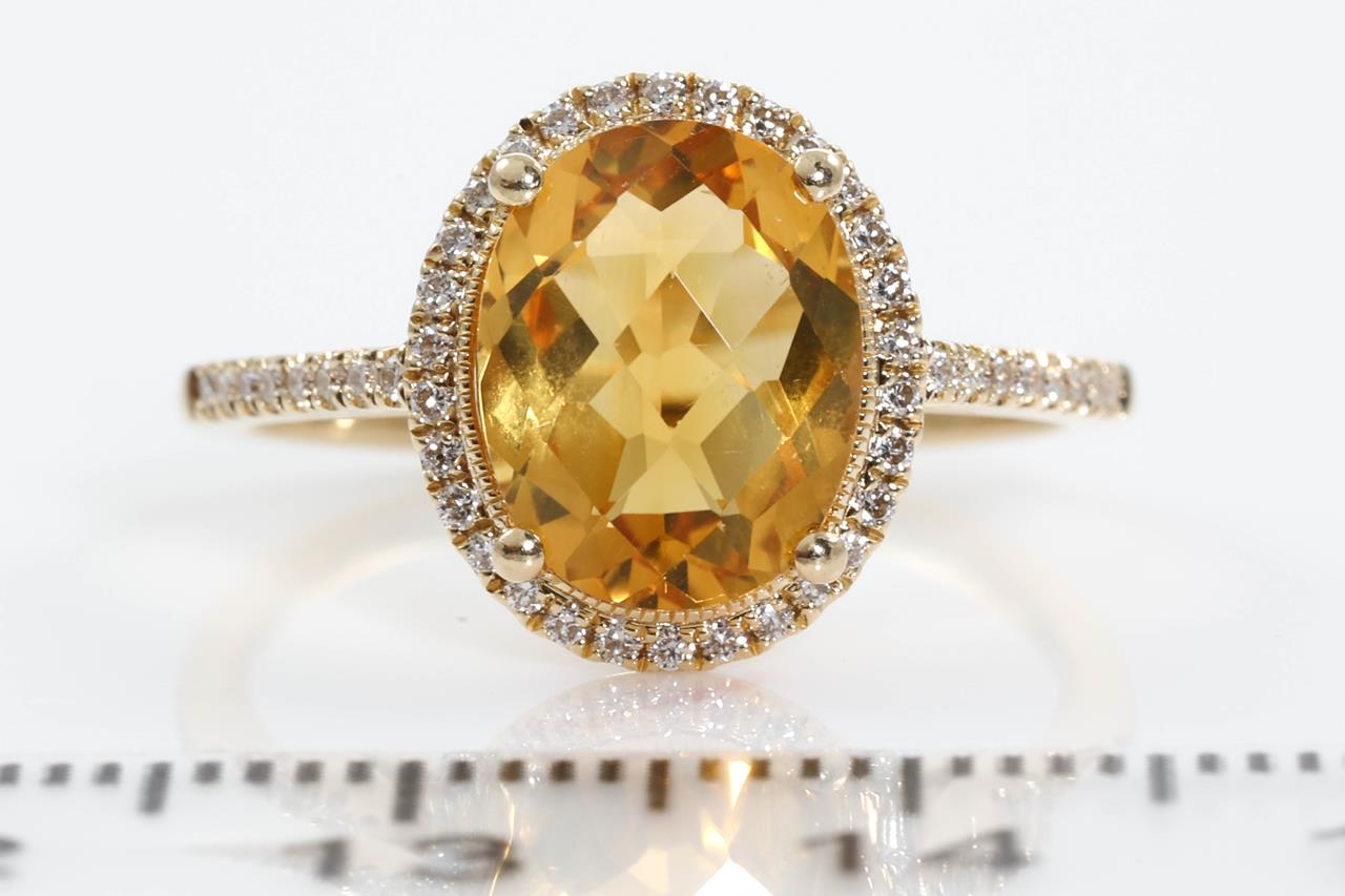 Citrine and Diamond ring with an oval checkerbord cut Citrine of 2.43ct and Diamonds totalling 0.19cts. 14ct yellow gold. Ring size N1/2. Weight 2.8g. (Pre-owned)