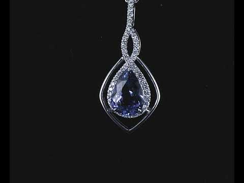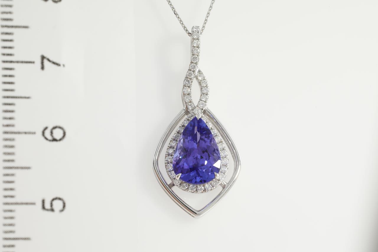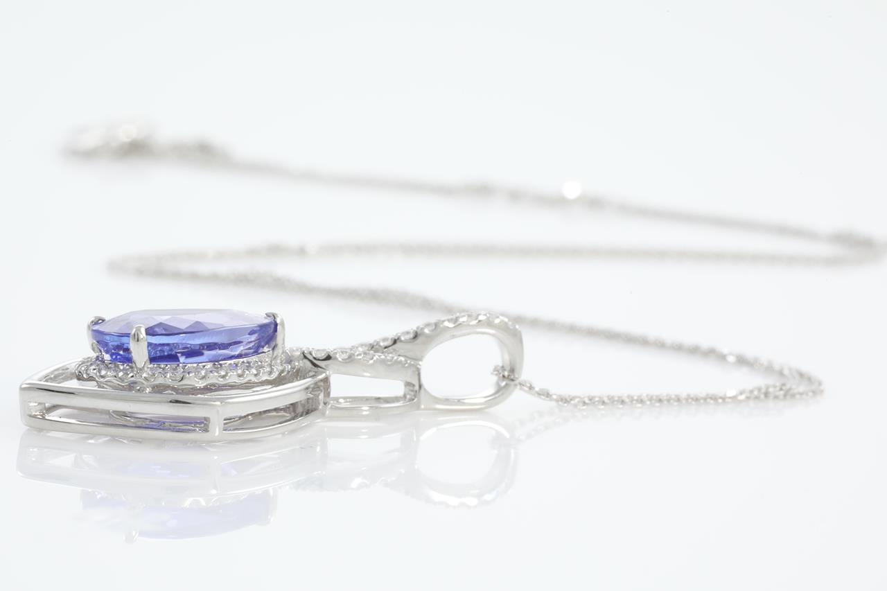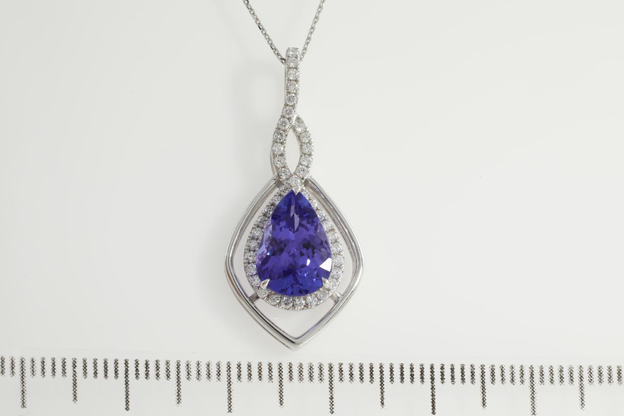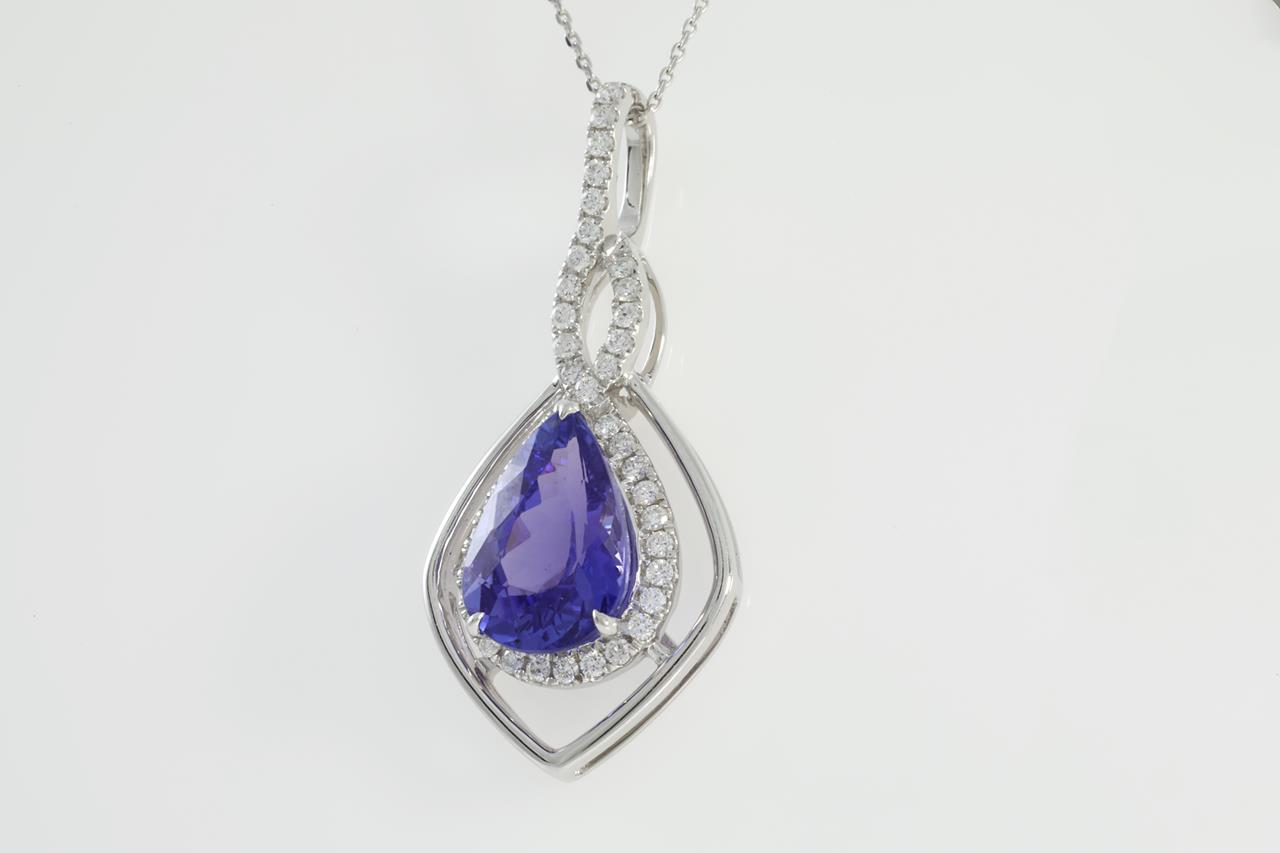 Tanzanite and Diamond pendant with pear checkerboard cut Tanzanite of 2.43ct and round Diamonds totalling 0.26cts. 14ct white gold with 14ct gold 45cm chain. Weight: 3.6g (As New)