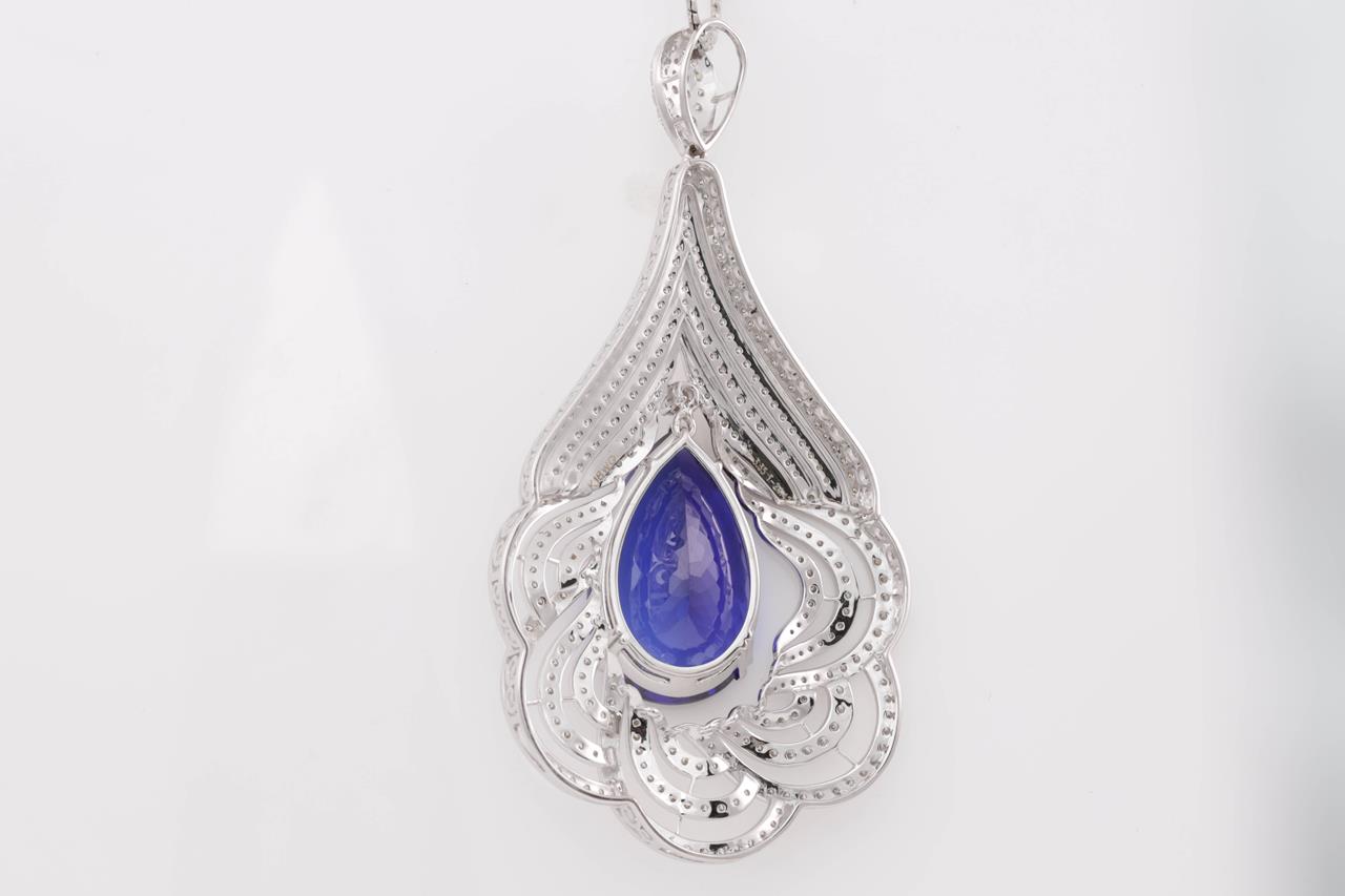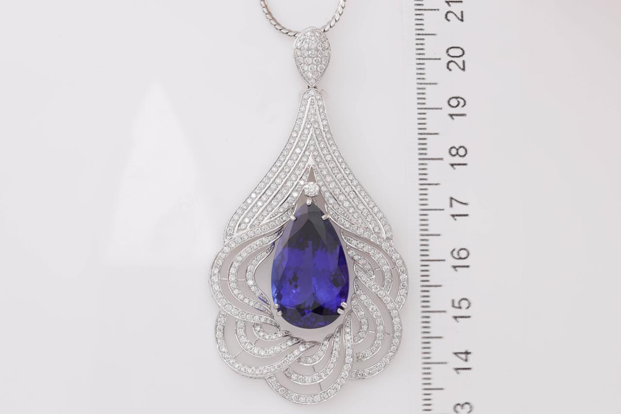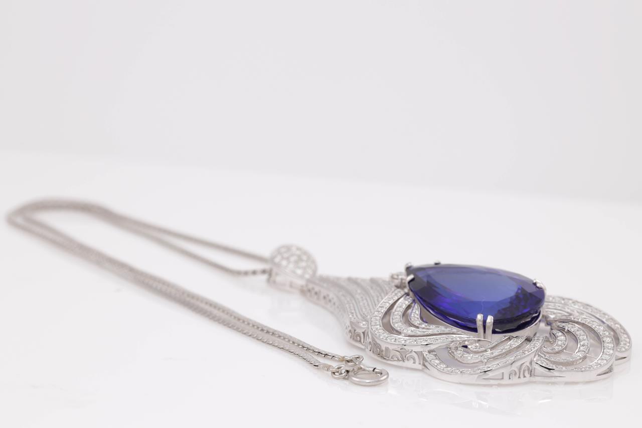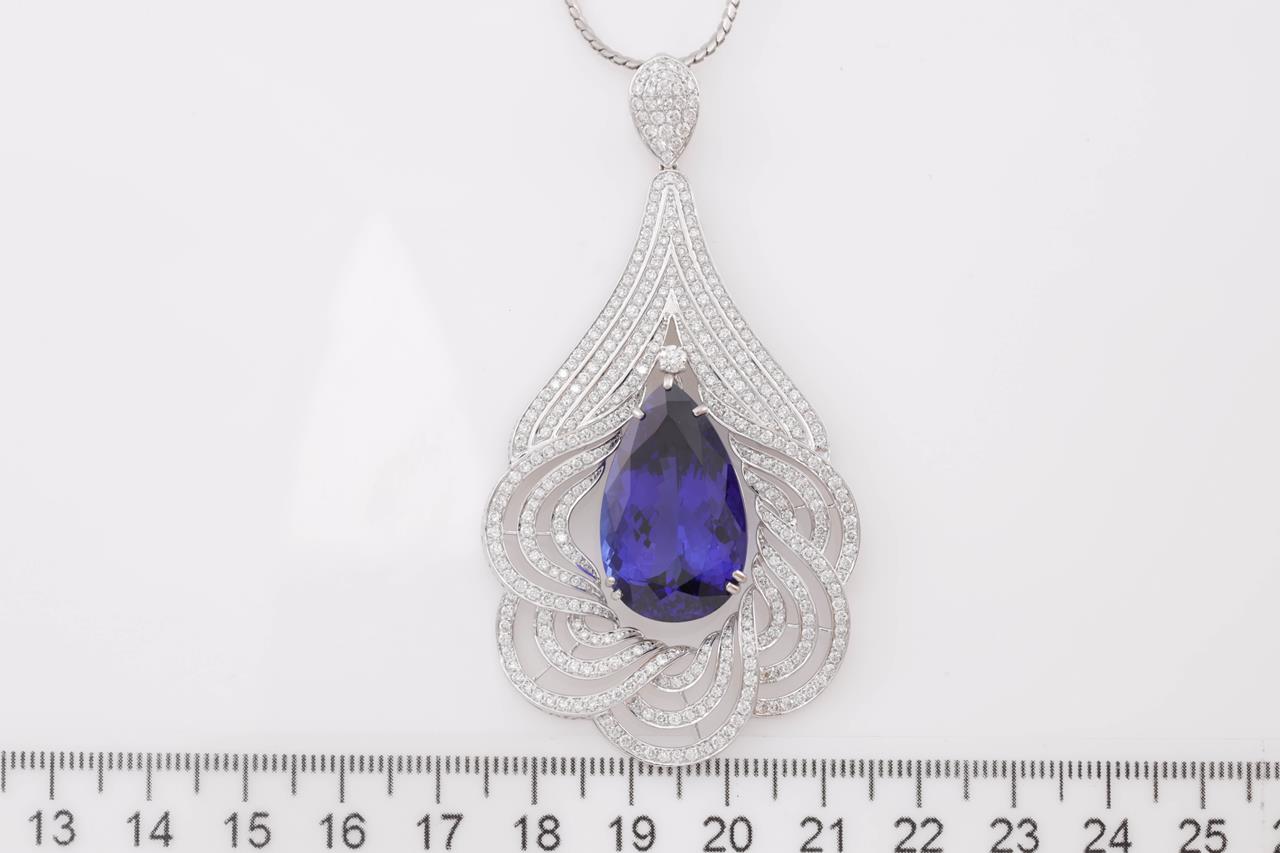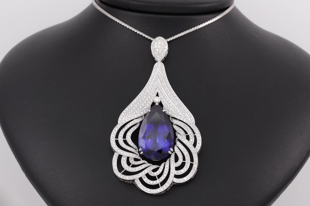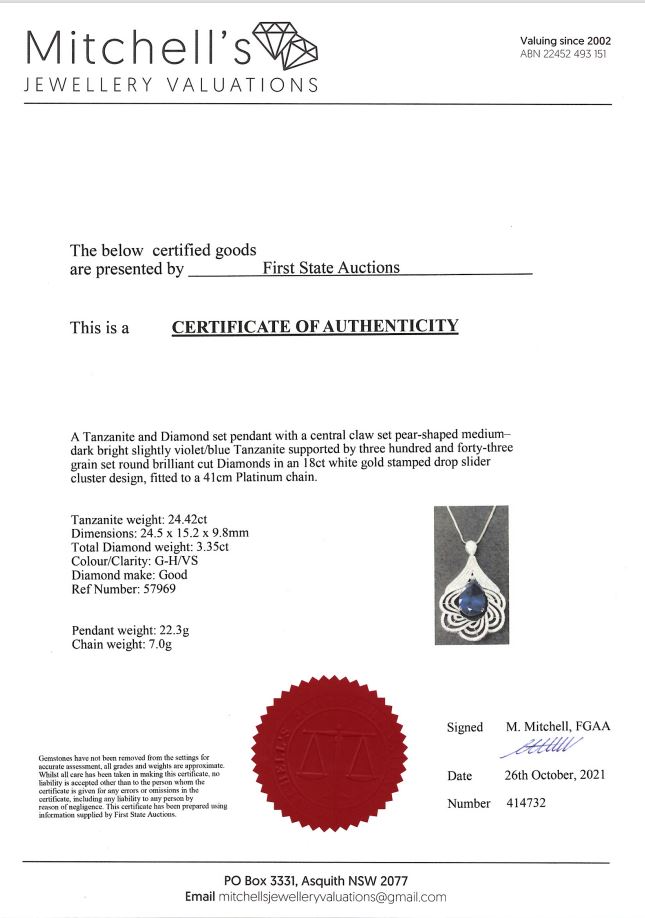 Tanzanite and Diamond pendant with a pear shape Tanzanite of 24.42ct and Diamonds totalling 3.35cts (Estimated grading: G-H VS). 18ct white gold with 41cm platinum chain. Weight: 29.3g. With certificate #414732. (Pre-owned)
