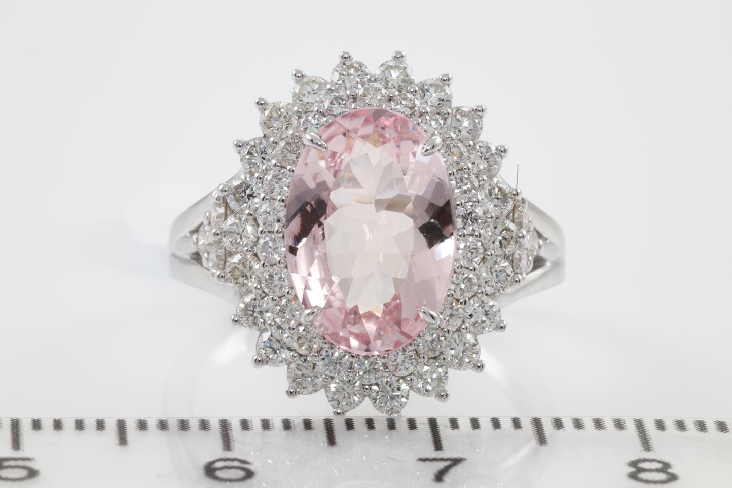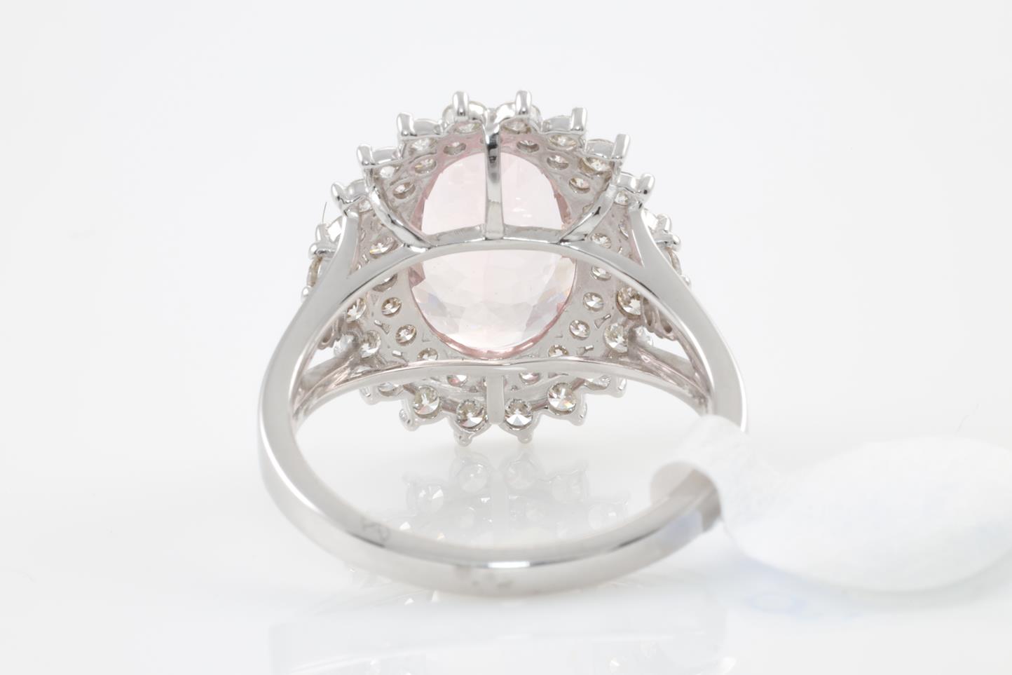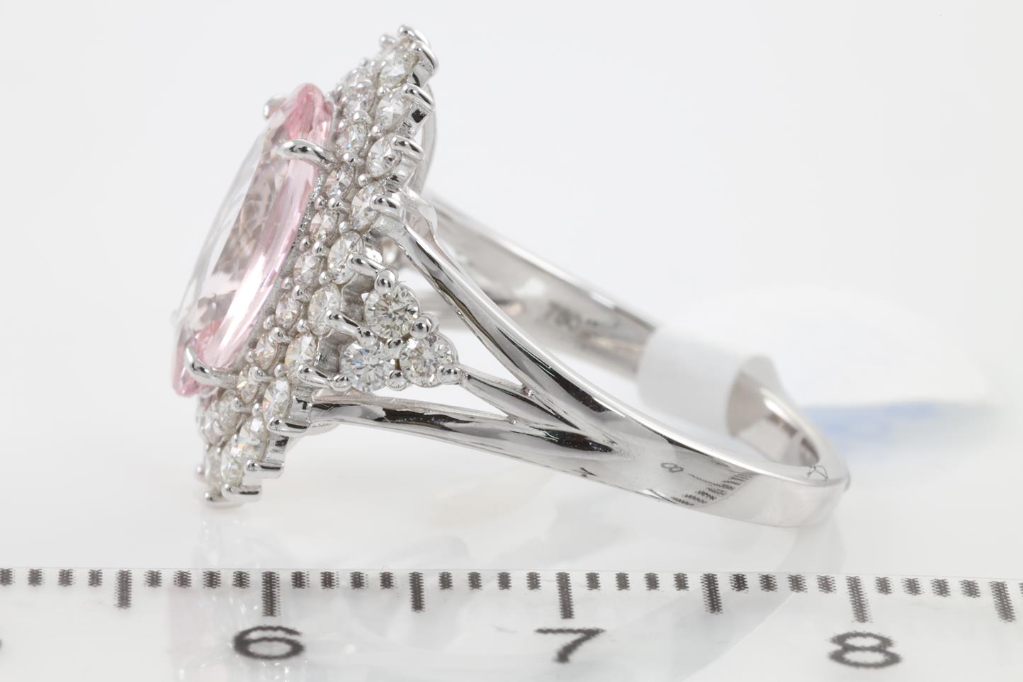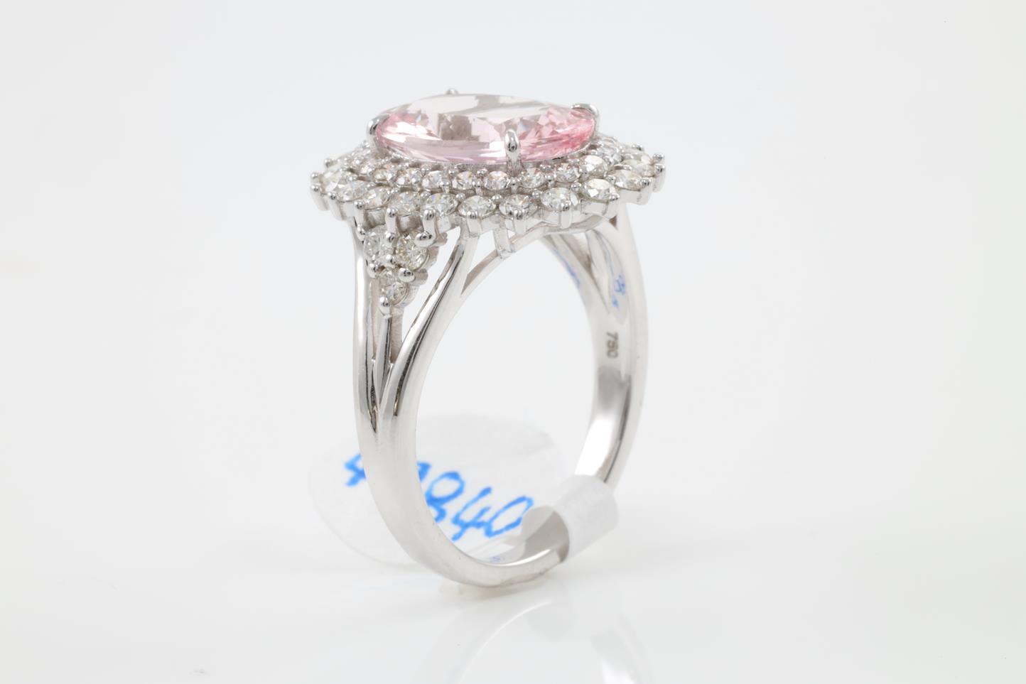 Morganite and Diamond ring with oval shape pink Morganite of 2.44ct and Diamonds totaling 1.08cts (Estimated grading: I-J SI). 18ct white gold. Ring size M. Weight: 4.6g (Pre-owned)