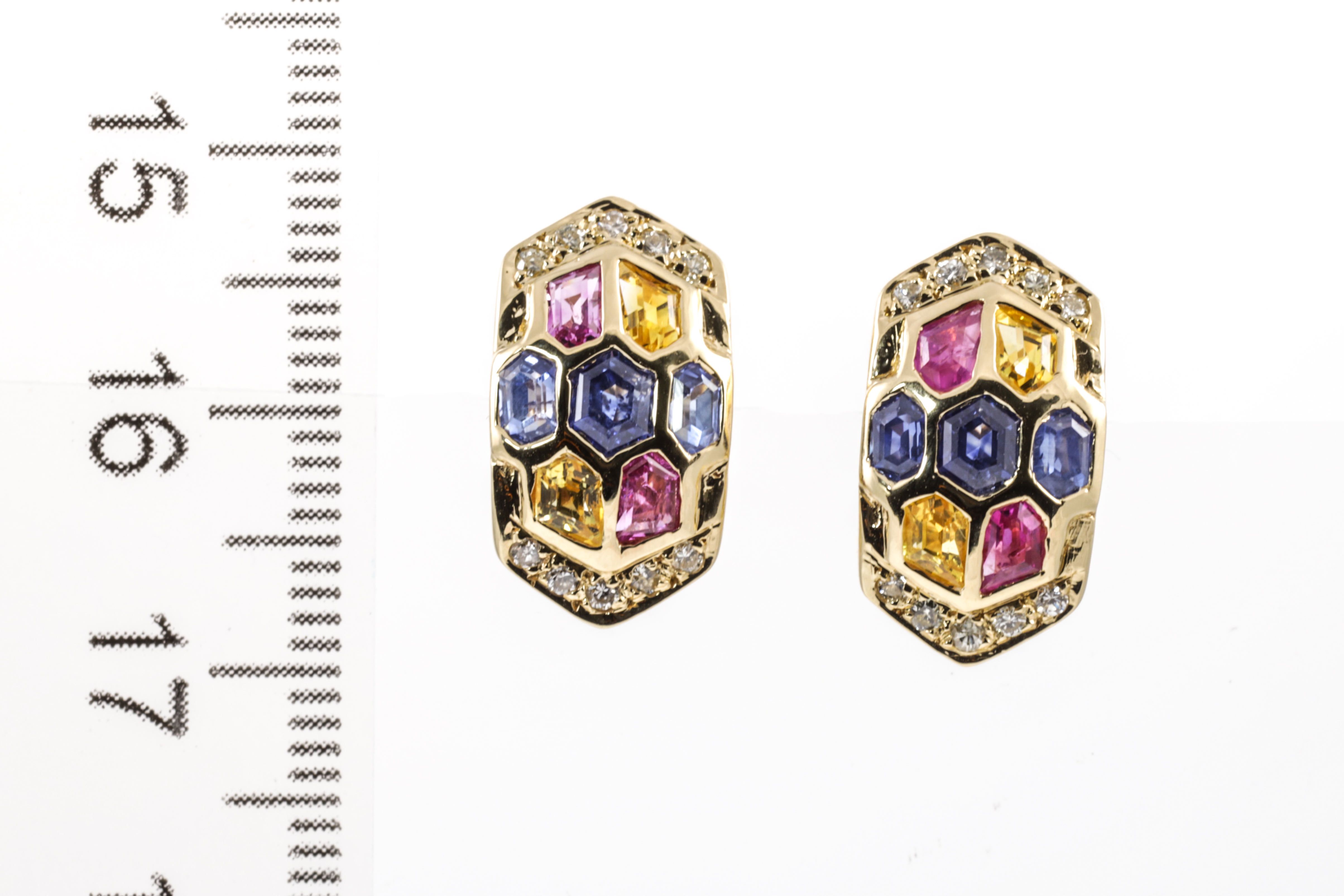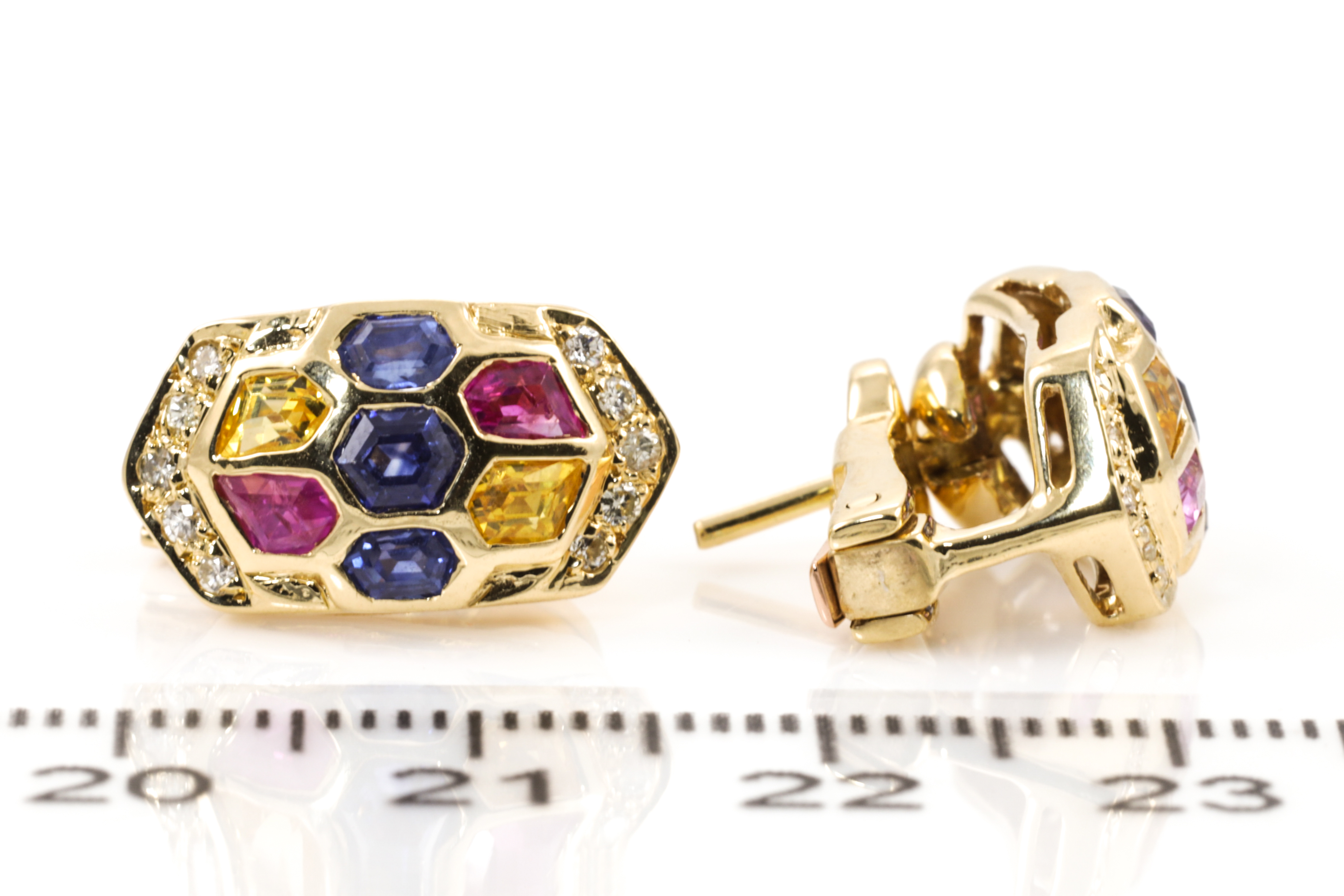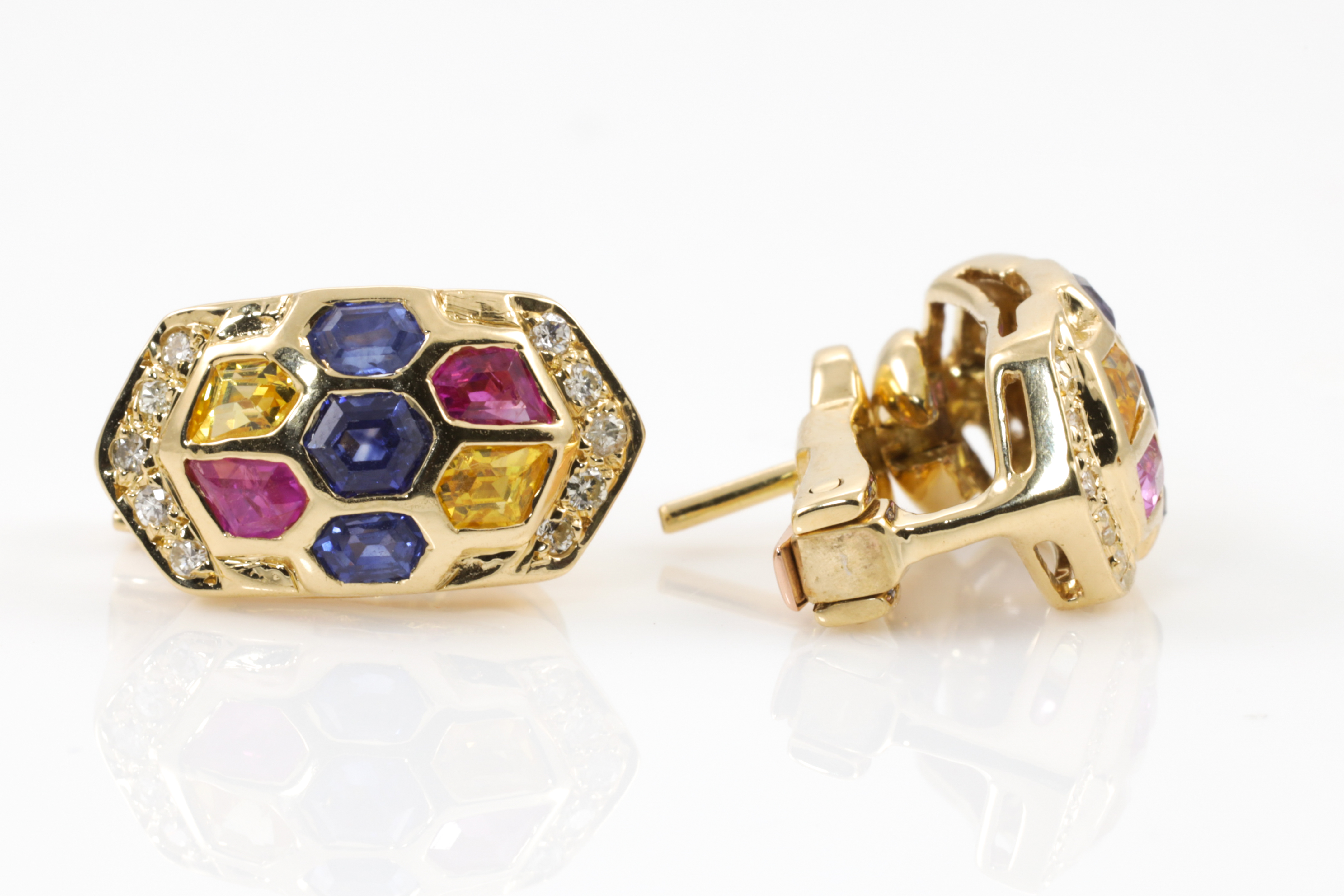 Sapphire and Diamond earrings with fancy cut multi colour Sapphires totalling 2.45cts and Diamonds totalling 0.21cts. 18ct yellow gold. Weight: 8.3g. (Pre-owned)