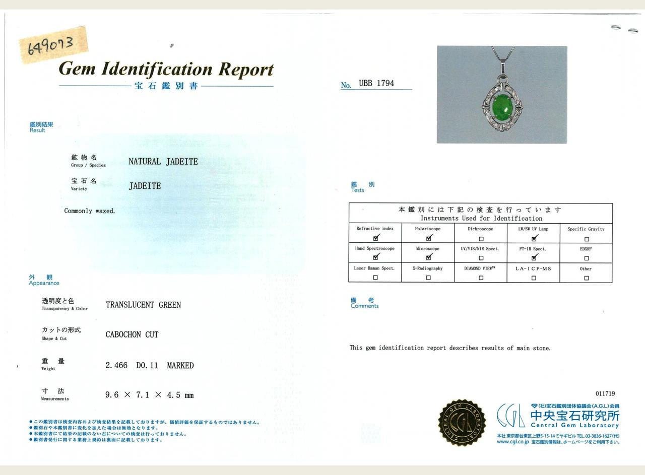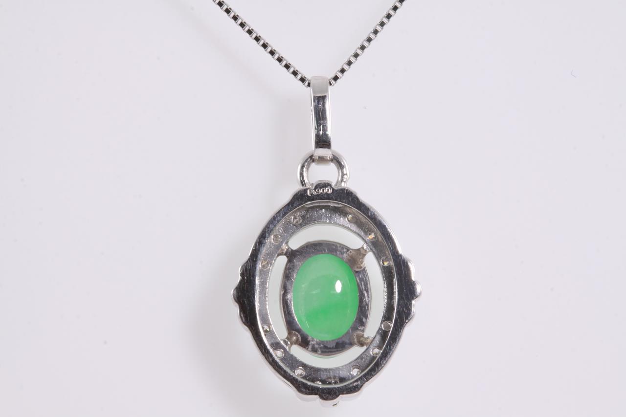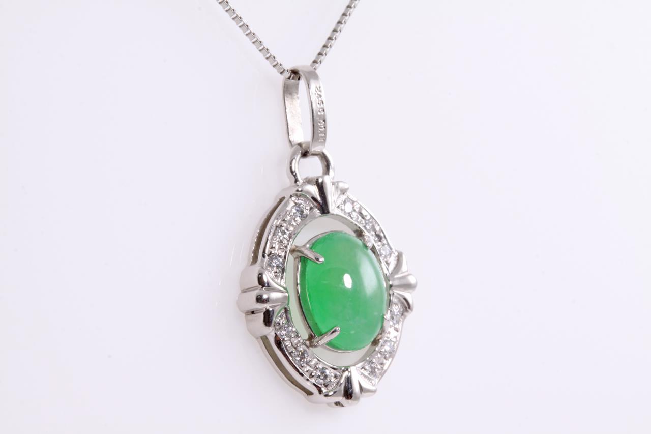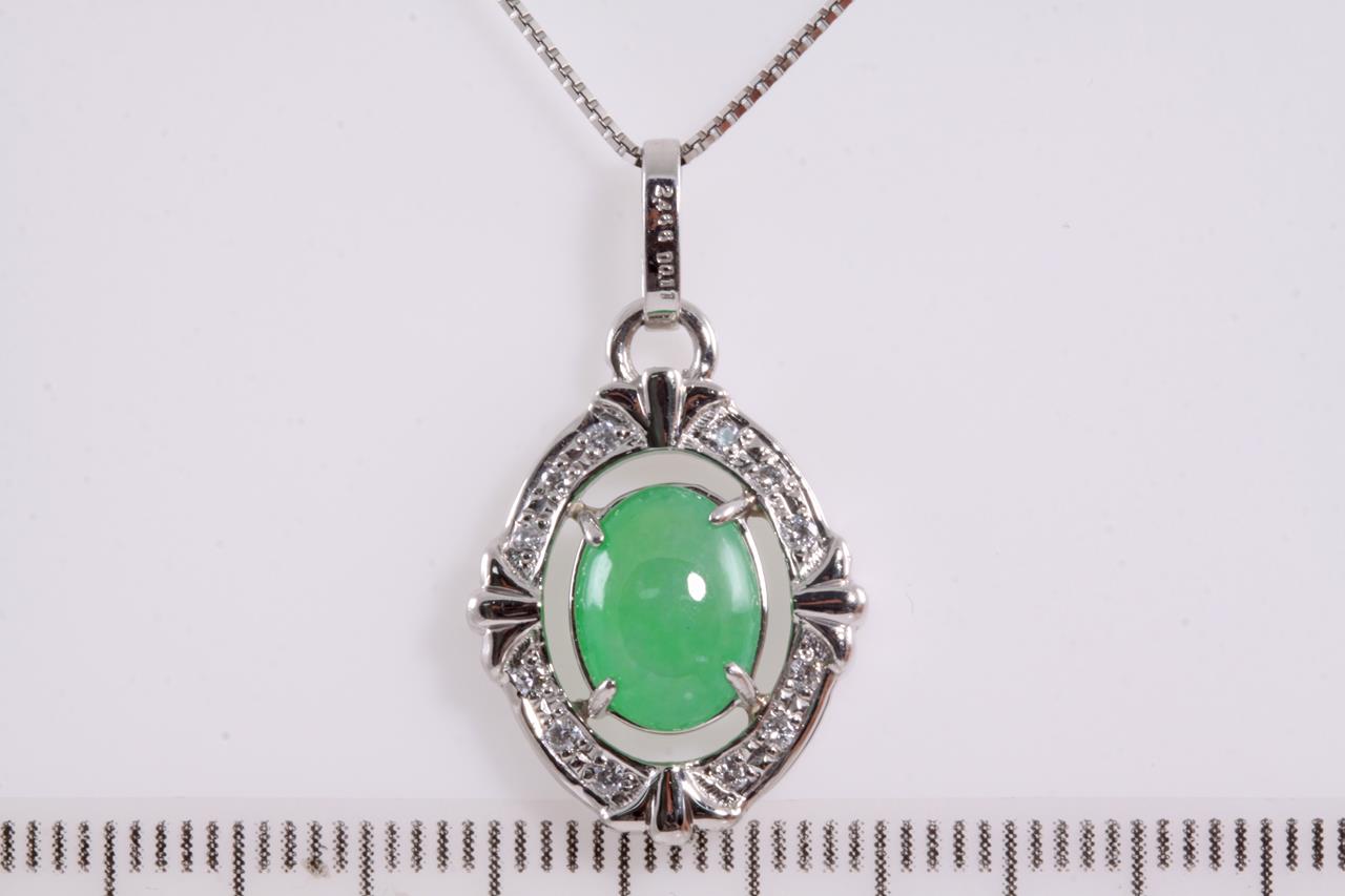 Jade and Diamond pendant with oval cabochon cut translucent green natural (Jadeite Jade) of 2.46ct - Type A (with Gem Identification Report #UBB 1794) and Diamonds totalling 0.11cts. Platinum, with adjustable 44cm platinum chain. Weight: 7.3g (Pre-owned)