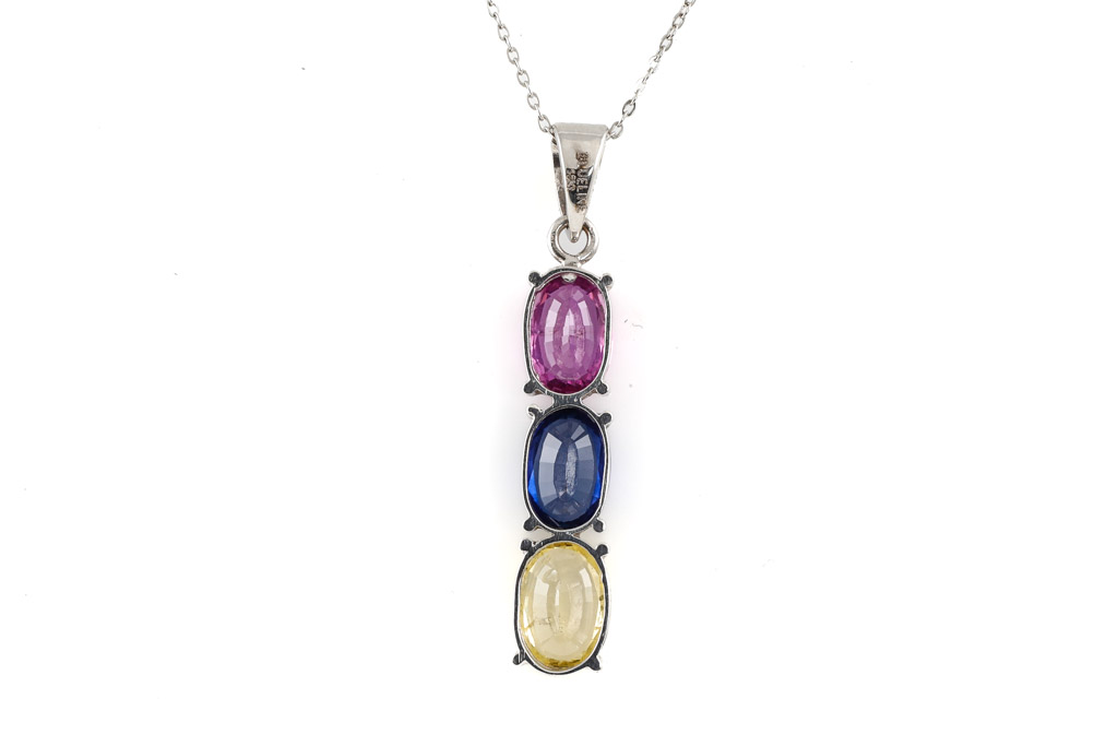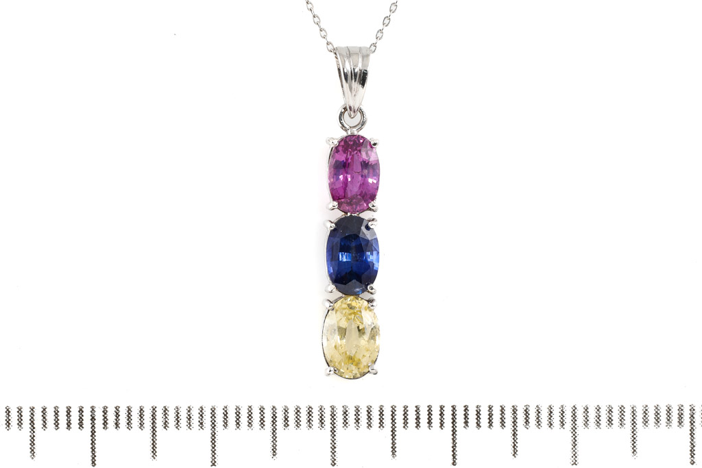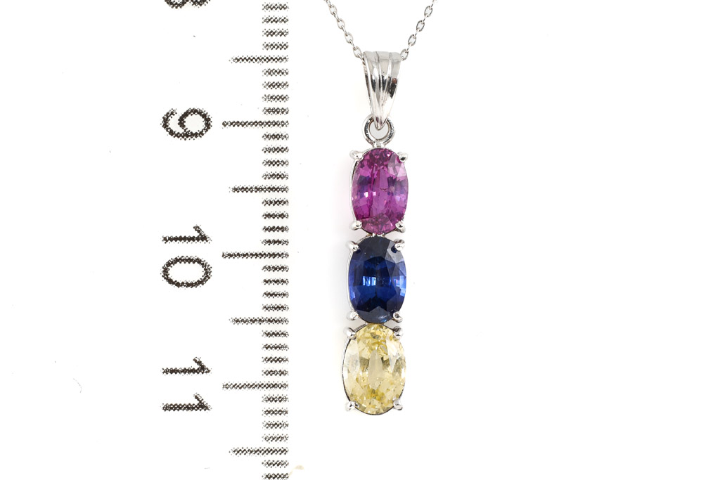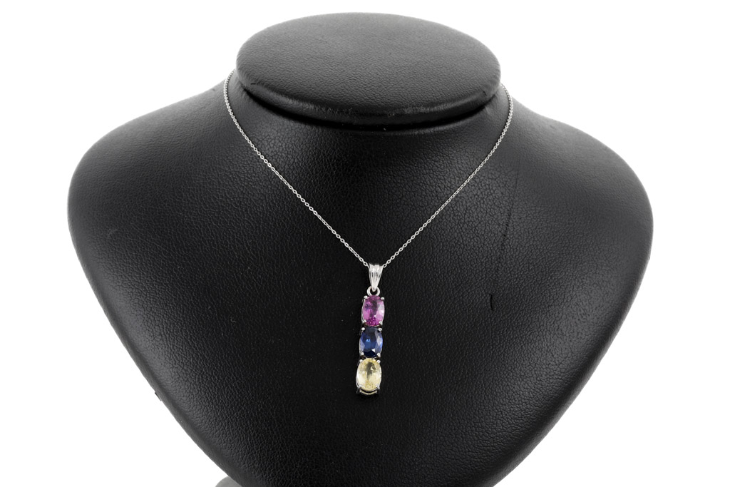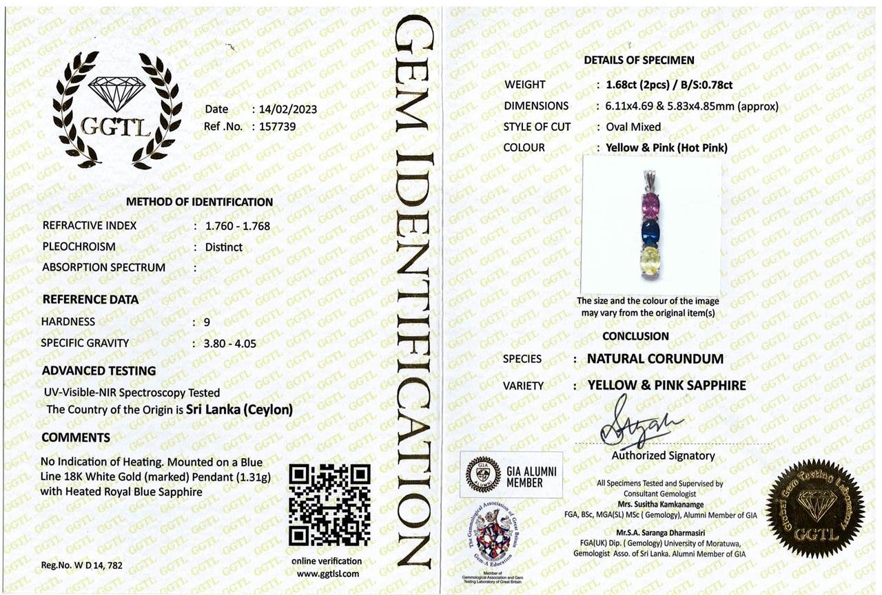 Sapphire pendant with an oval shape unheated pink & yellow Ceylon Sapphires totalling 1.68cts and heated royal blue Sapphire of 0.78ct. 18ct white gold with 45cm chain. Wight: 2.0g. With GGTL Certificate #157739. (As New)