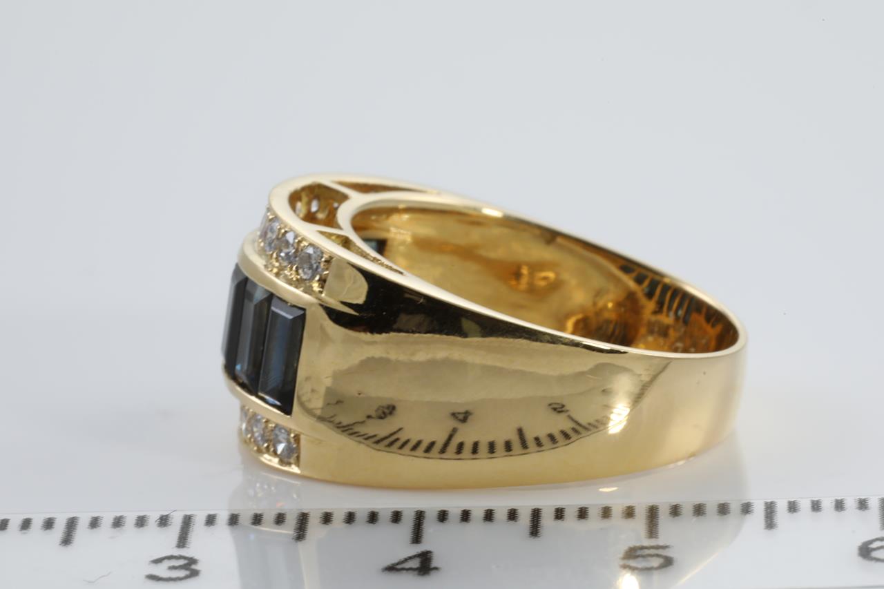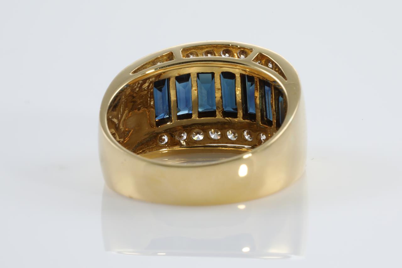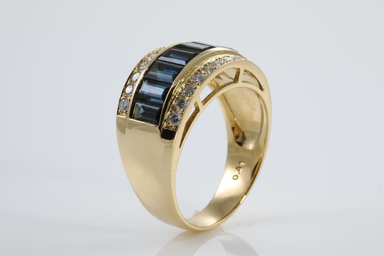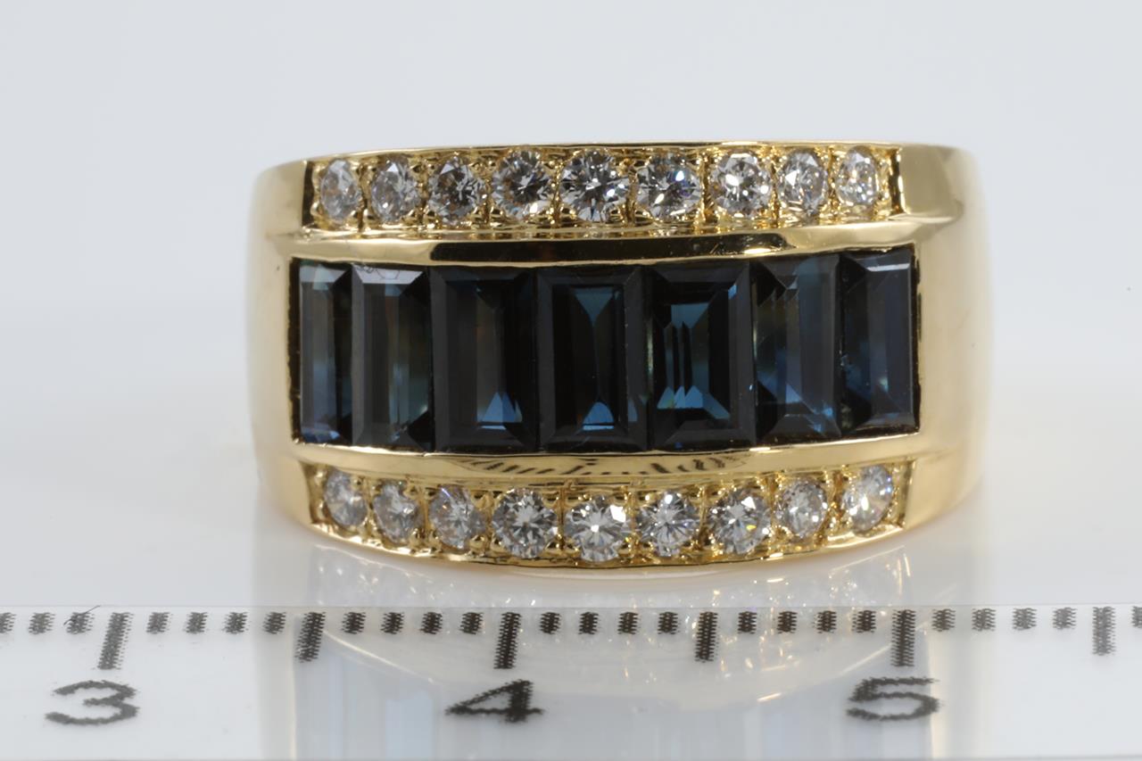 Sapphire and Diamond ring with emerald cut Sapphires totalling 2.47cts and Diamonds totalling 0.41cts (estimated grading: H SI). 18ct yellow gold. Ring size N1/2 - Ring resizing is not recommended. Weight: 7.5g (Pre-owned)