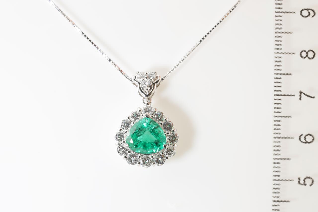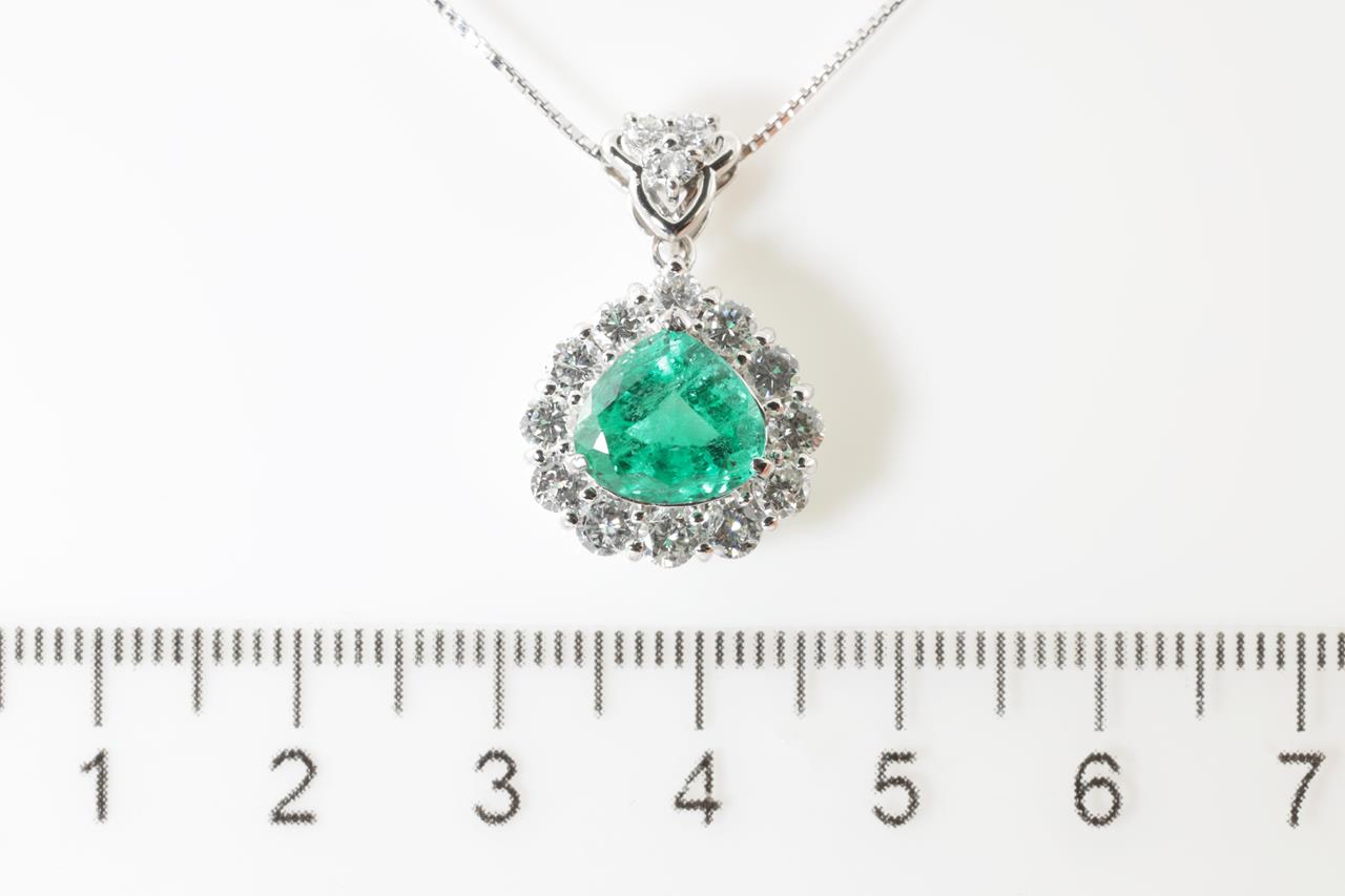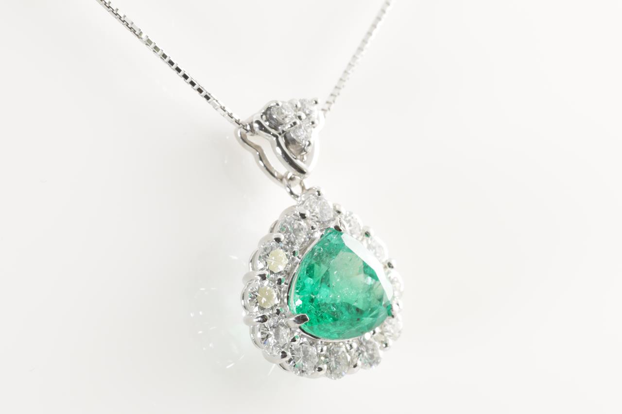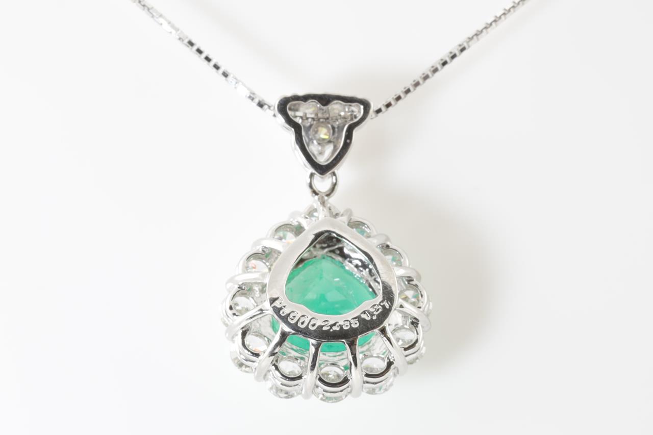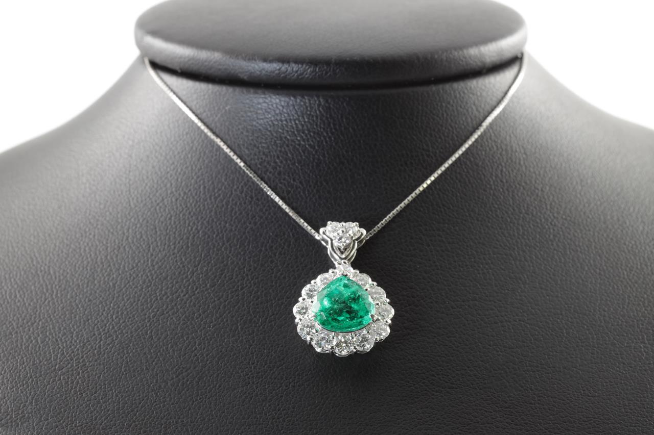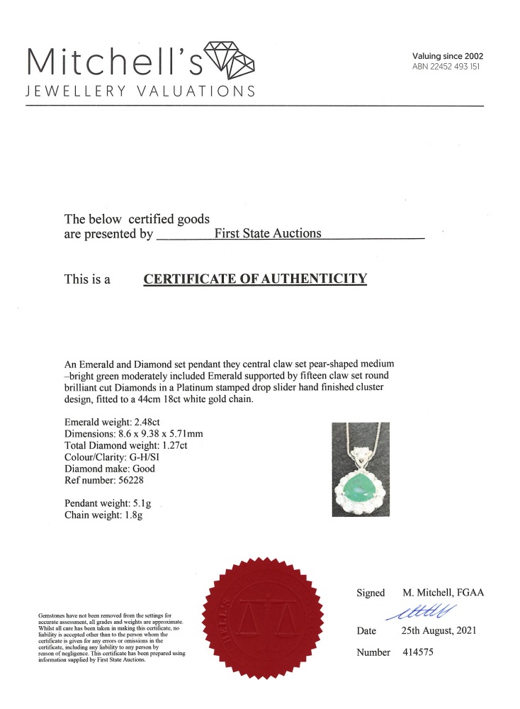 Emerald and Diamond pendant with a pear shape Emerald of 2.48ct and Diamonds totalling 1.27cts (Estimated grading: G-H SI). Platinum with 18ct white gold adjustable 44cm chain. Weight: 6.9g. With certificate #414575. (As New)