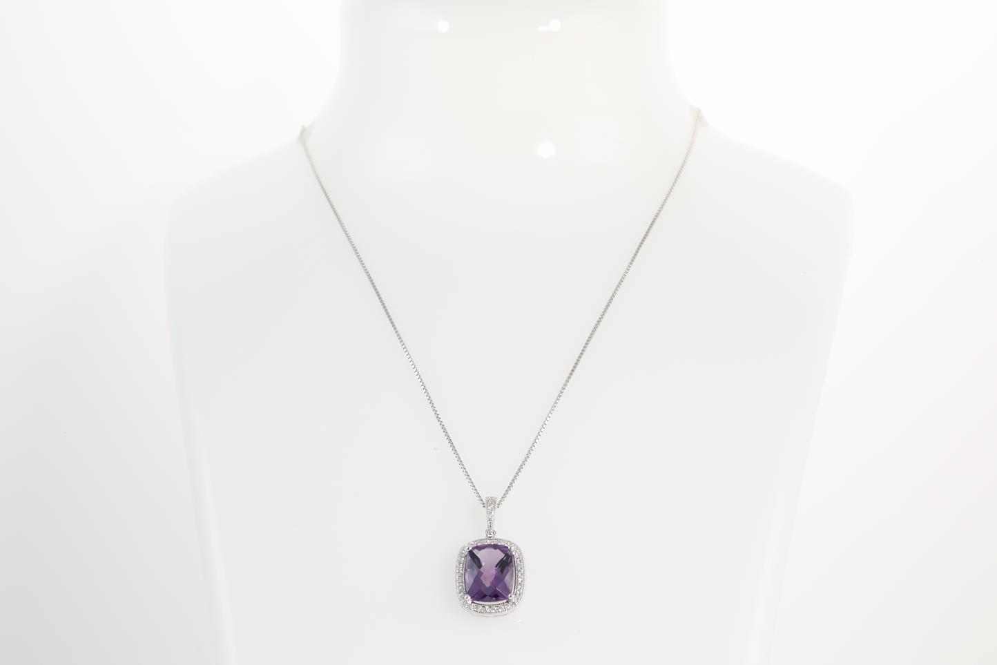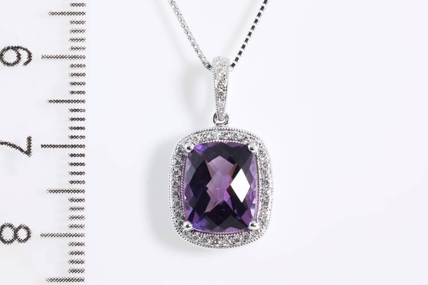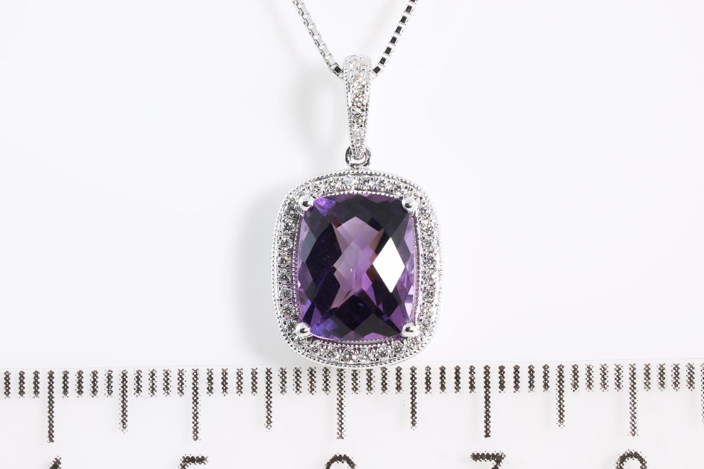 Amethyst and Diamond pendant with cushion cut Amethyst of 2.49ct and Diamonds totalling 0.17cts. 14ct white gold with 18ct white gold adjustable 45cm chain. Weight: 4.0g (New)