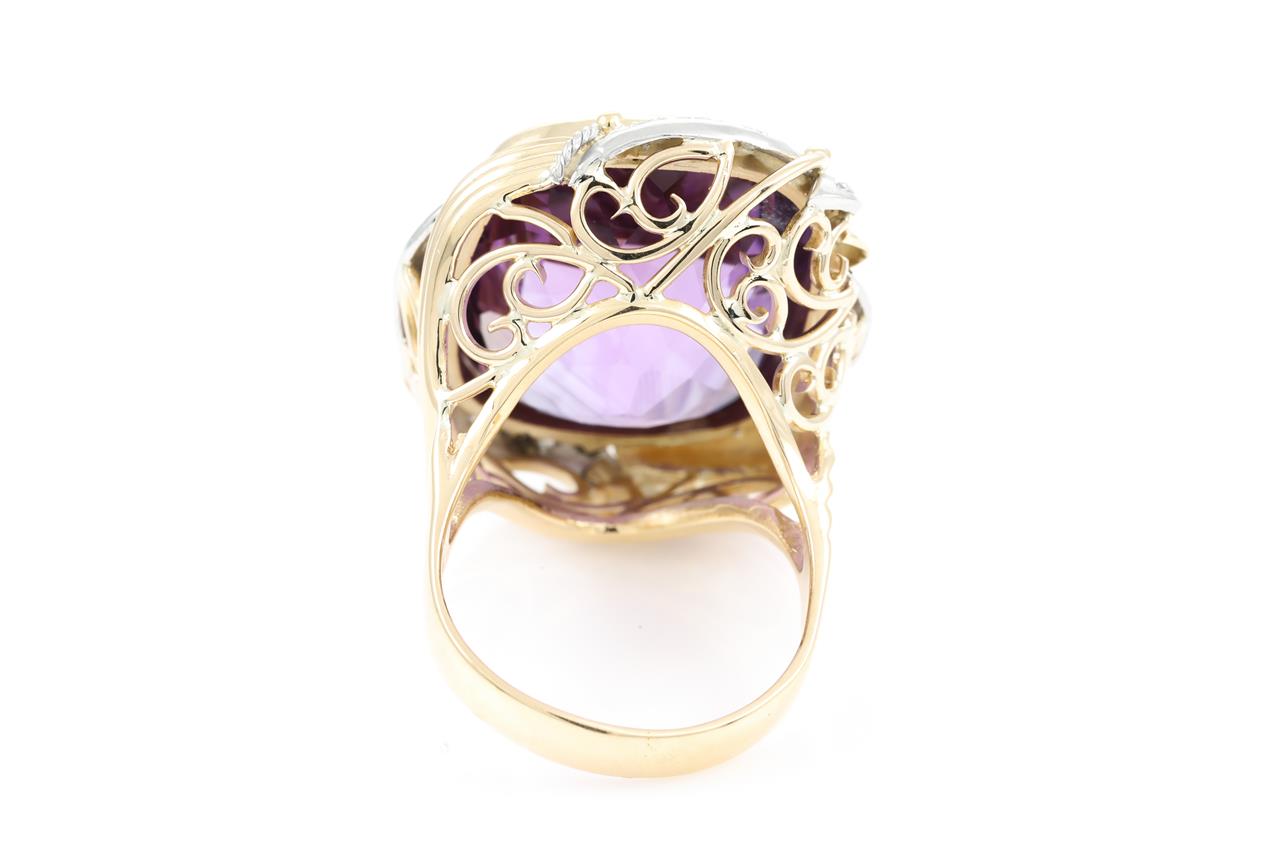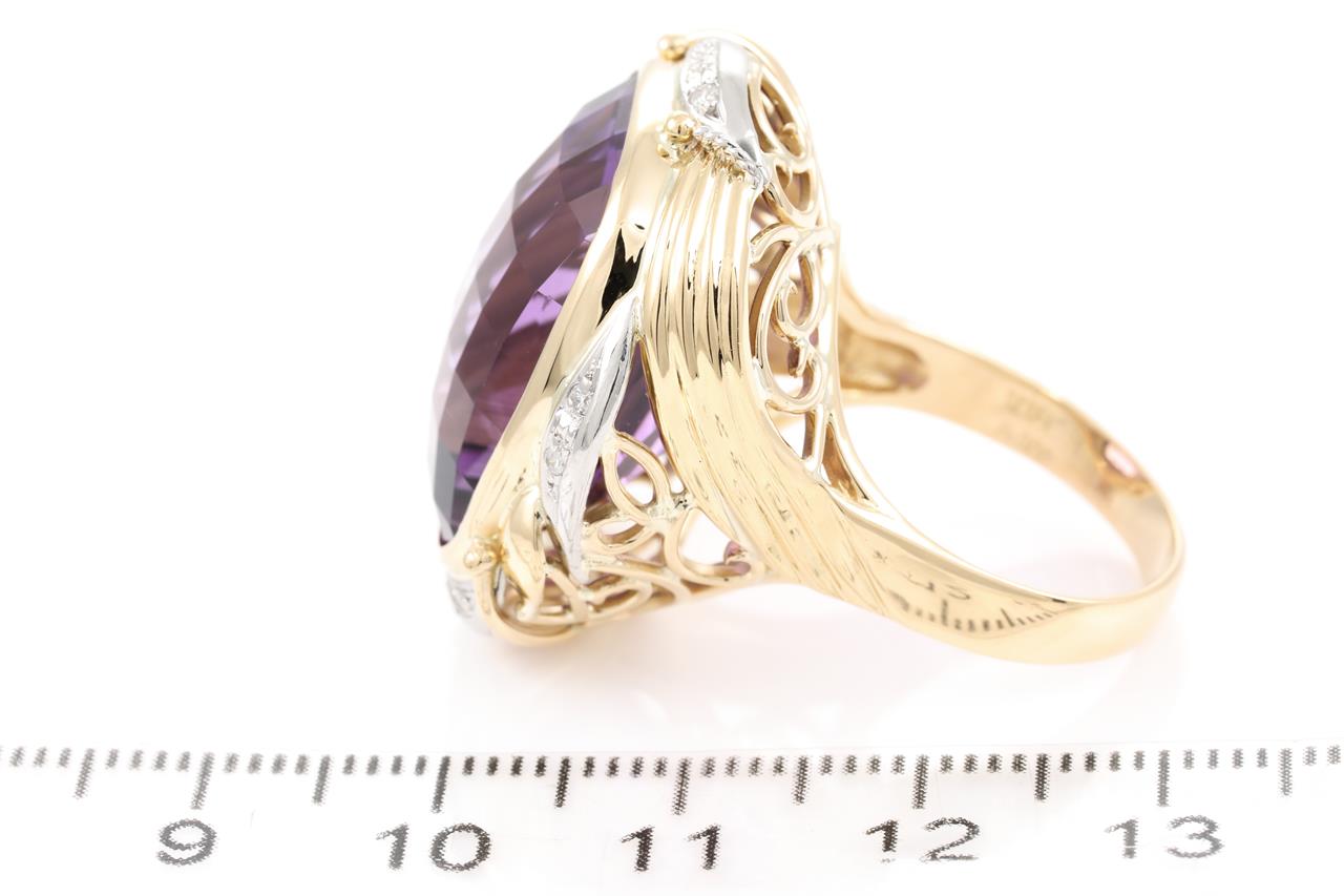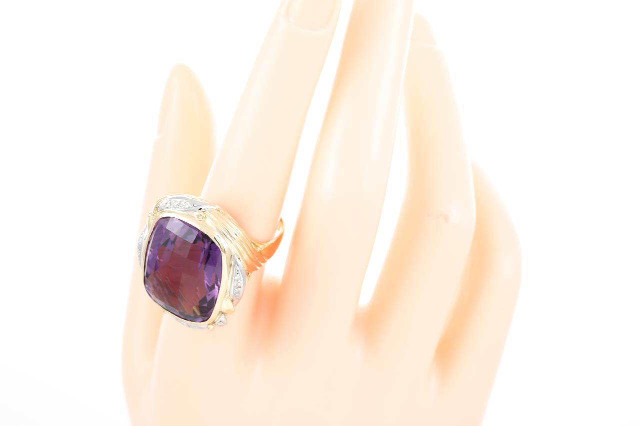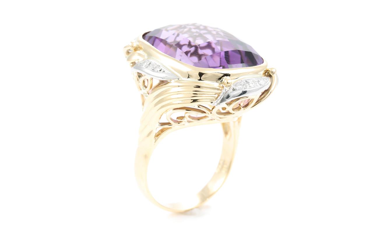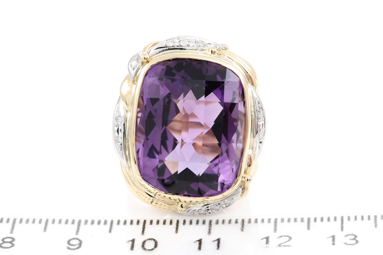 Amethyst ring with cushion cut Amethyst of 25.08cts and Diamonds totalling 0.10cts. 18ct yellow gold and platinum. Ring size: M1/2. Weight: 16.6g. (Pre-owned)