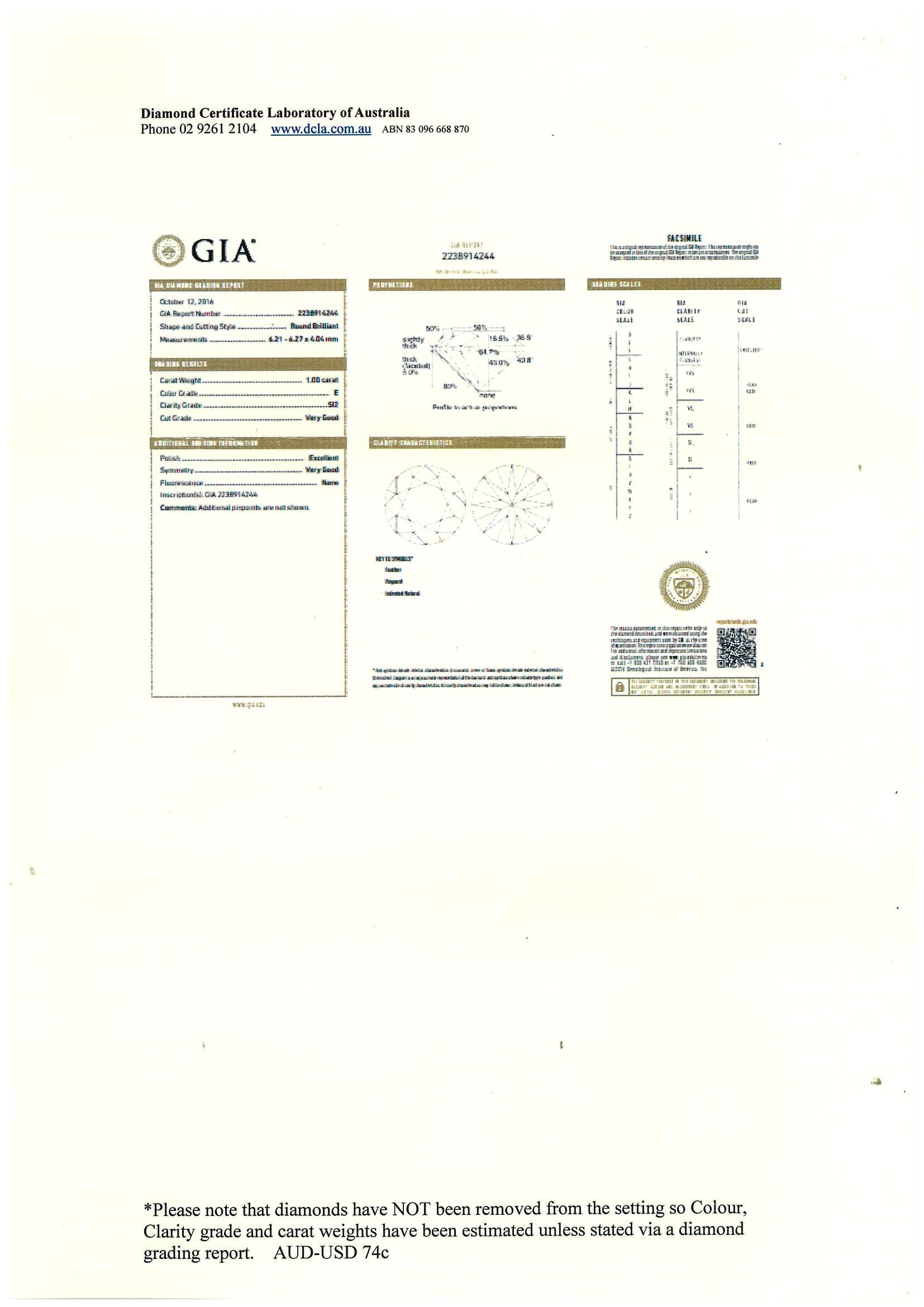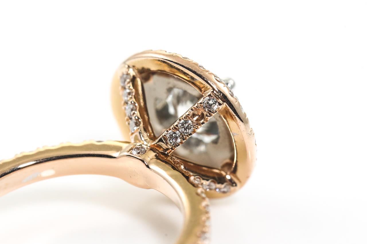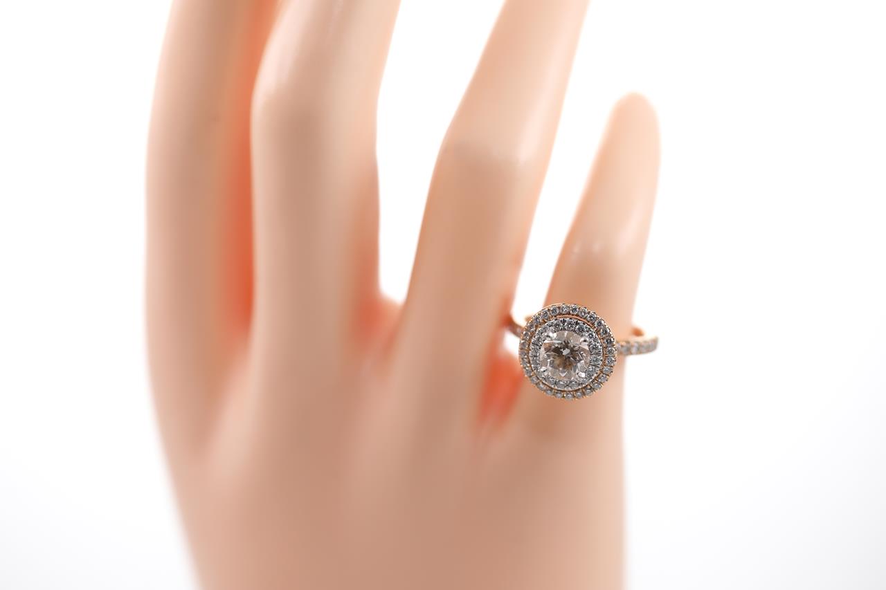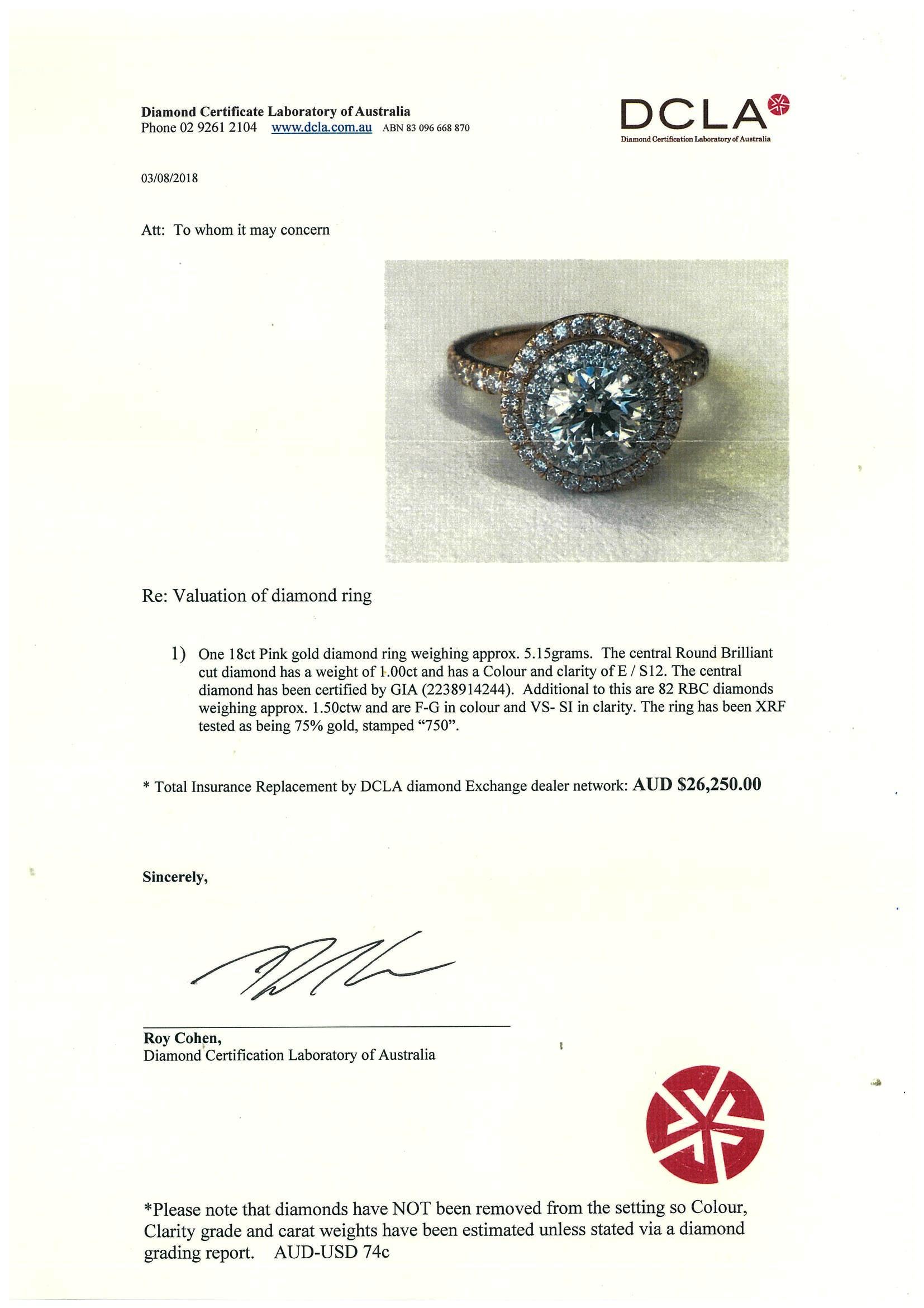 Diamond halo ring with centre round brilliant cut diamond of 1.00ct (With copy of GIA report graded as E SI2 #2238914244) and round Diamonds totalling approximately 1.50cts (Estimated grading G-SI - 1 Diamond missing). 18ct white and rose gold. Ring size I 1/2. Ring can be only resize up by 3 sizes. With DCLA valuation dated 03/08/2018. Weight 5.0g. (Pre-owned)