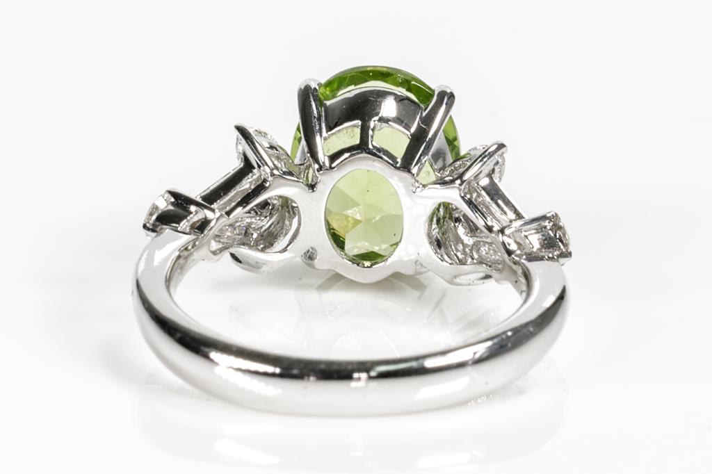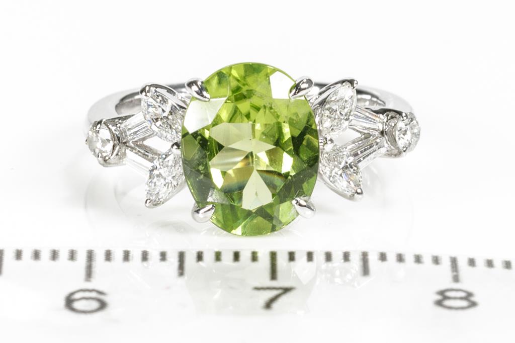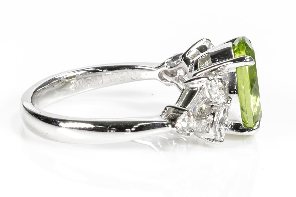 Peridot and Diamond ring with an oval shape Peridot of 2.50cts and round, baguette & marquise cut Diamonds totalling 0.48cts (Estimated grading: H-I SI-P1). 18ct white gold. Ring size: I - ring resizing is not recommended. Weight: 4.1g. (Pre-owned)