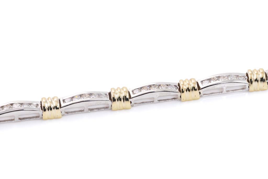 Diamond bracelet with 50 round Diamonds totalling approximately 2.50cts (Estimated grading J-K SI-P1). 14ct yellow and white gold. Length: 18cm. Weight: 15.3g. (Pre-owned)