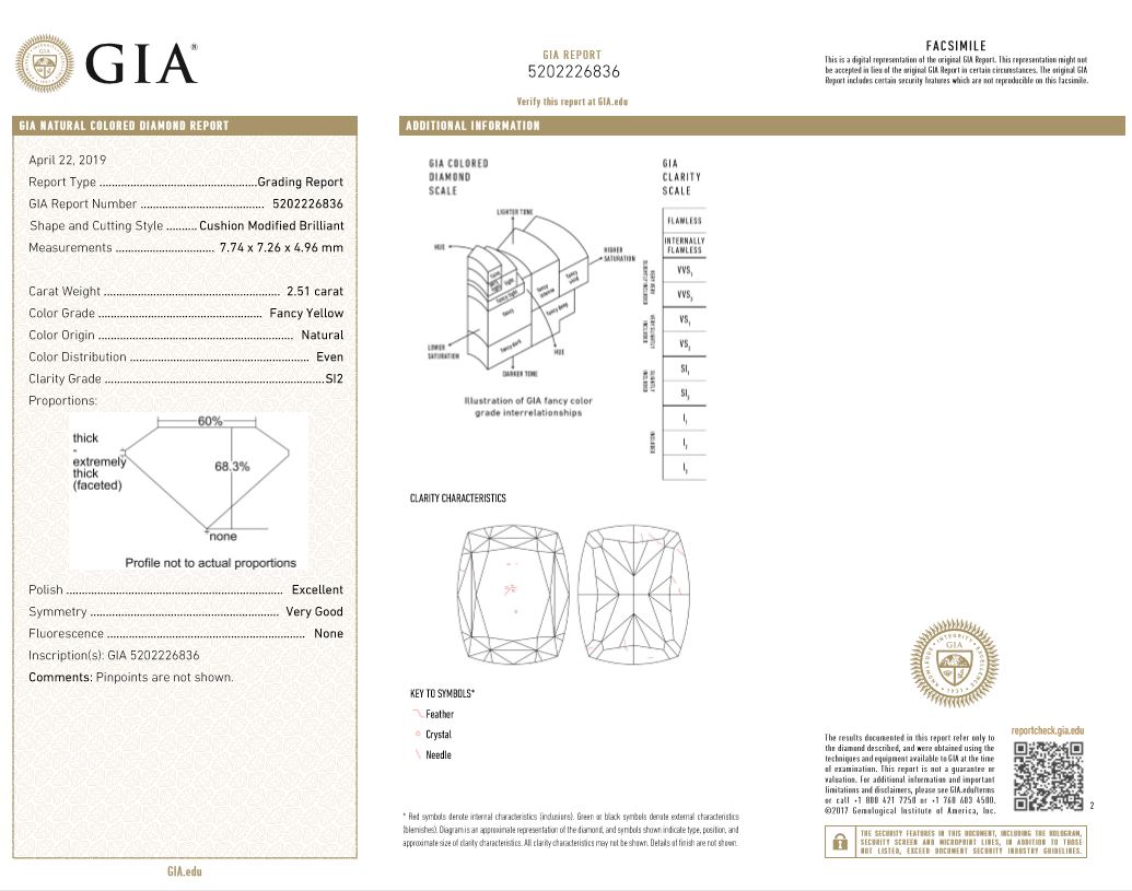 A loose Cushion Cut Diamond of 2.51ct (with GIA report graded as Natural Fancy Yellow Even SI2 #5202226836). (New)