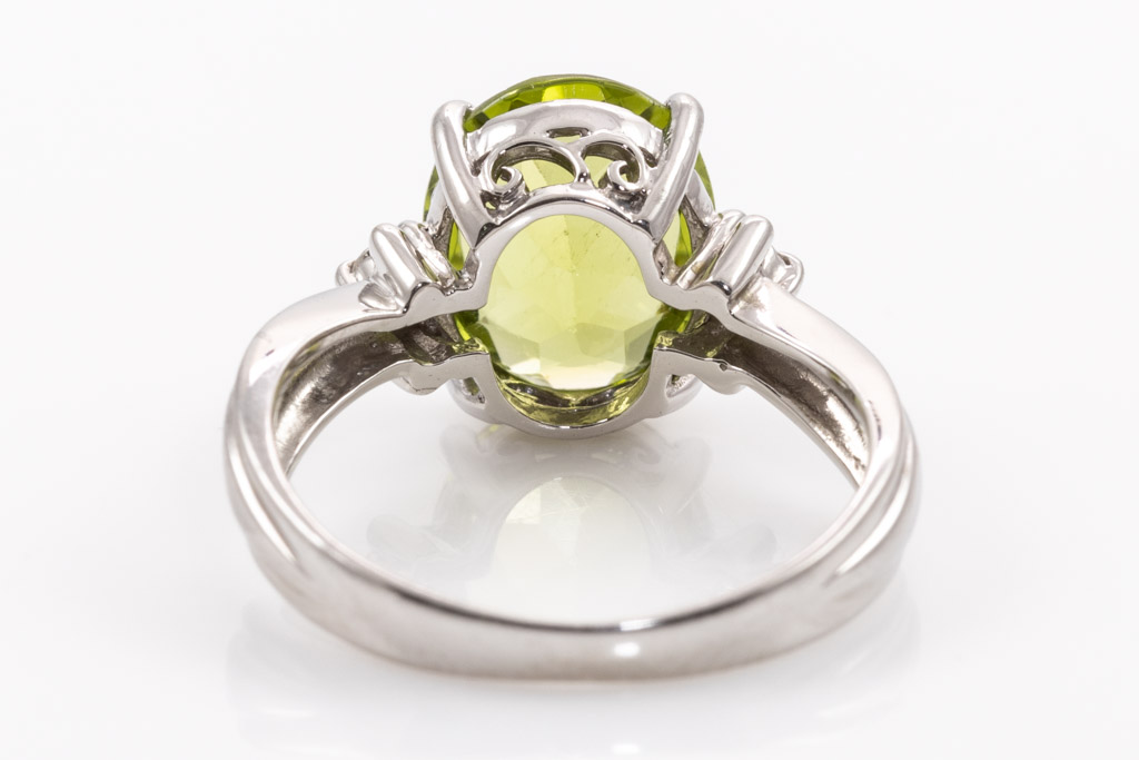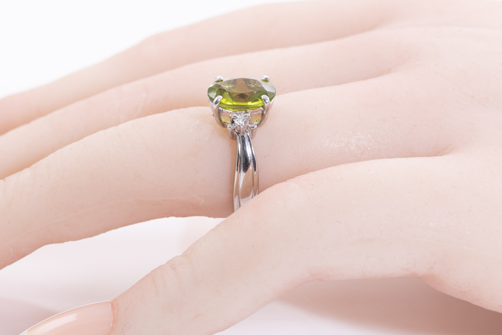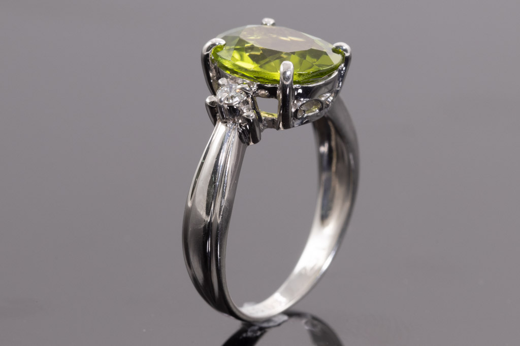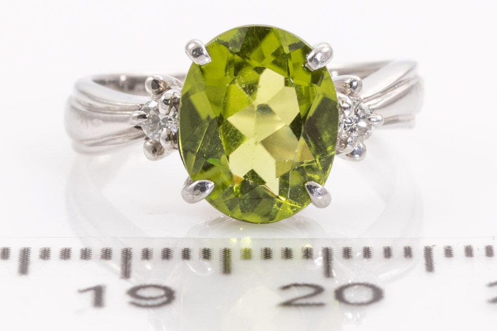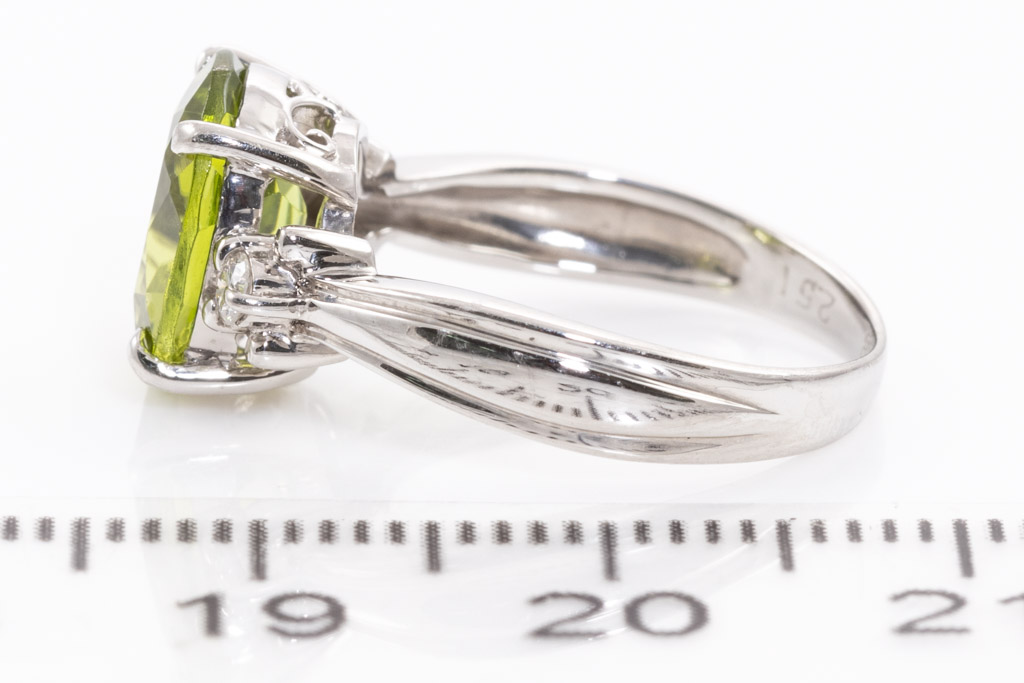 Peridot and Diamond ring with oval shape Peridot of 2.51ct and round Diamonds totalling 0.08cts. Platinum. Ring size I1/2. Weight: 4.3g. (Pre-owned)