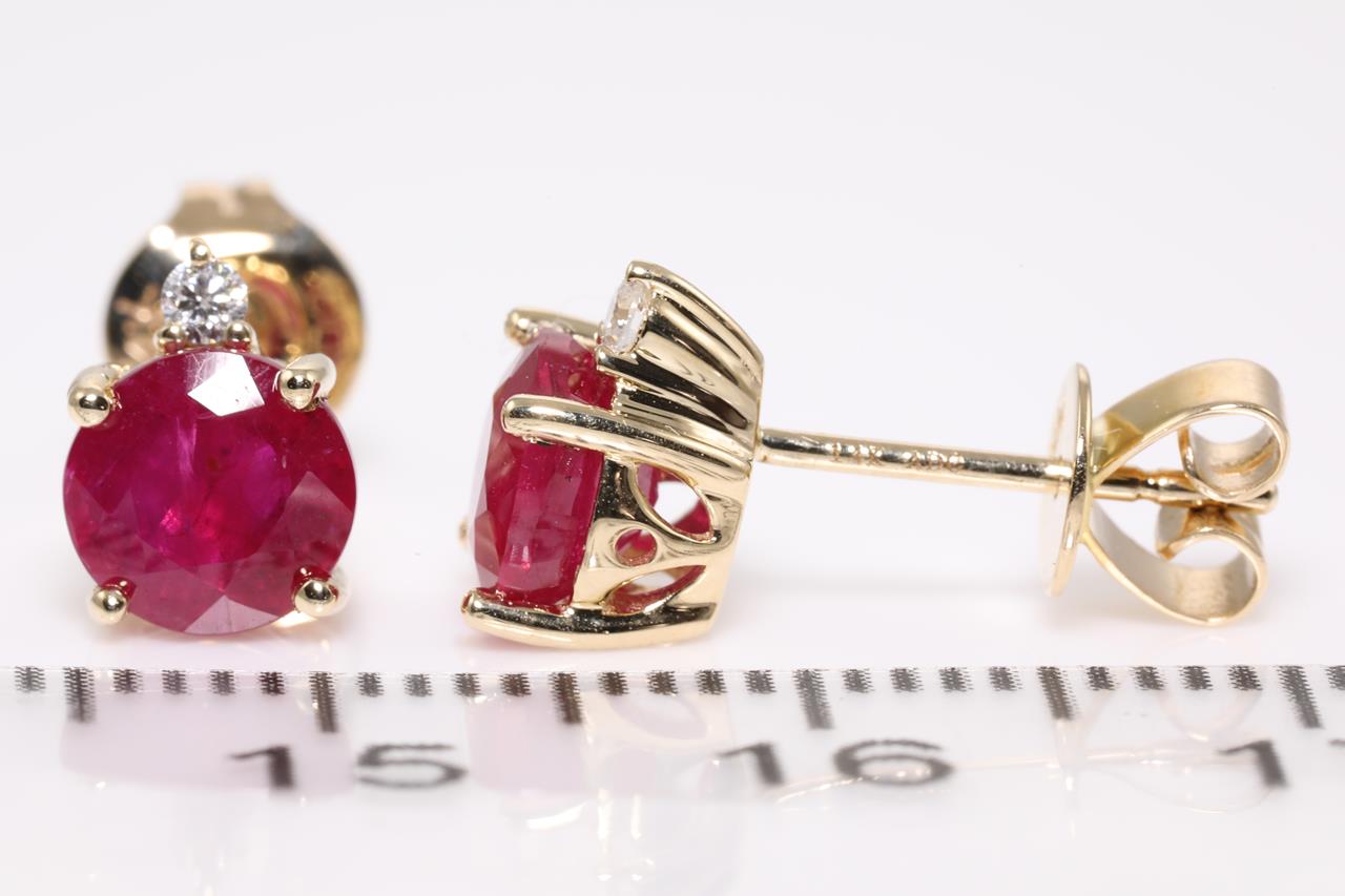 Ruby and Diamond earrings with round rubies totalling 2.52cts and Diamonds totalling 0.05cts. 14ct yellow gold. Weight: 2.6g. (As new)