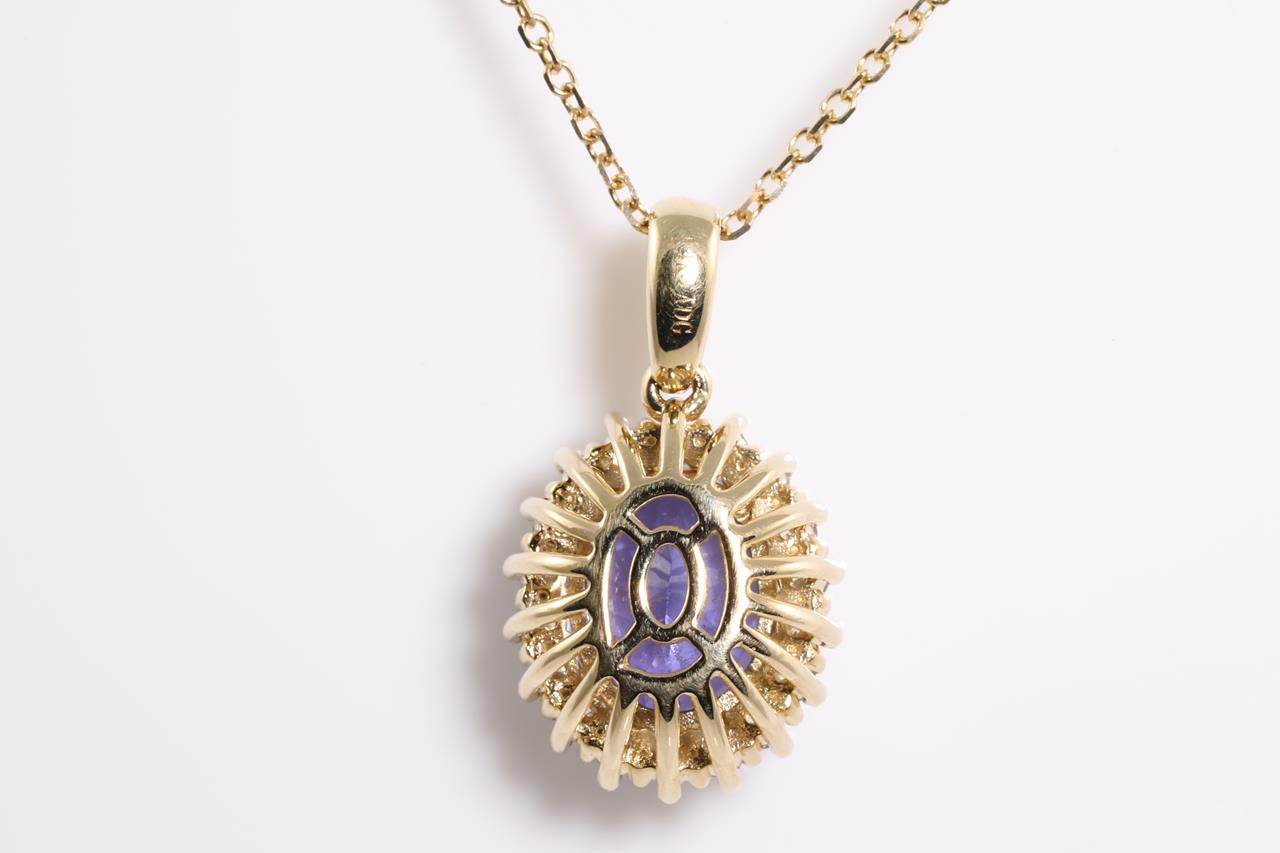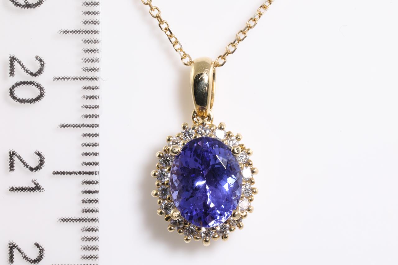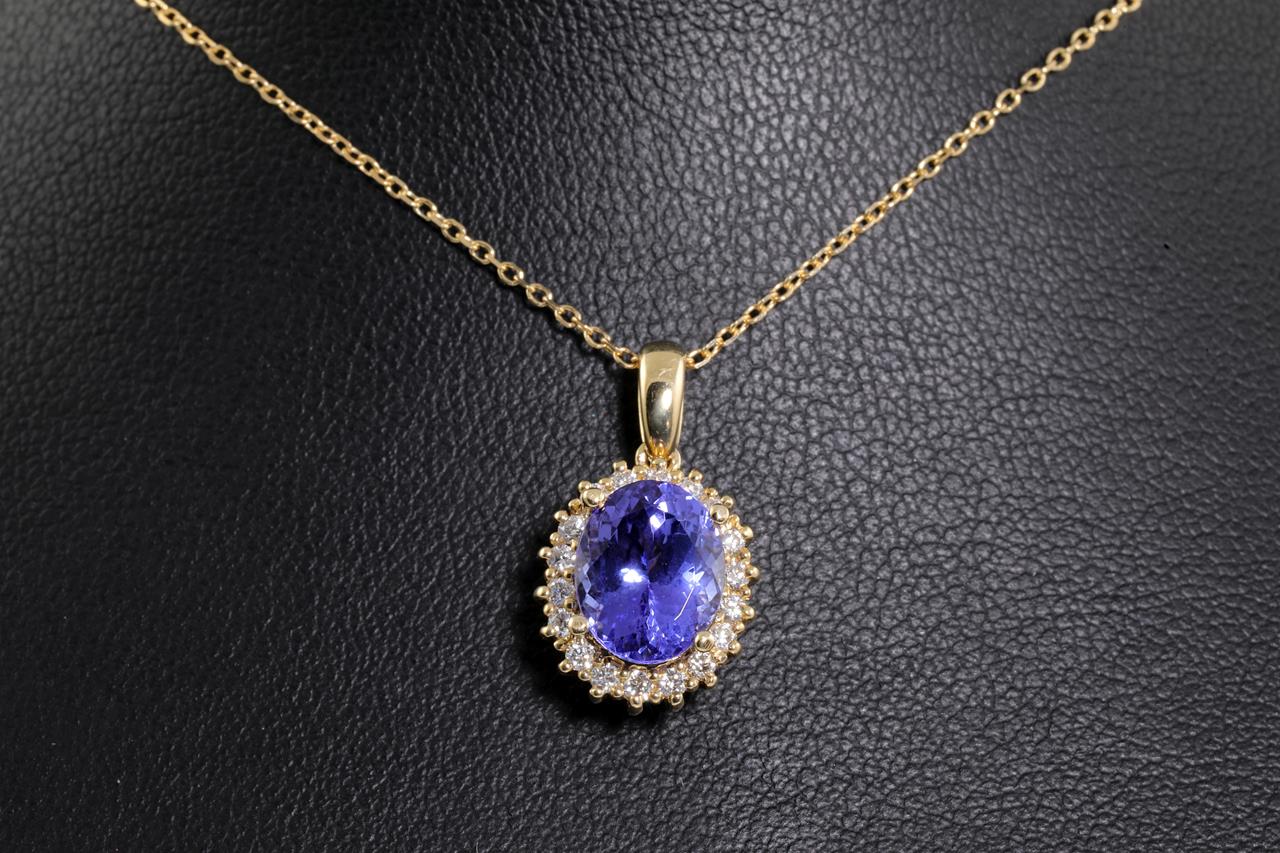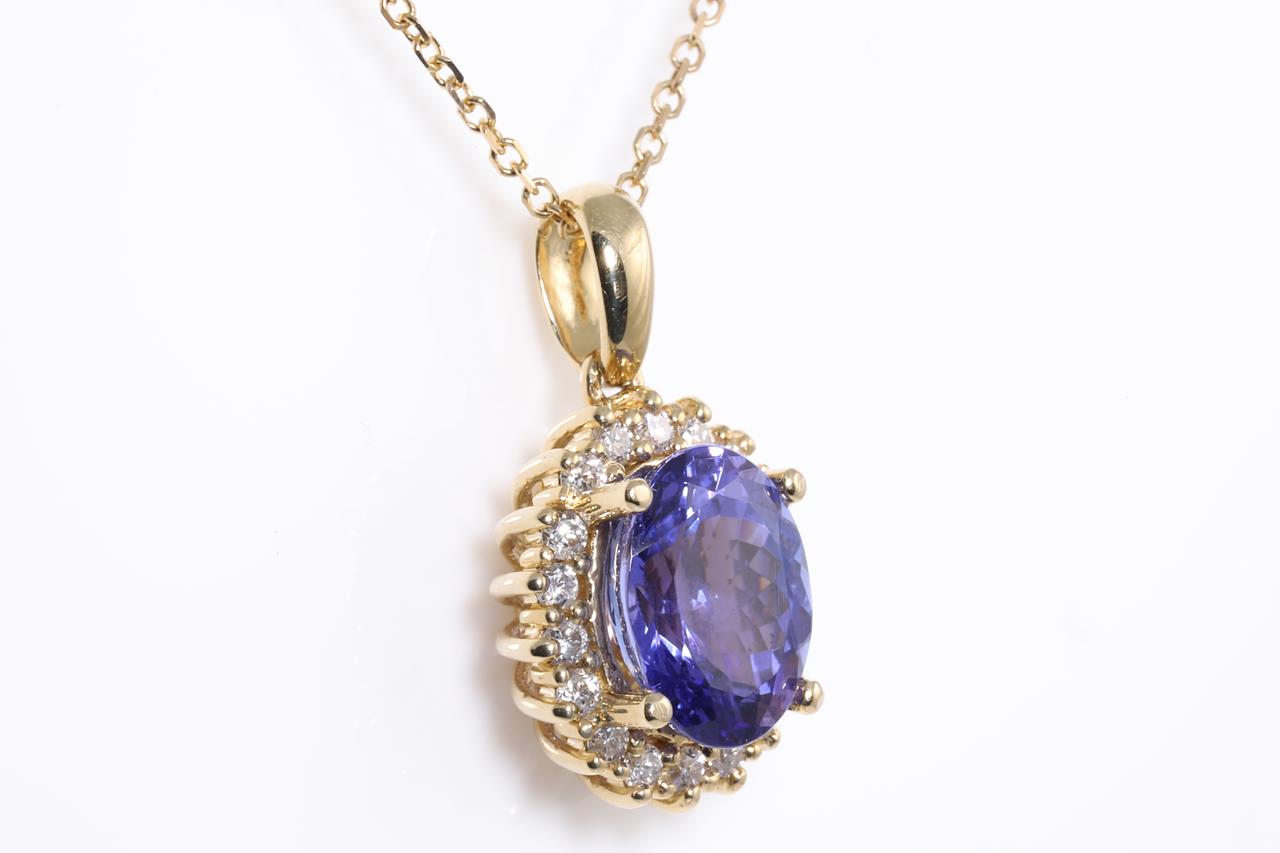 Tanzanite and Diamond pendant with an oval Tanzanite of 2.52ct and Diamonds totalling 0.25cts. 14ct yellow gold with 45cm chain. Weight: 3.7g. (As new)