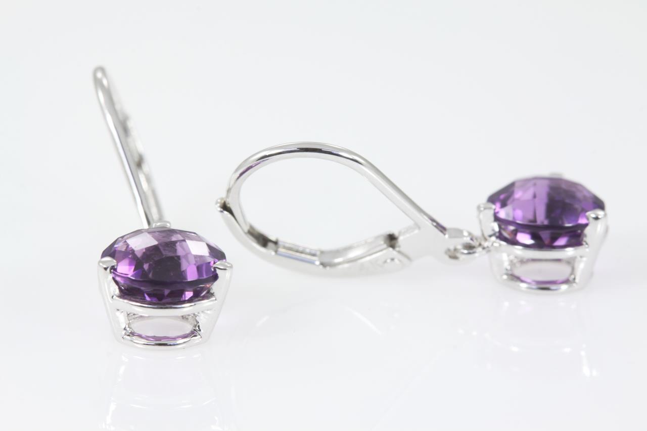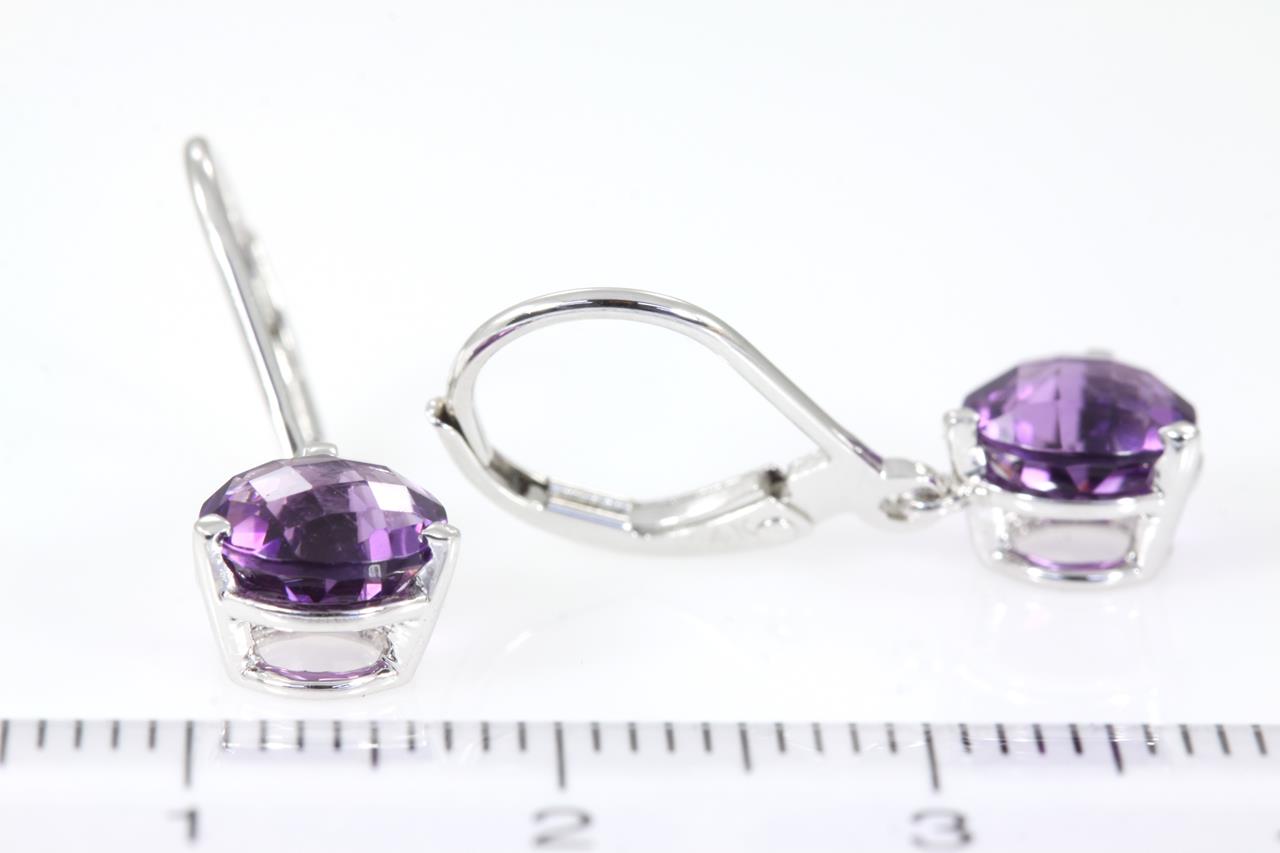 Amethyst leverback earrings with round checkerboard cut Amethysts totalling 2.53cts. 14ct white gold. (New)