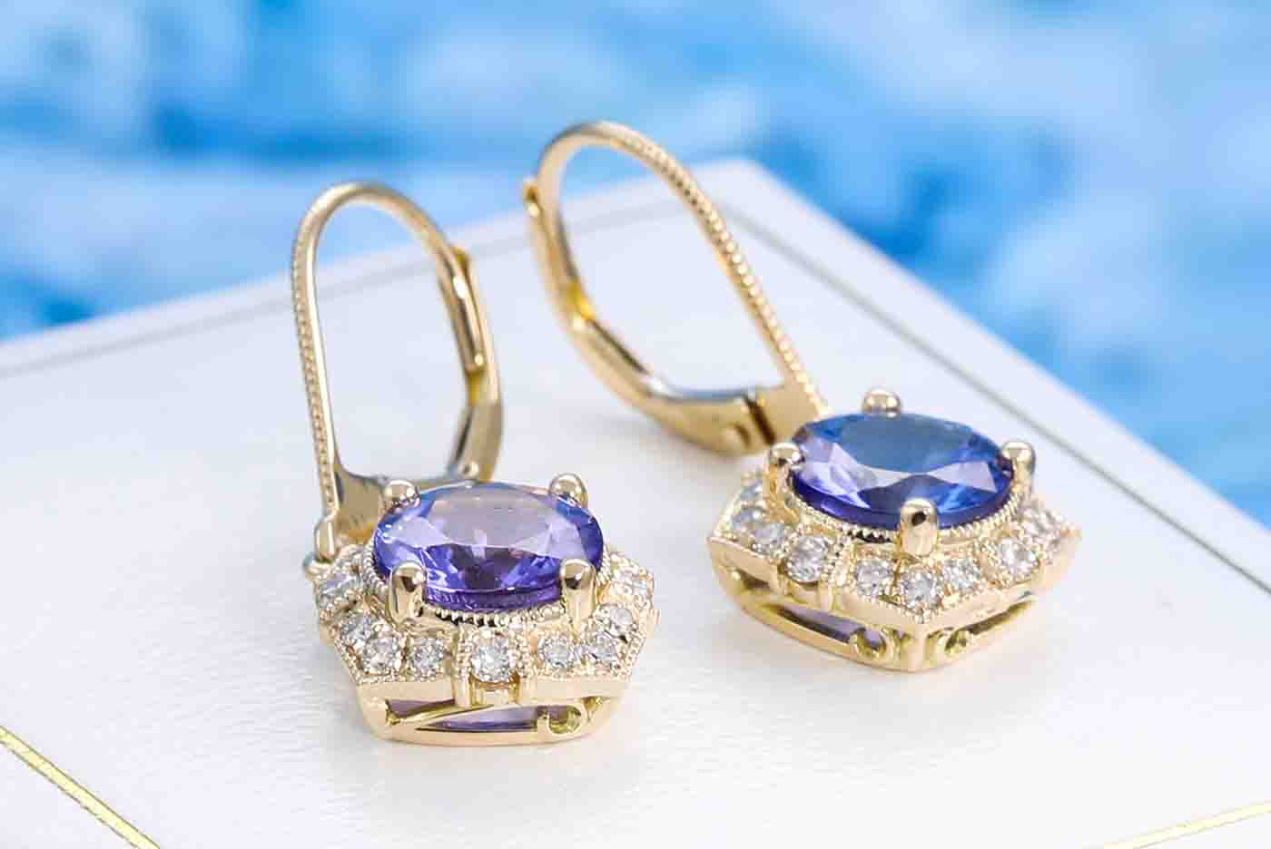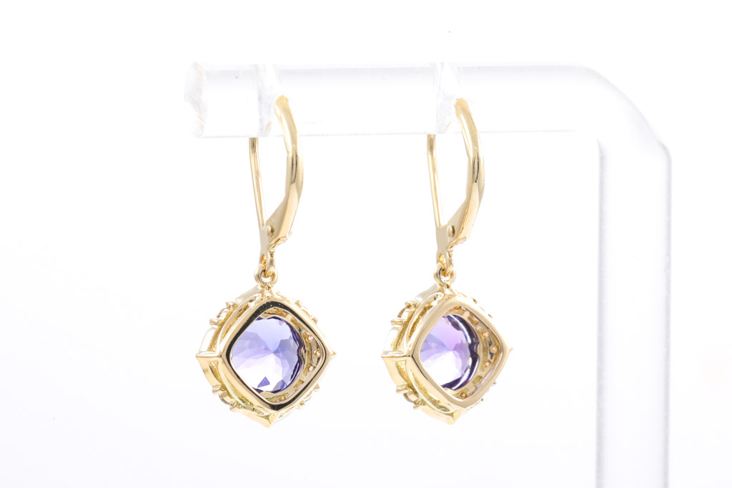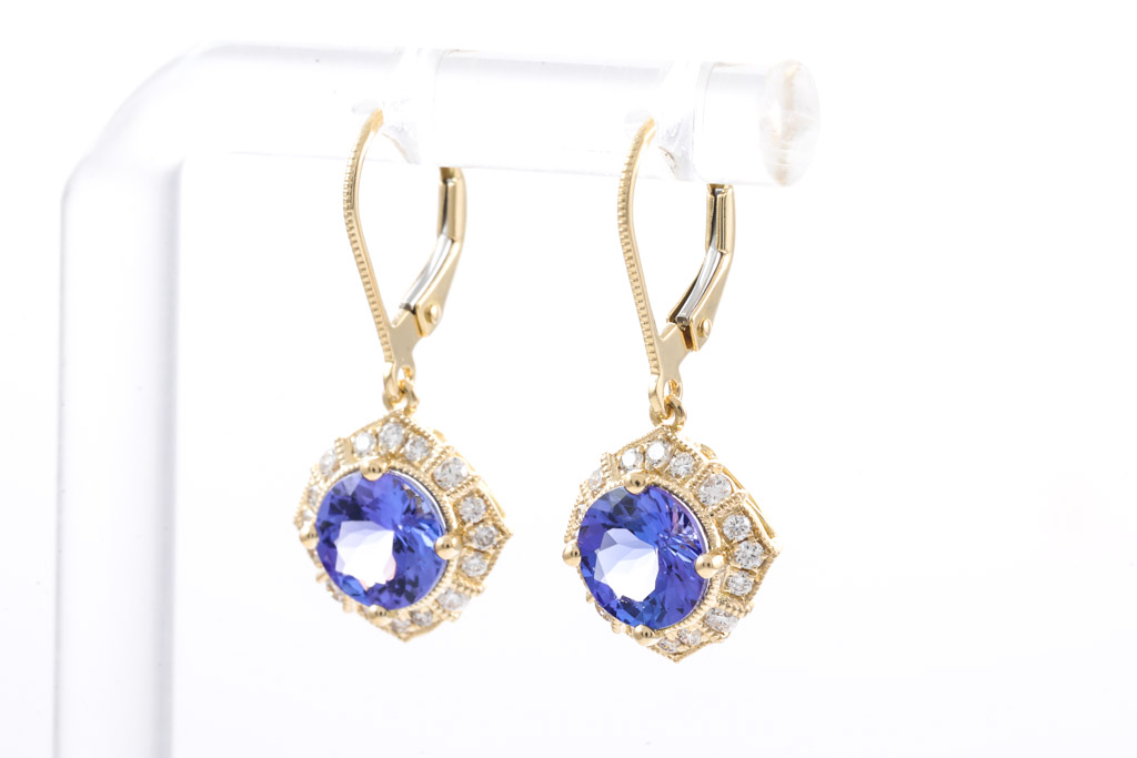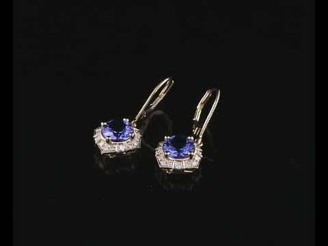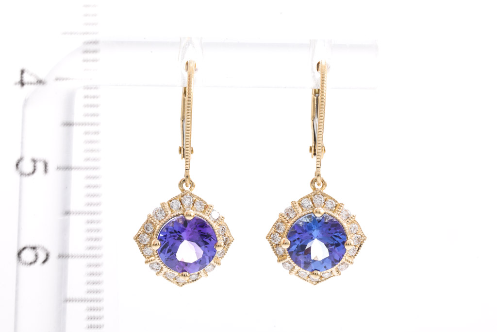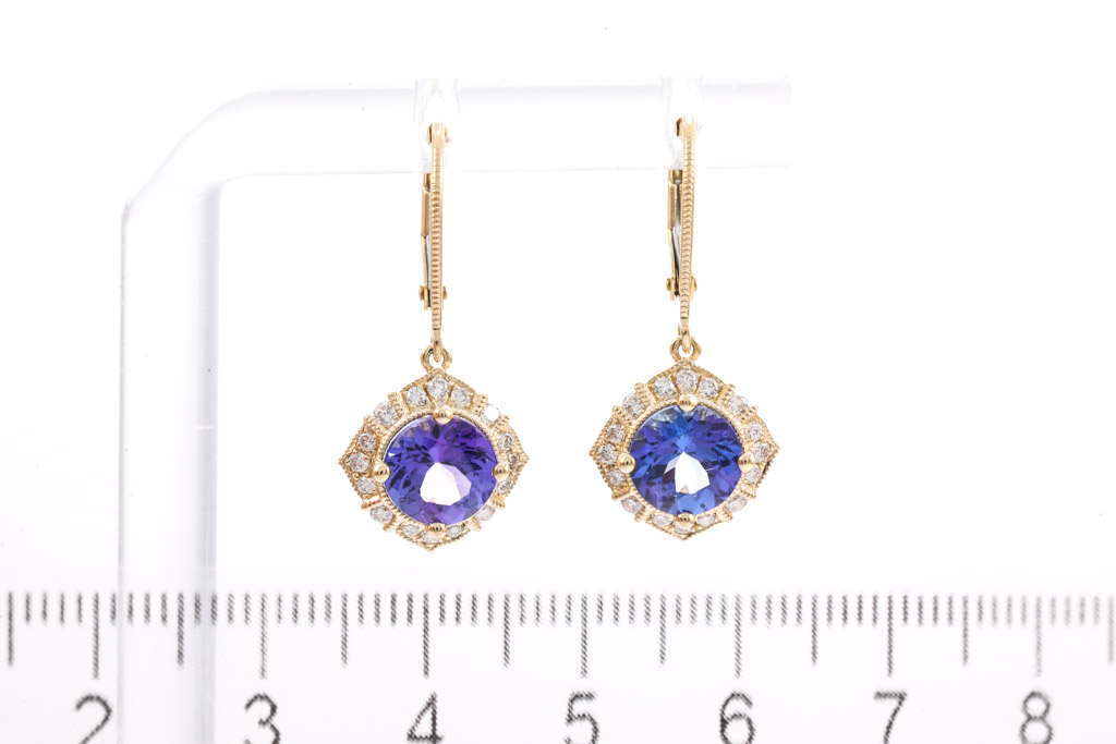 Tanzanite and Diamond lever back earrings with round cut Tanzanite totalling 2.53cts and round Diamonds totalling 0.36cts (Estimated grading: I SI). 18ct yellow gold. Weight: 4.2g. (New)