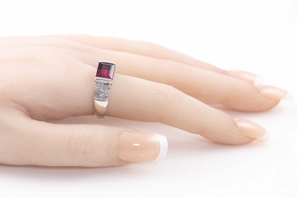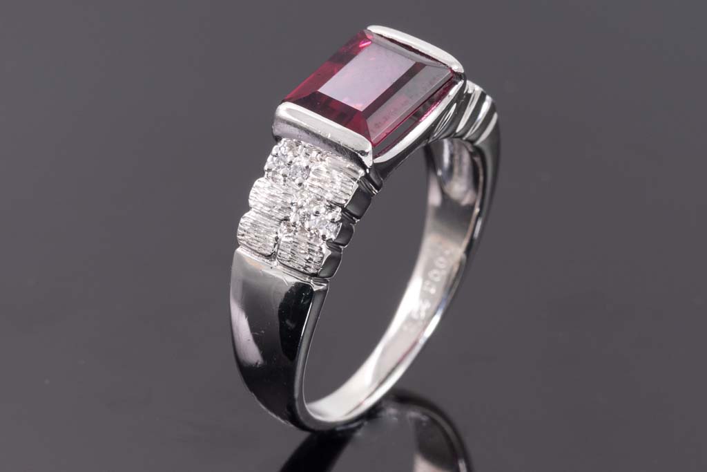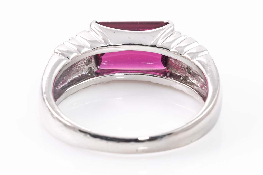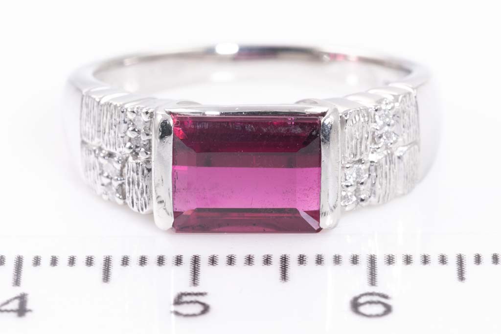 Tourmaline and Diamond ring with emerald cut pink Tourmaline of 2.54ct and round Diamonds totalling 0.07cts. Platinum-900. Ring size Q1/2 - ring resizing is not recommended. Weight: 9.8g. (Pre-owned)