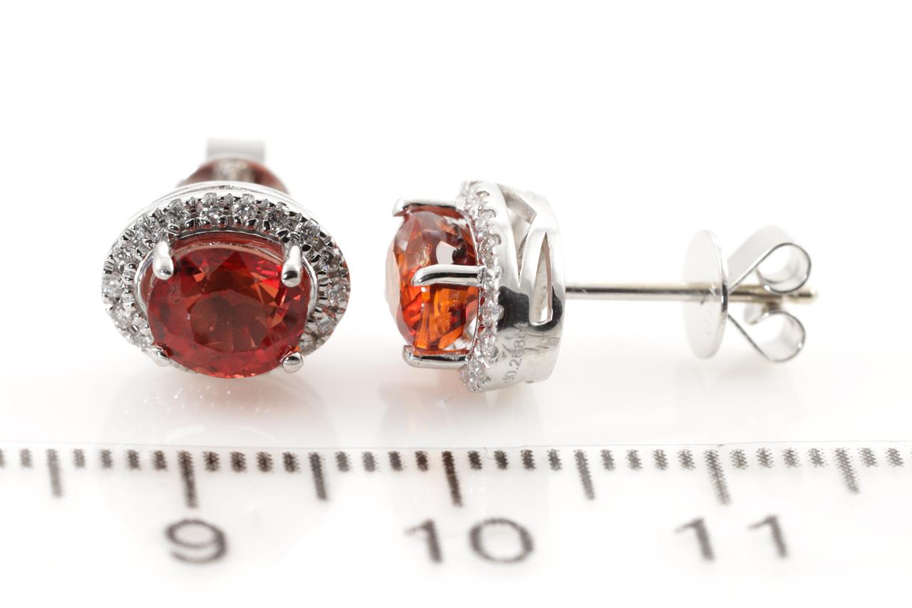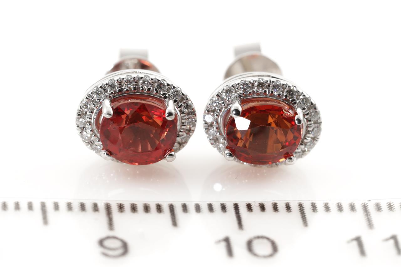 Sapphire and Diamond earrings with oval orangy red Sapphires totalling 2.54cts and Diamonds totalling approximately 0.15cts. 18ct white gold. Weight: 2.8g (Pre-owned)
