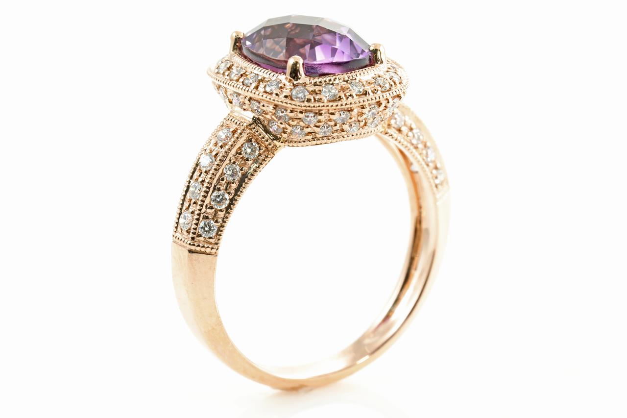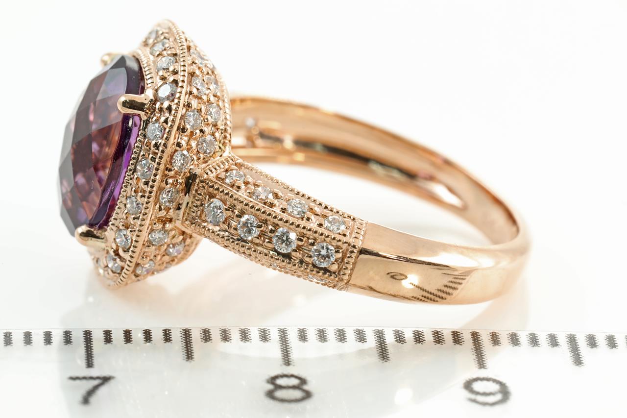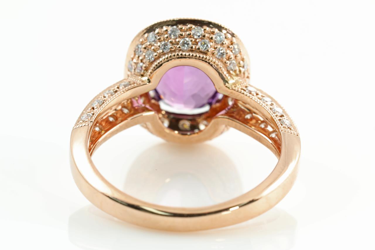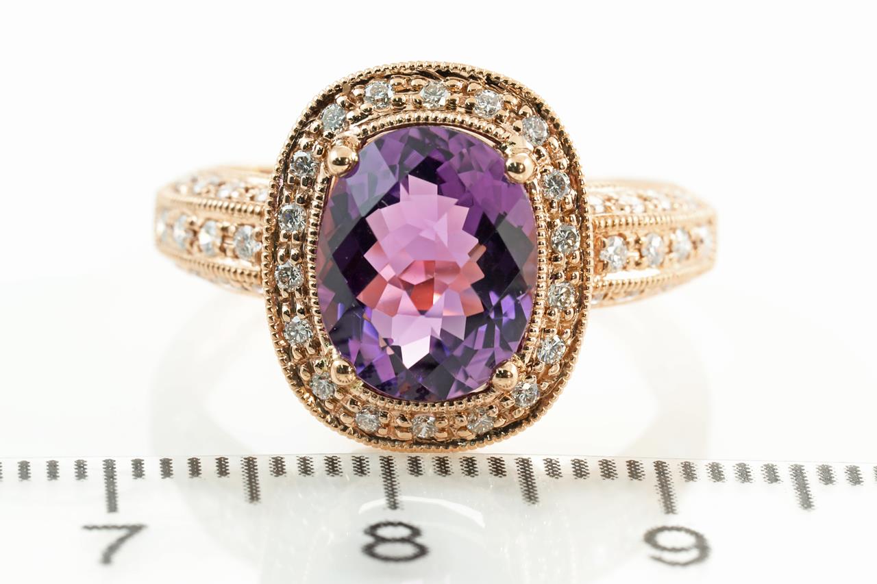 Amethyst and Diamond ring with oval shape Amethyst of 2.55ct and Diamonds totalling 0.55cts (Estimated grading: H SI) 9ct Rose gold. Ring size N1/2. Weight: 4g (New)