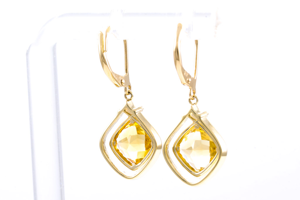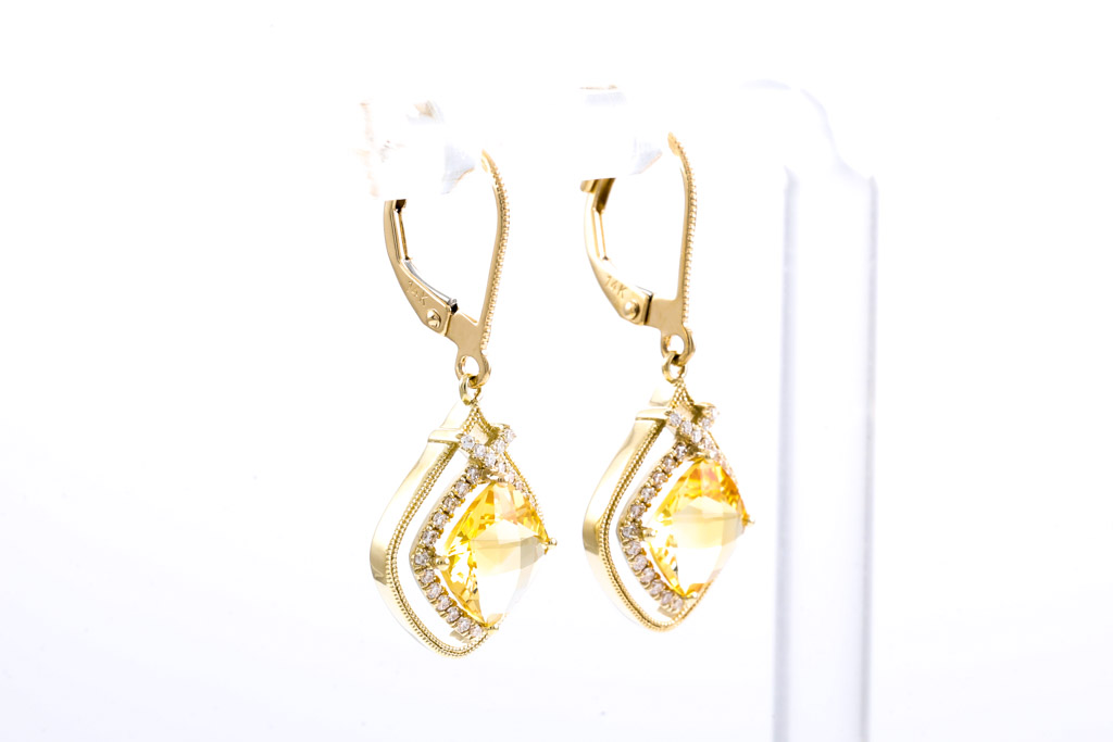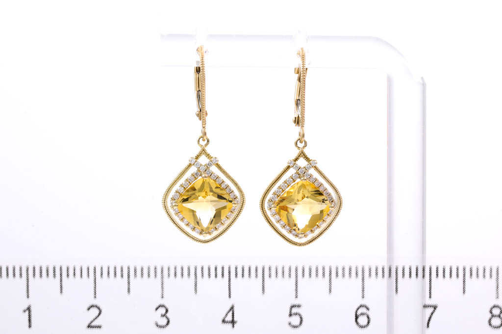 Citrine and Diamond leverback earrings with cushion cut Citrines totalling 2.56cts and round Diamonds totalling 0.24cts. 14ct yellow gold. Weight: 3.4g. (New)