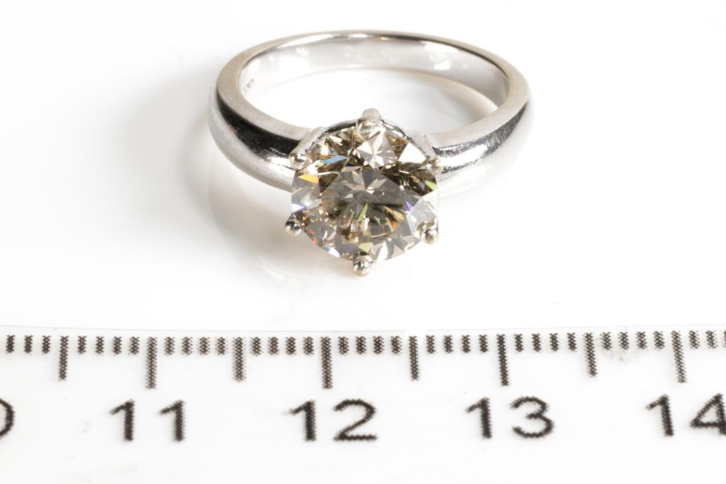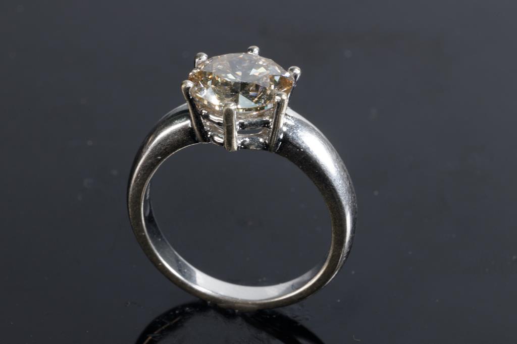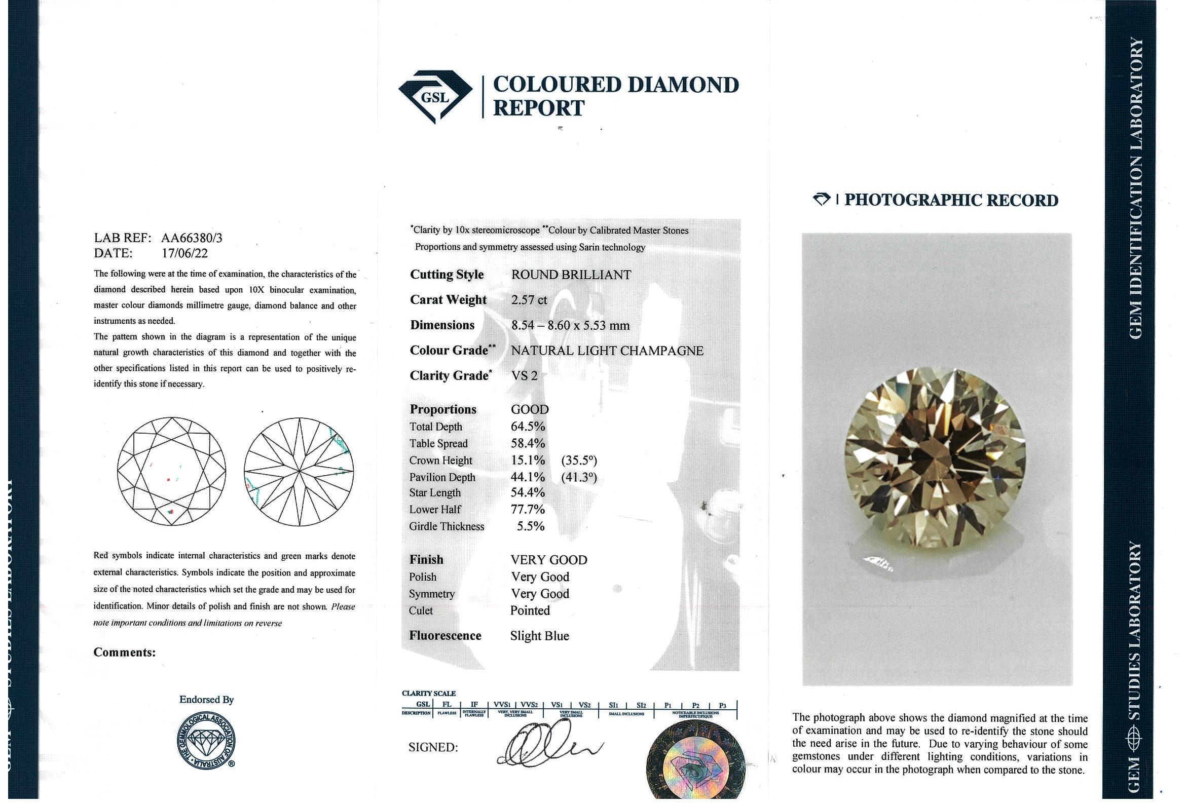 Diamond Solitaire Ring with round brilliant cut Diamond of 2.57ct (with GSL report graded as Natural light Champagne VS2 #AA66380/3). 18ct white gold. Ring size K. Weight 5.4g. (Pre-owned)