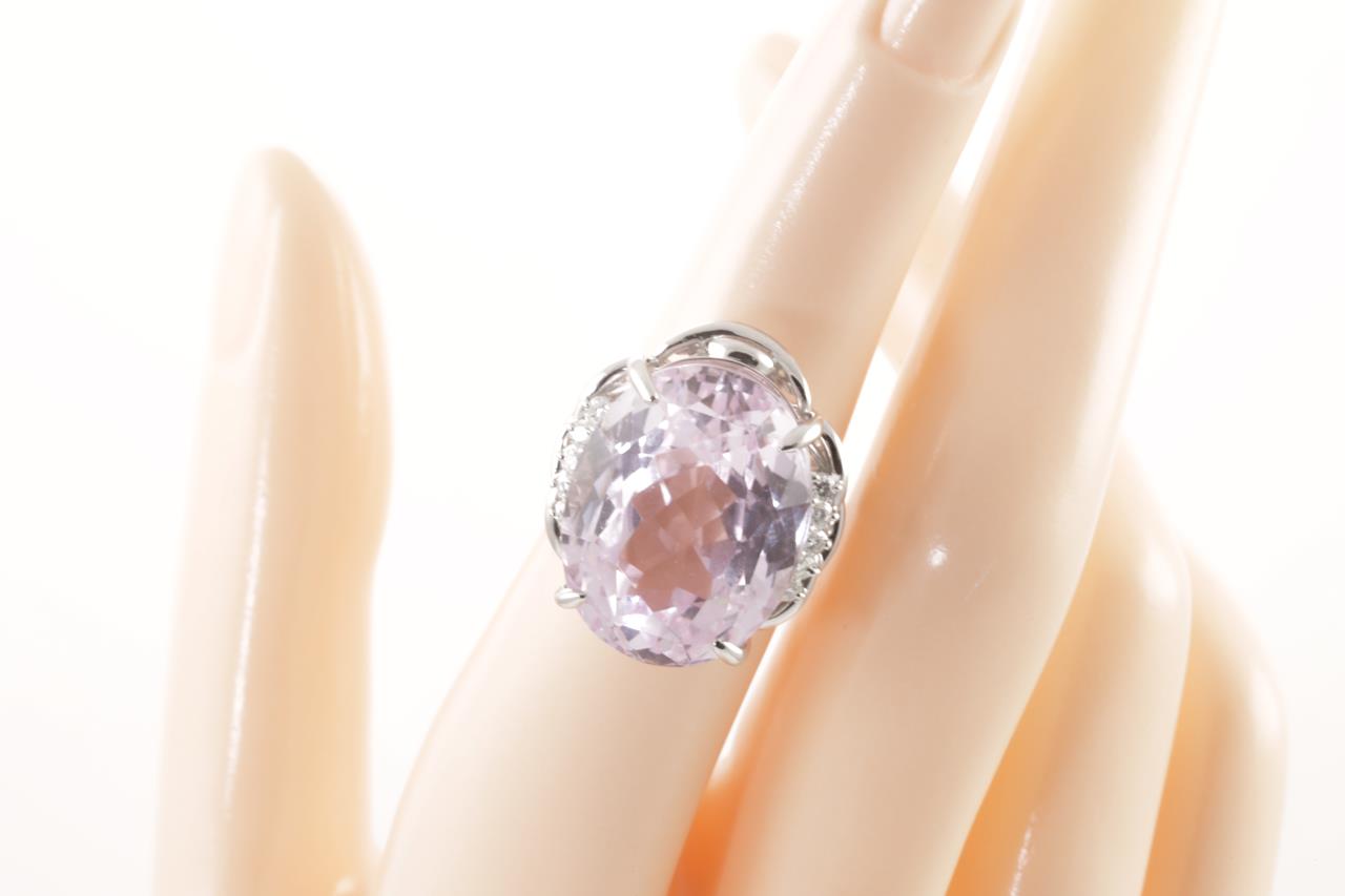 Kunzite and Diamond ring with oval Kunzite of 25.81ct and round Diamonds totalling 0.22cts. Platinum. Weight: 15.8g. Ring size L. (Pre-owned)