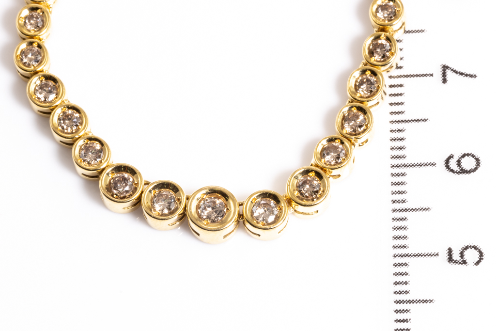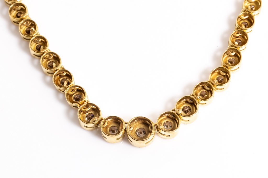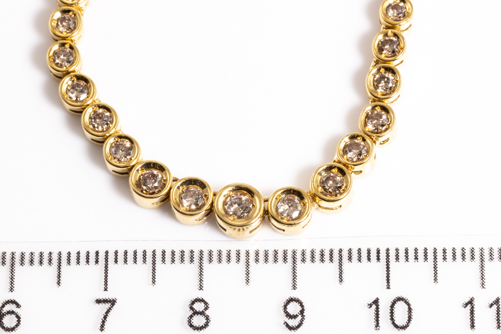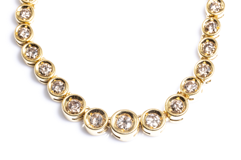 Diamond tennis necklace with 104 graduated round Diamonds totalling 2.58cts (Estimated grading: Champagne SI). 18ct yellow gold. Length: 45.cm. Weight: 19.8g. (Pre-owned)