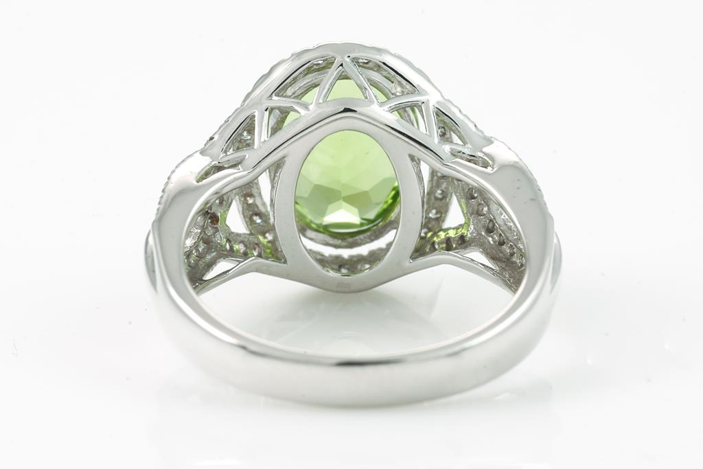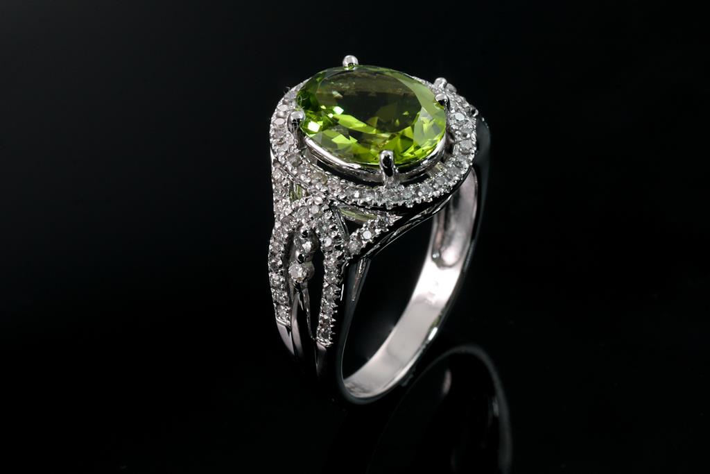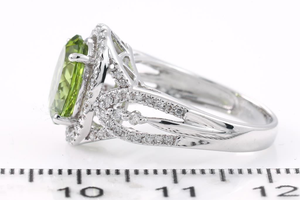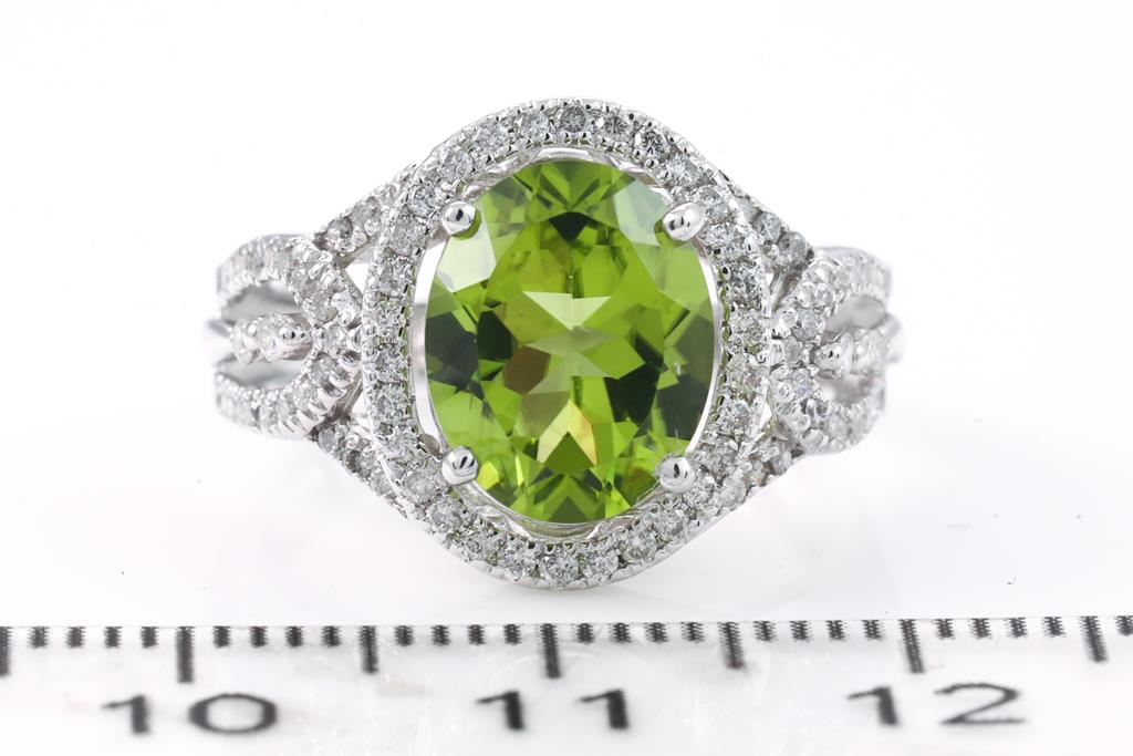 Peridot and Diamond ring with oval Peridot of 2.59ct and round Diamonds totalling 0.40cts (Estimated grading: I-J P1-2). 18ct white gold. Ring size K - ring resizing is not recommended. Weight: 4.1g. (Pre-owned)