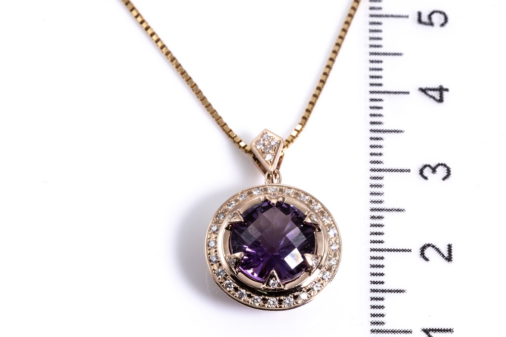 Amethyst and Diamond pendant with round checkerboard cut Amethyst of approximately 2.60ct and round Diamonds totalling 0.20cts. 18ct rose gold with adjustable 44cm 18ct yellow gold chain. Weight: 7.9g. (Pre-owned)