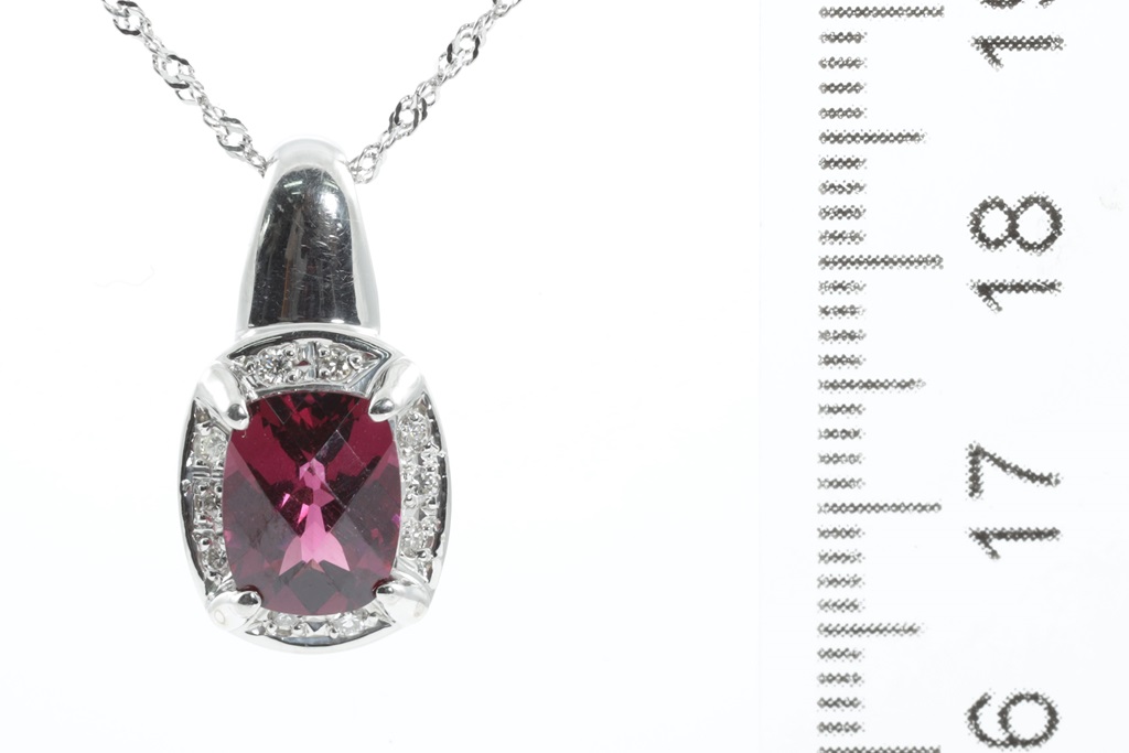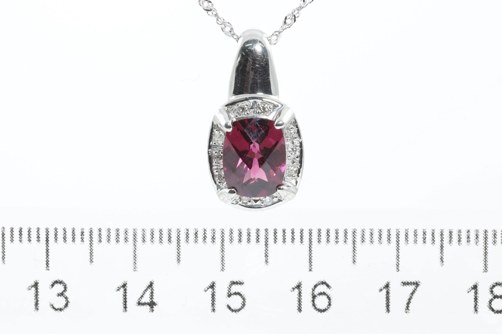 Garnet and Diamond pendant with a cushion checkerboad cut red Garnet of 2.60ct and Diamonds totalling 0.10cts. Platinum with adjustable 44cm chain. Weight: 4.7g. (Pre-owned)