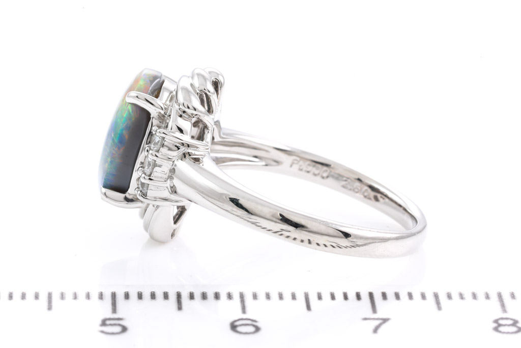 Black Opal and Diamond ring with cabochon cut solid Black Opal of 2.60ct and round Diamonds totalling 0.15cts. Platinum. Ring size O. Weight: 9.1g. (Pre-owned)