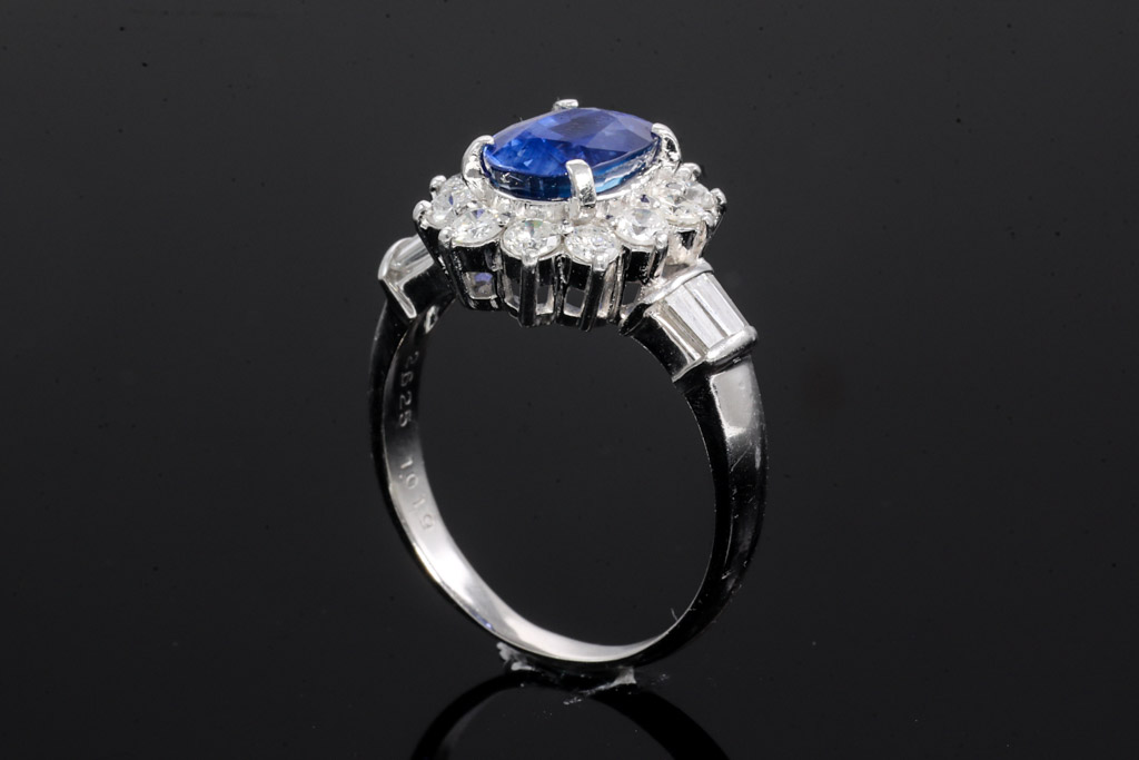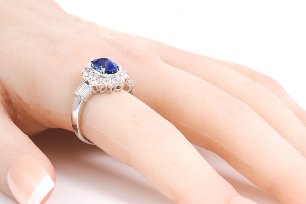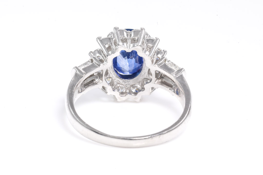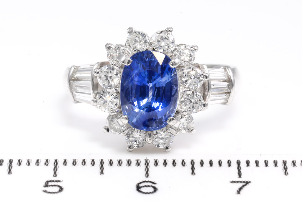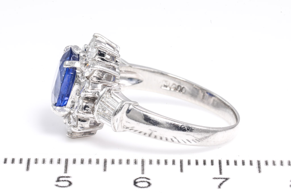 Sapphire and Diamond ring with oval shape blue Sapphire of 2.62ct and round & baguette cut Diamonds totalling 1.01cts (Estimated grading: H-I SI). Platinum. Ring size O - ring resizing is not recommended. Weight 7.4g. With certificate #416712. (Pre-owned)