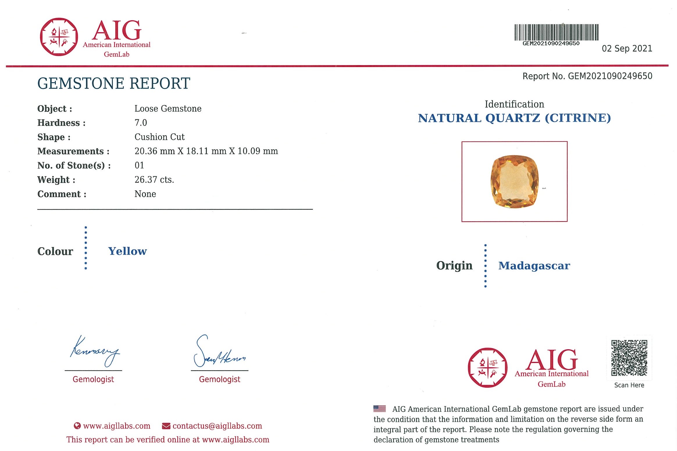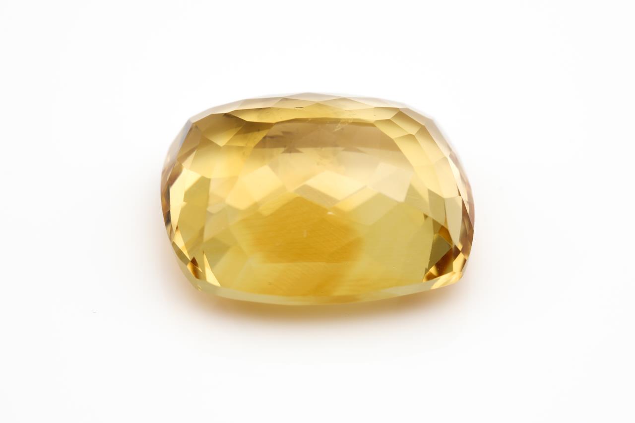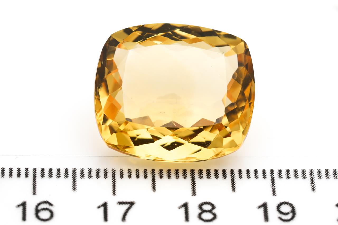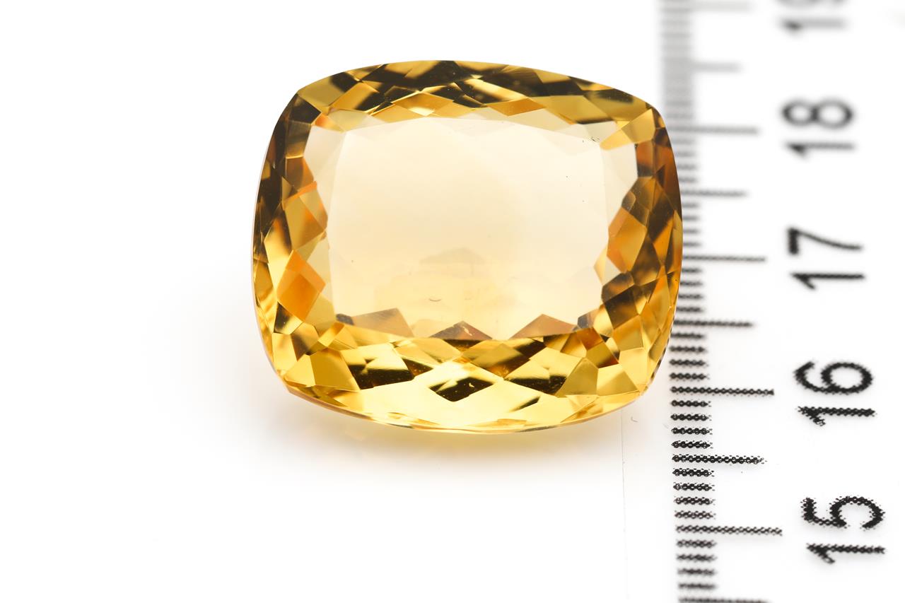 A loose cushion cut Citrine of 26.37ct. Dimensions 20.36 x 18.11 x 10.09mm. With AIG report #GEM2021090249650. (As New)