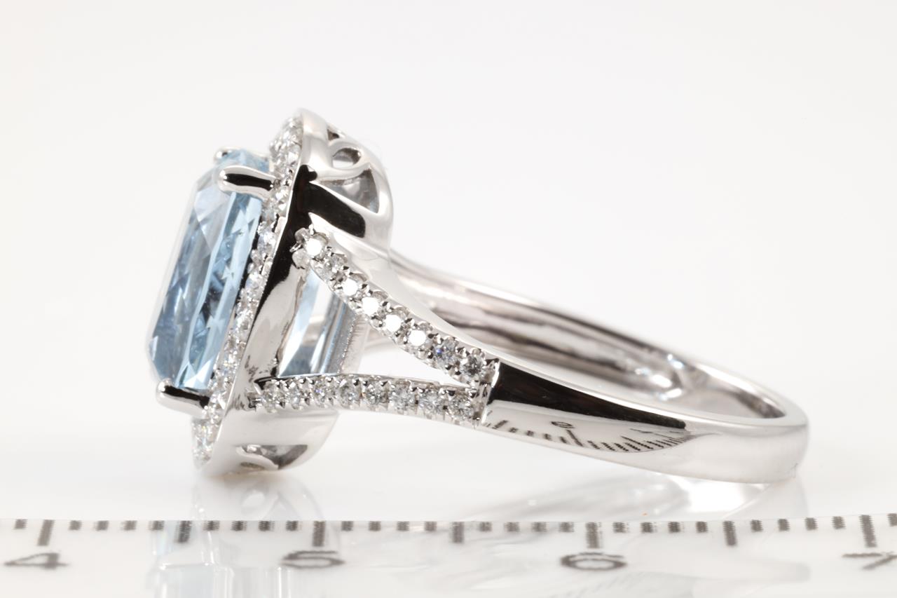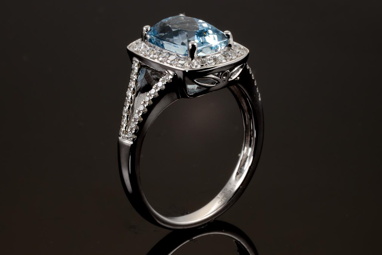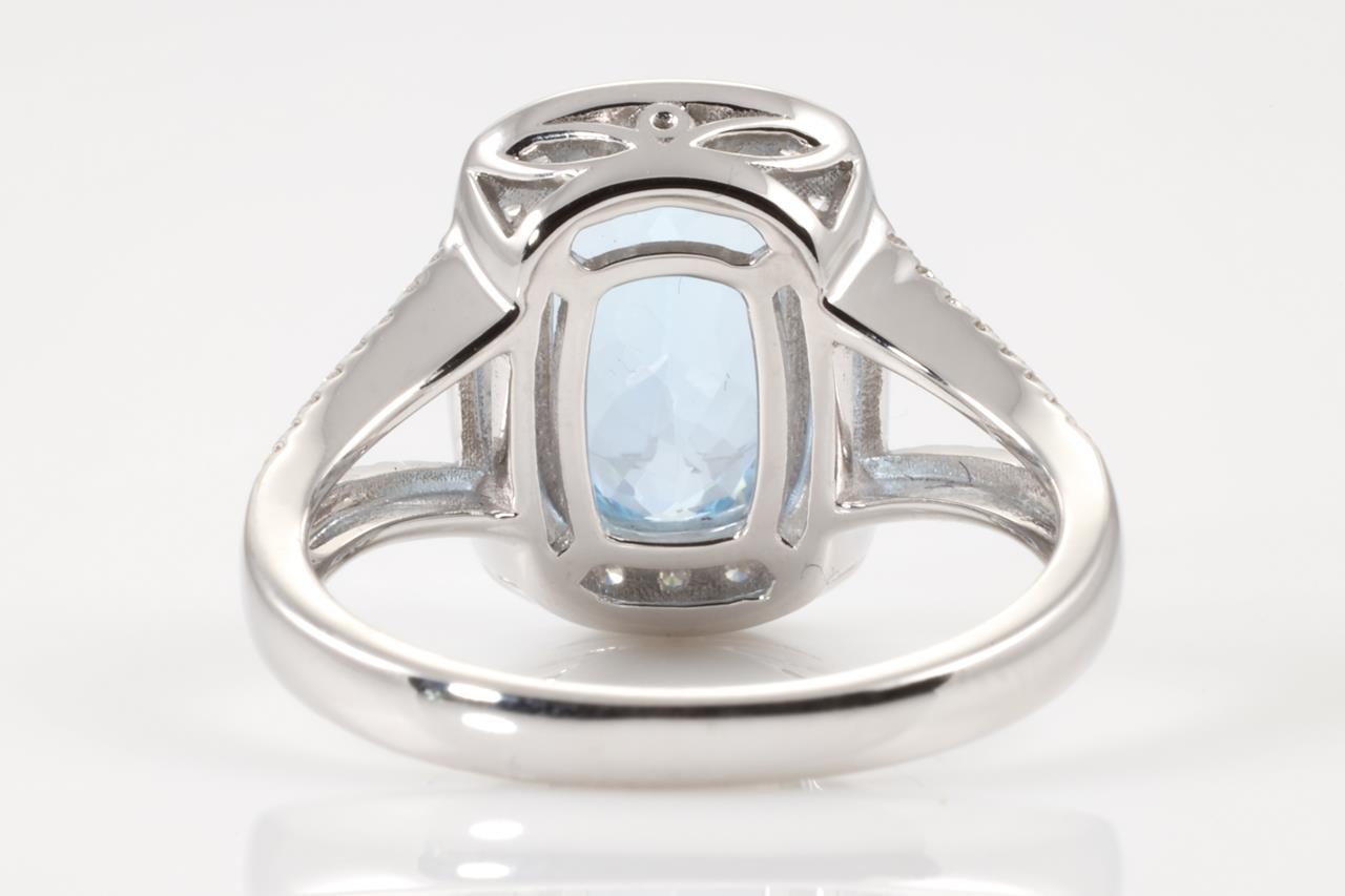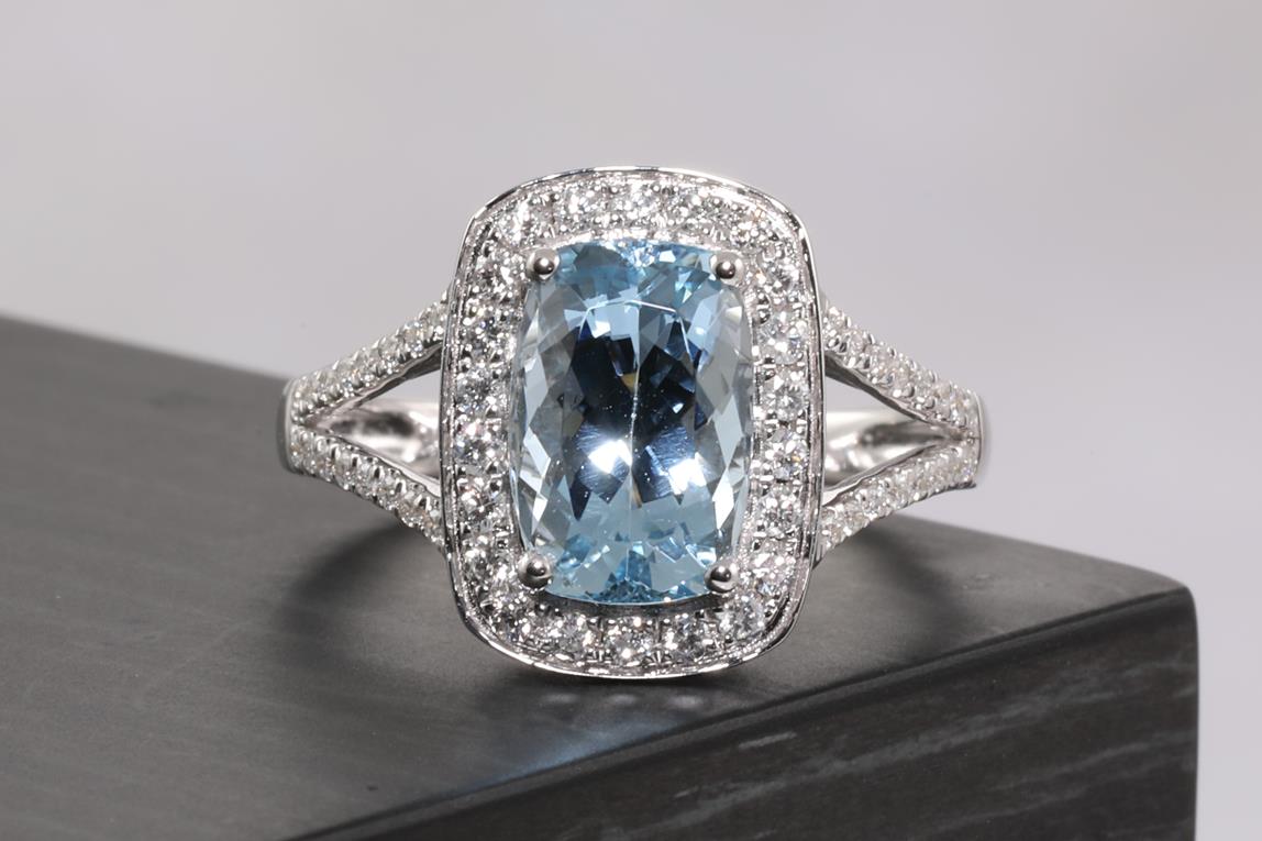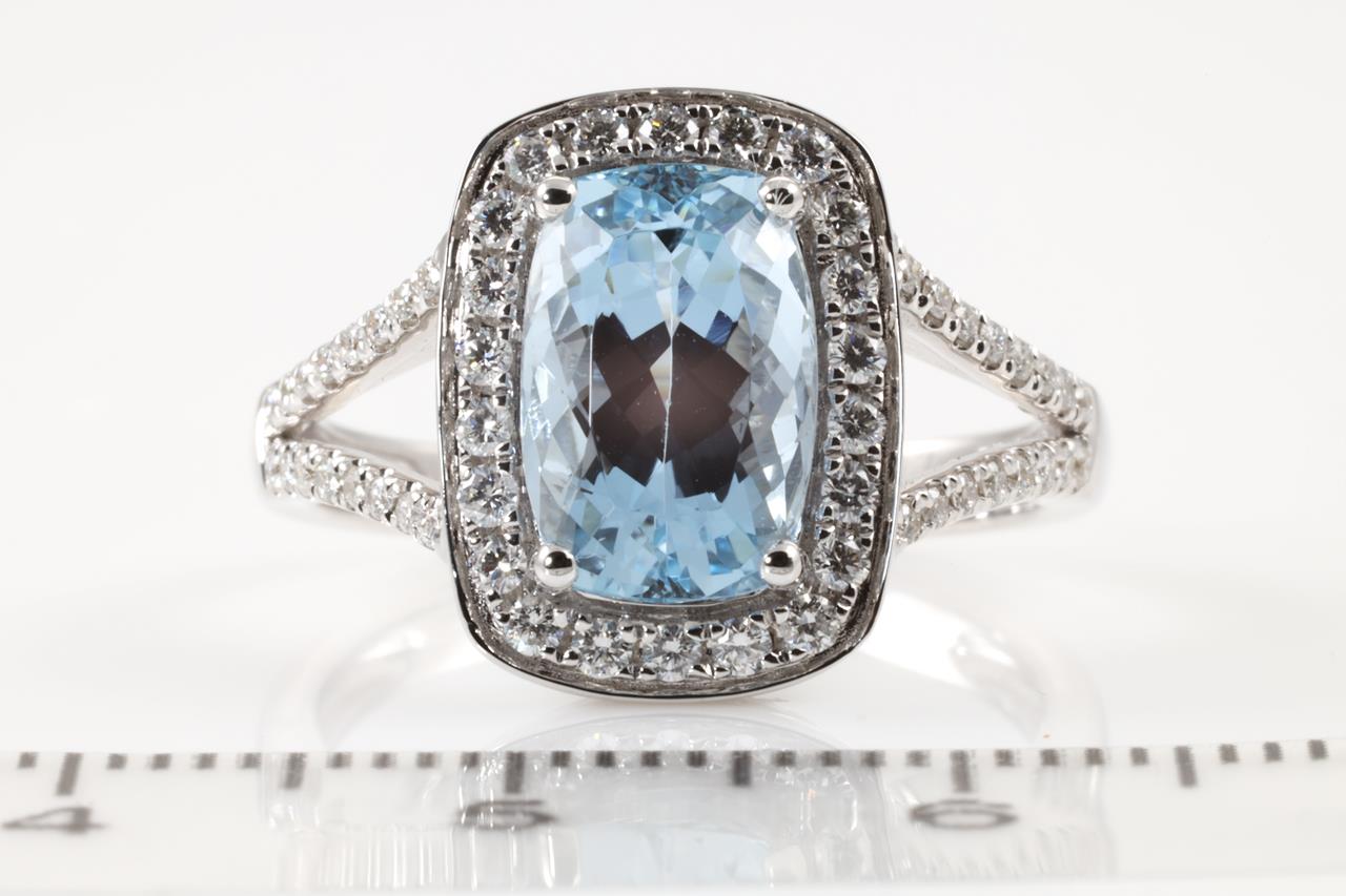 Aquamarine and Diamond ring with a cushion cut Aquamarine of 2.63ct and Diamonds totalling 0.38cts (Estimated grading: H SI). 14ct white gold. Ring size N. Weight: 4.6g. (As new)