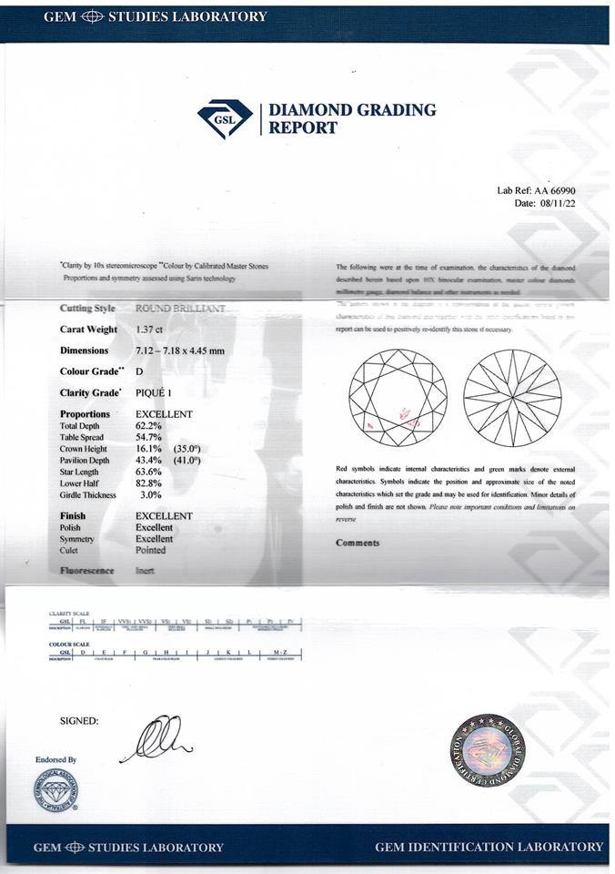 Diamond dress ring with centre round Diamonds of 1.37cts (With GSL Diamond Report graded as D P1 #AA66990) and surrounding round Diamonds totalling 1.27cts (Estimated grading: E-F SI-P1). Platinum. Ring size P1/2. Weight: 16.4g. (Pre-owned)
