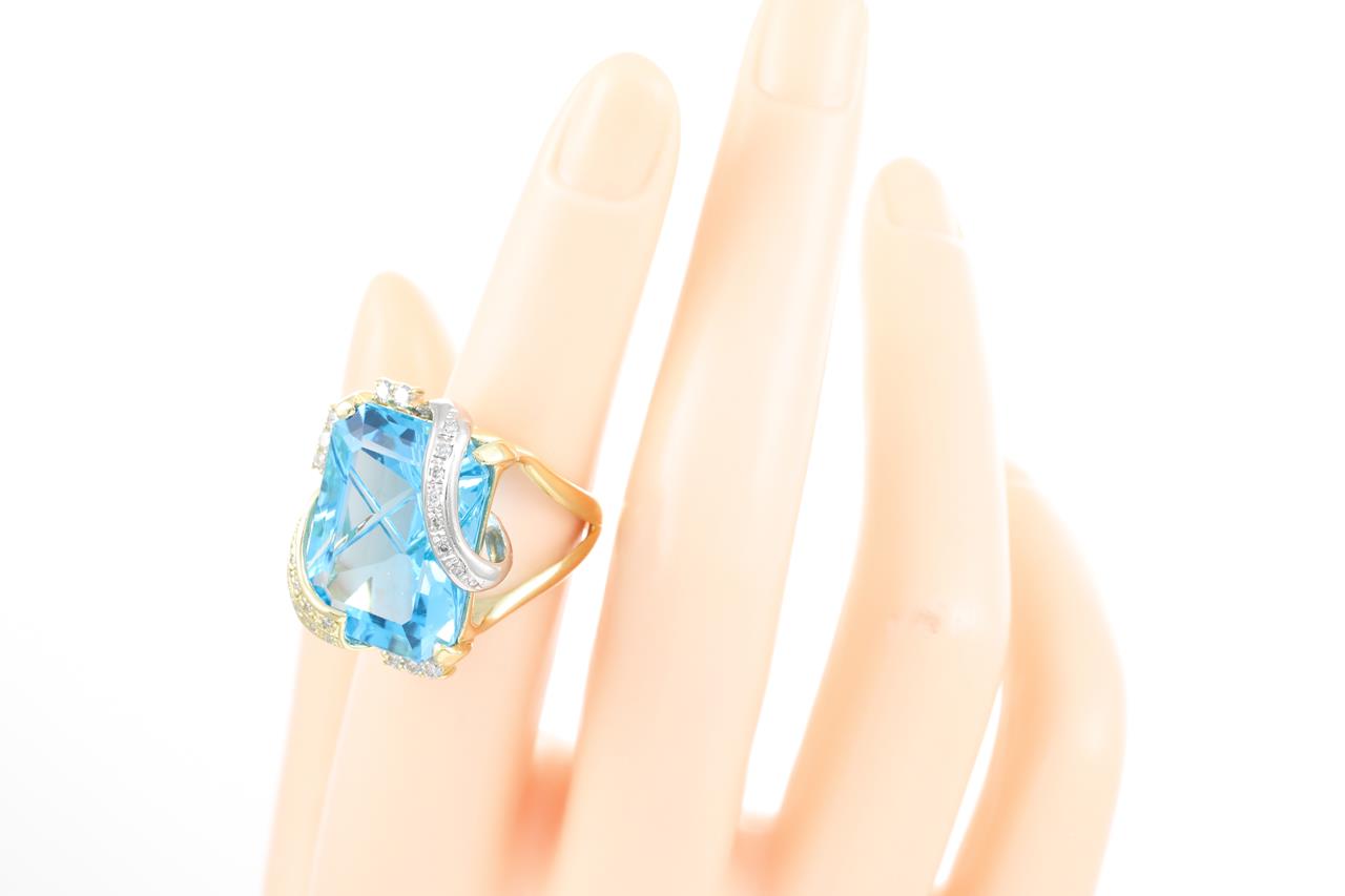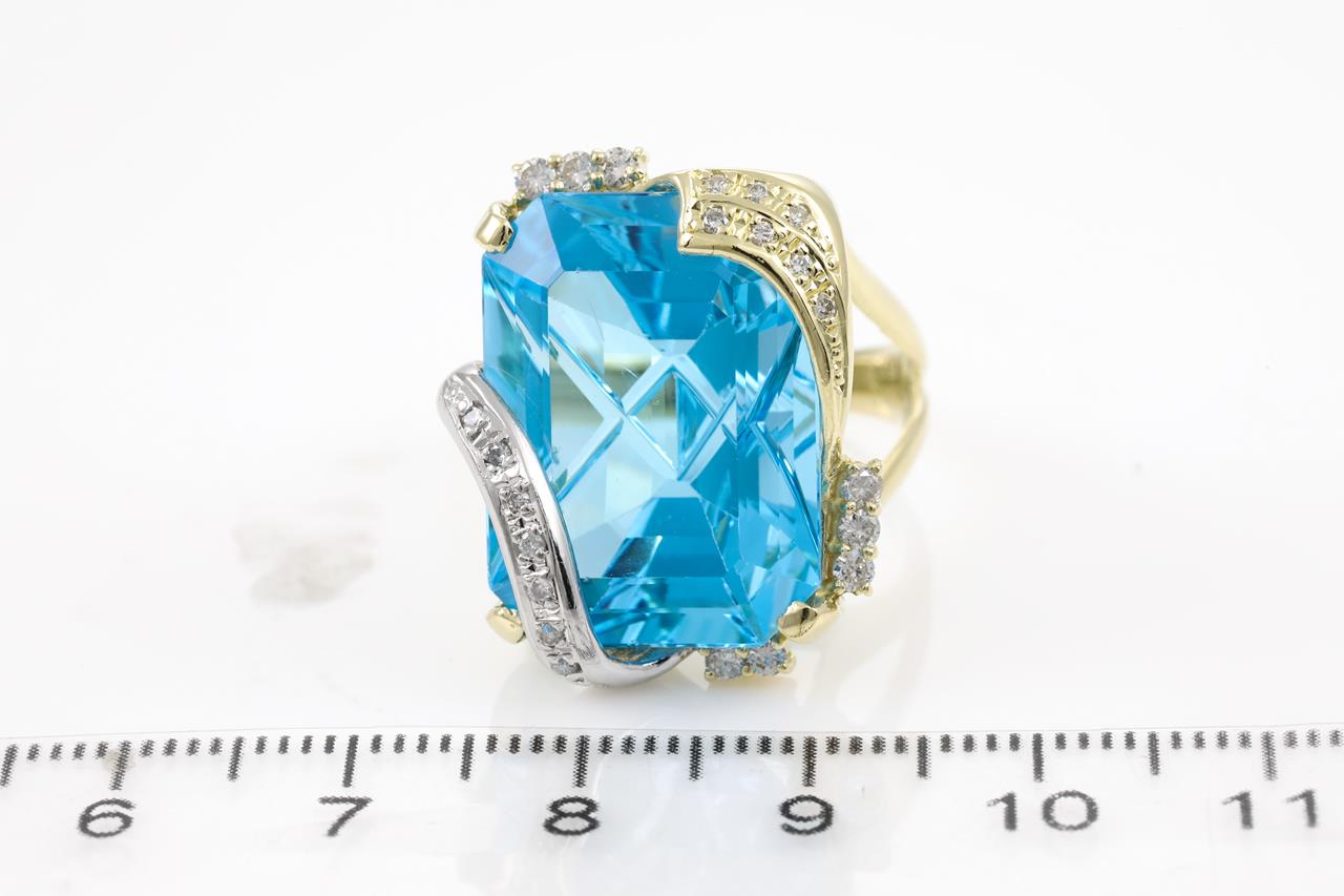 Topaz and Diamond ring with a rectangular fancy cut Topaz of 26.59ct (note minor surafce wear) and Diamonds totalling 0.31cts (Estimated grading: H SI). 18ct yellow and white gold. Ring size: K - ring resizing is not recommended. Weight: 15.4g. (Pre-owned)