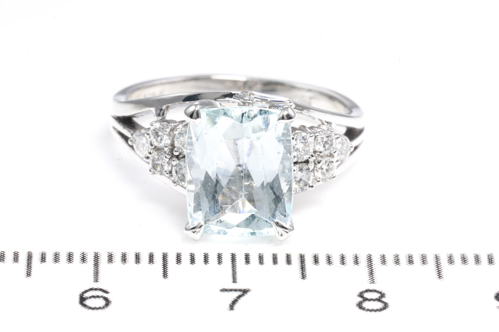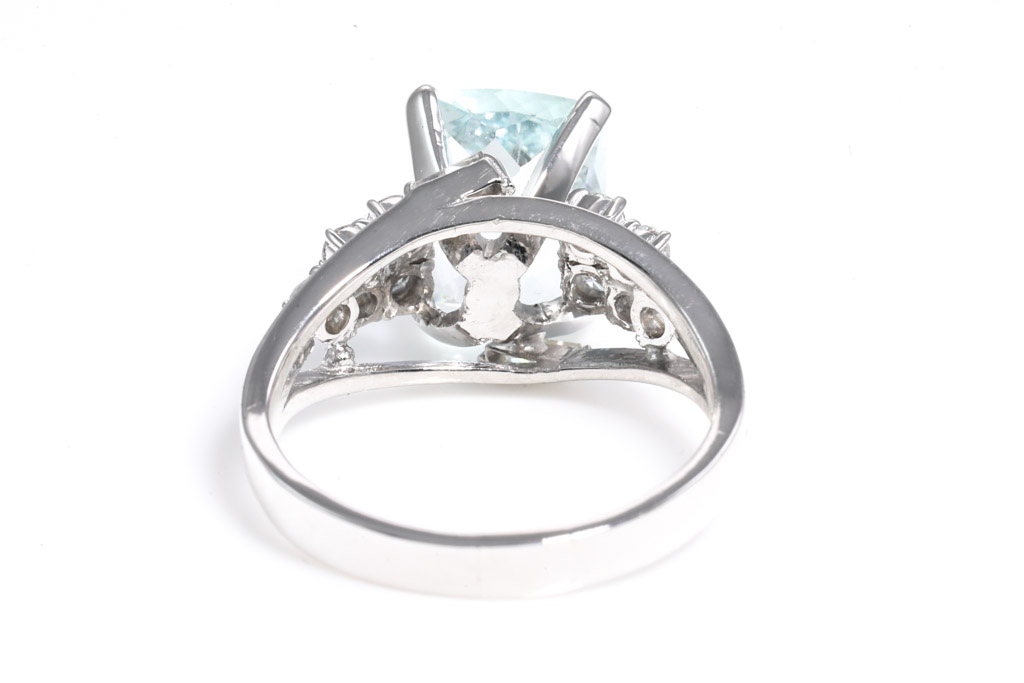 Aquamarine and Diamond ring with cushion cut Aquamarine of 2.65cts and Diamonds totalling approximately 0.25cts. 14ct white gold. Ring size M. Weight: 4.8g. (Pre-owned)