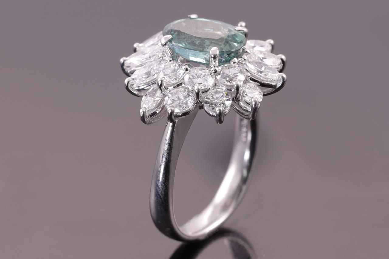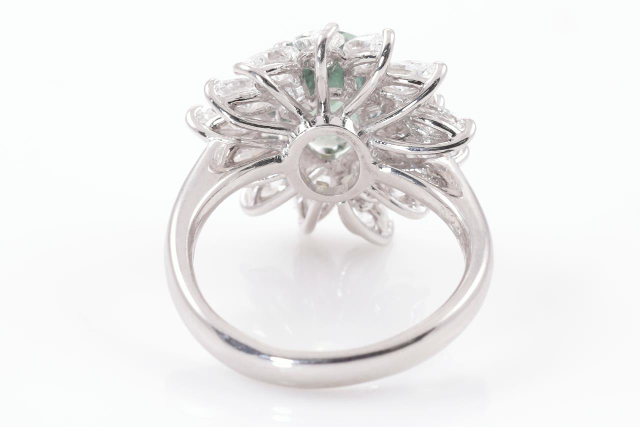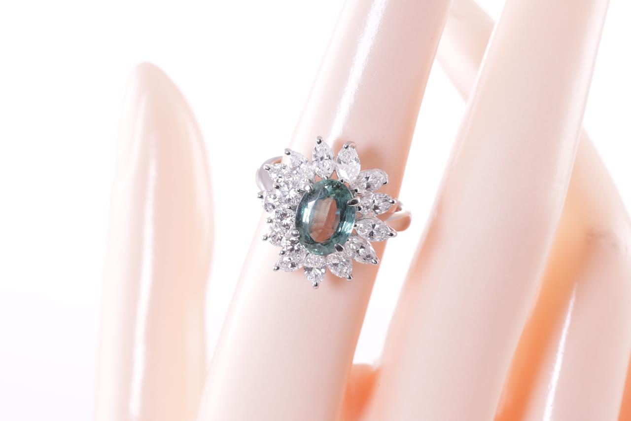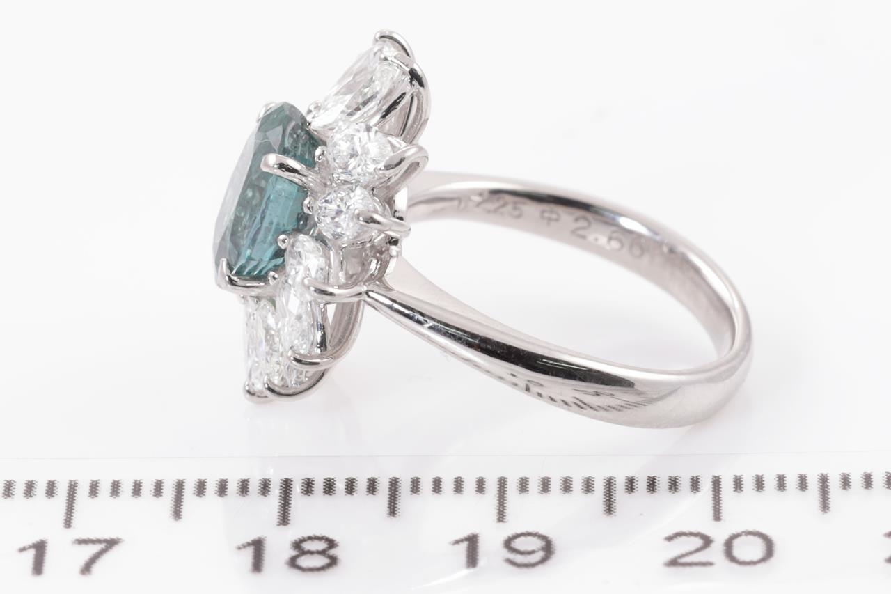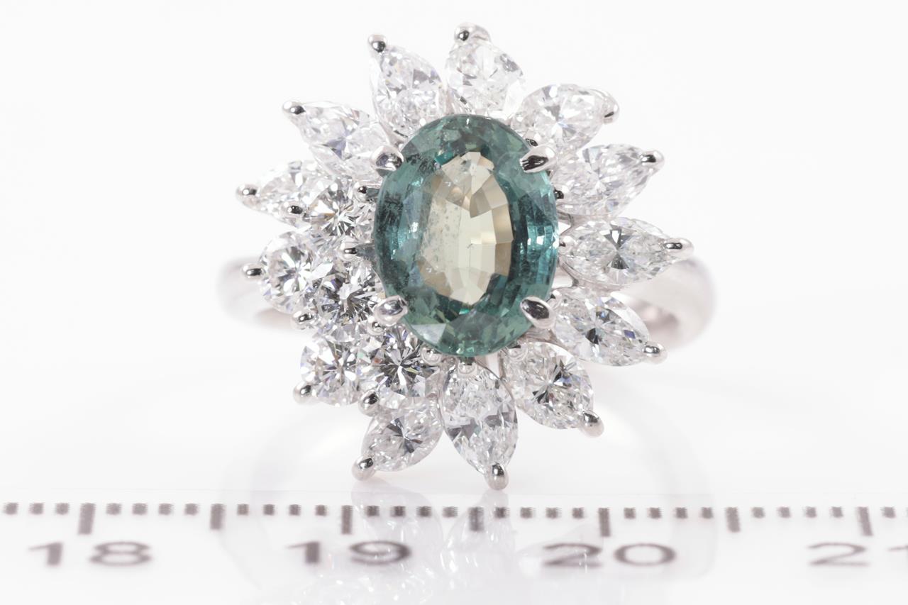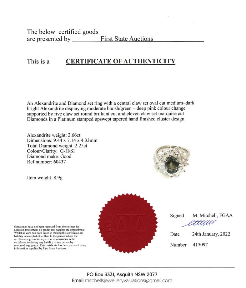 Alexandrite and Diamond ring with an oval cut Alexandrite of 2.66ct (colour change from bluish green to deep pink) with round and marquise cut Diamonds totalling 2.25cts (Estimated grading: G-H SI). Platinum. Rig size L. Weight: 8.9g. With certificate #415097. (Pre-owned)