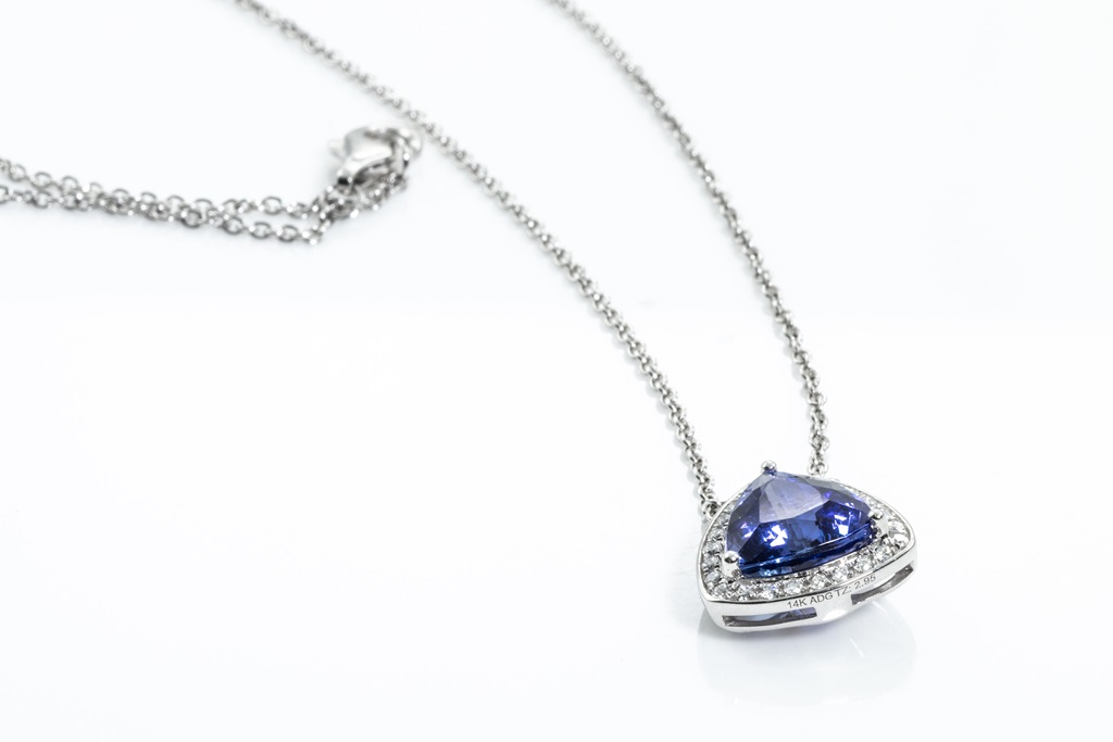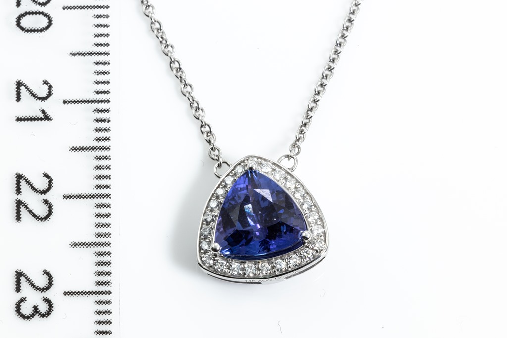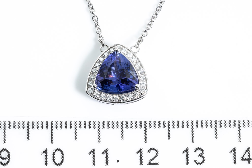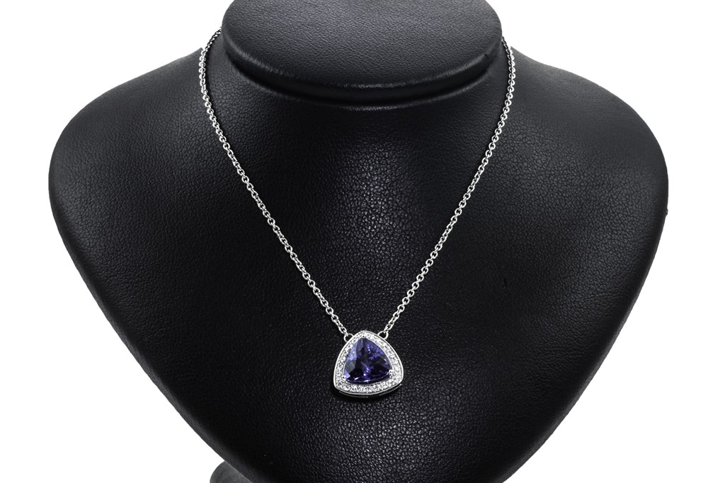 Tanzanite and Diamond pendant with a trilliant cut Tanzanite of 2.95ct and round Diamonds totalling 0.17cts. 14ct white gold with 14ct white gold attached chain. Length: 45cm. Weight: 4.4g. (As new)