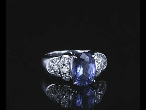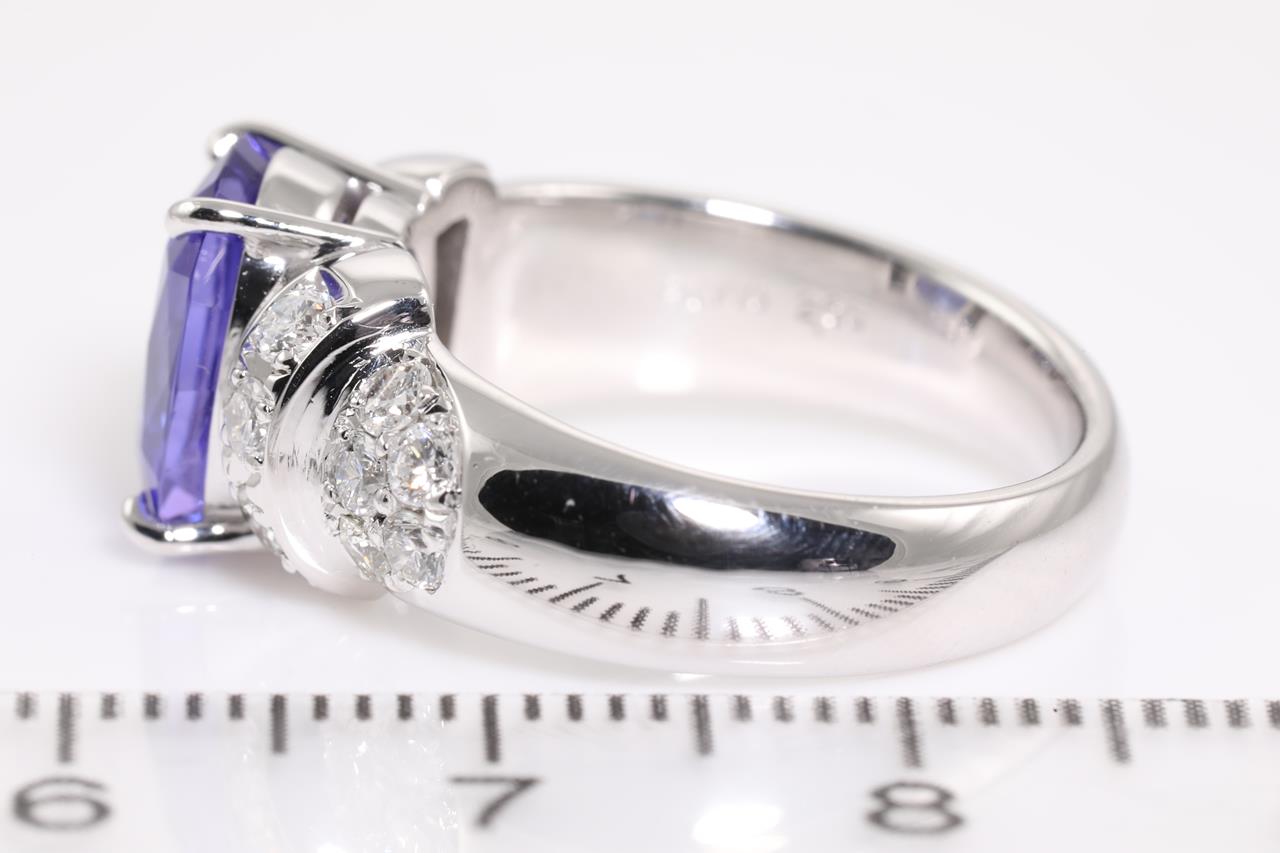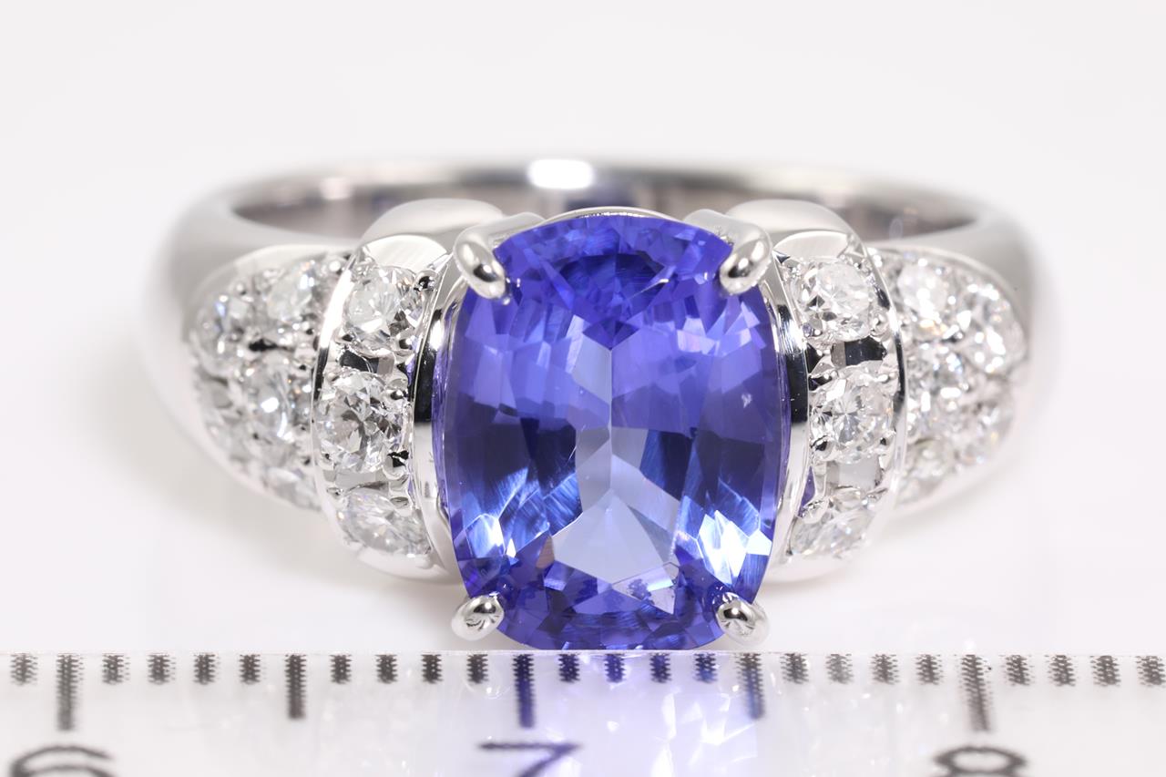 Tanzanite and Diamond ring with cushion cut Tanzanite of 2.66ct and Diamonds totalling 0.66cts (Estimated grading: G VS-SI). Platinum. Ring size M - cannot be resized up, down with ring clip. Weight: 12.0g (Pre-owned)
