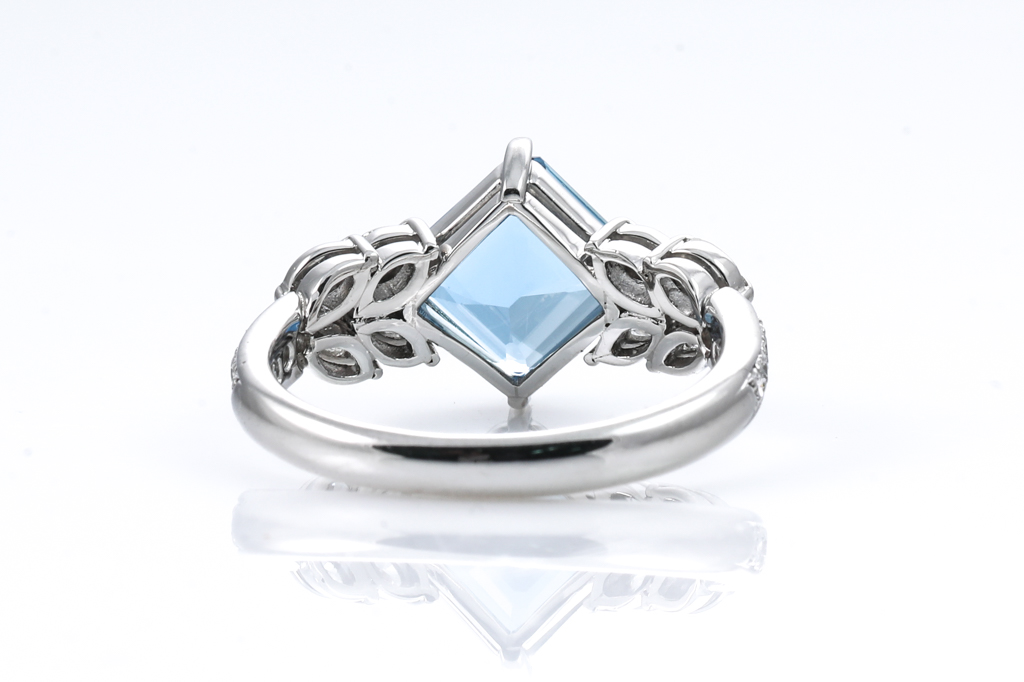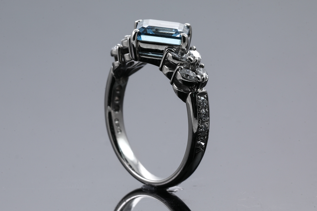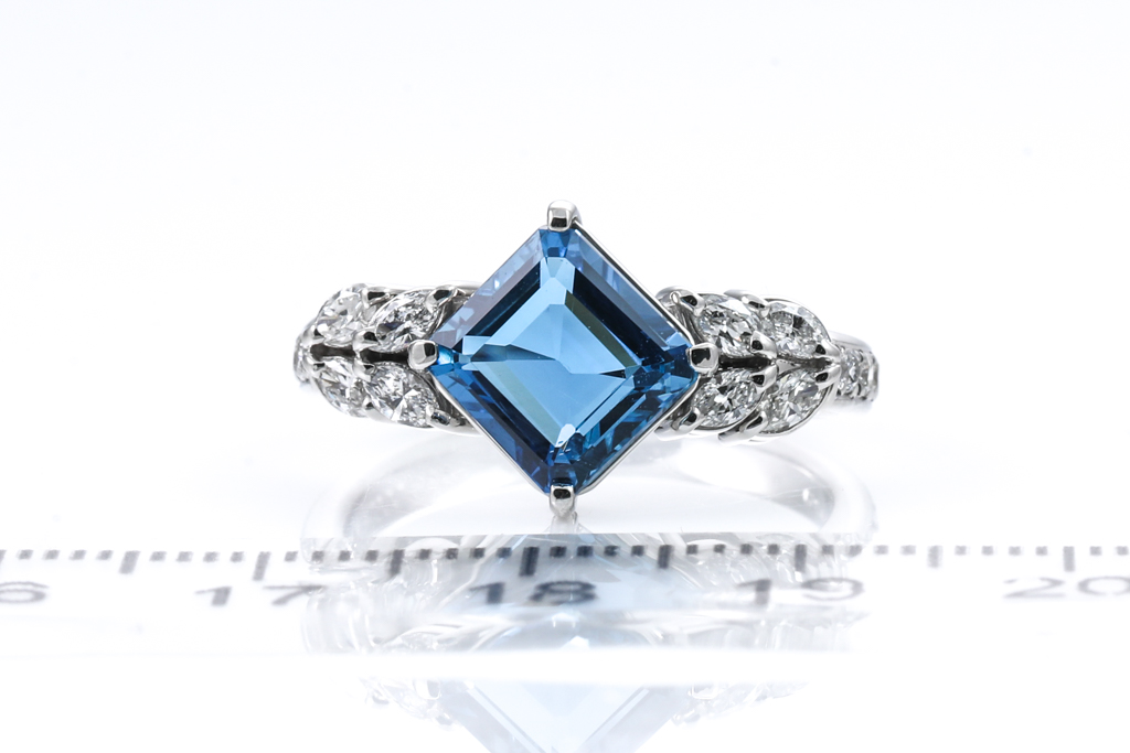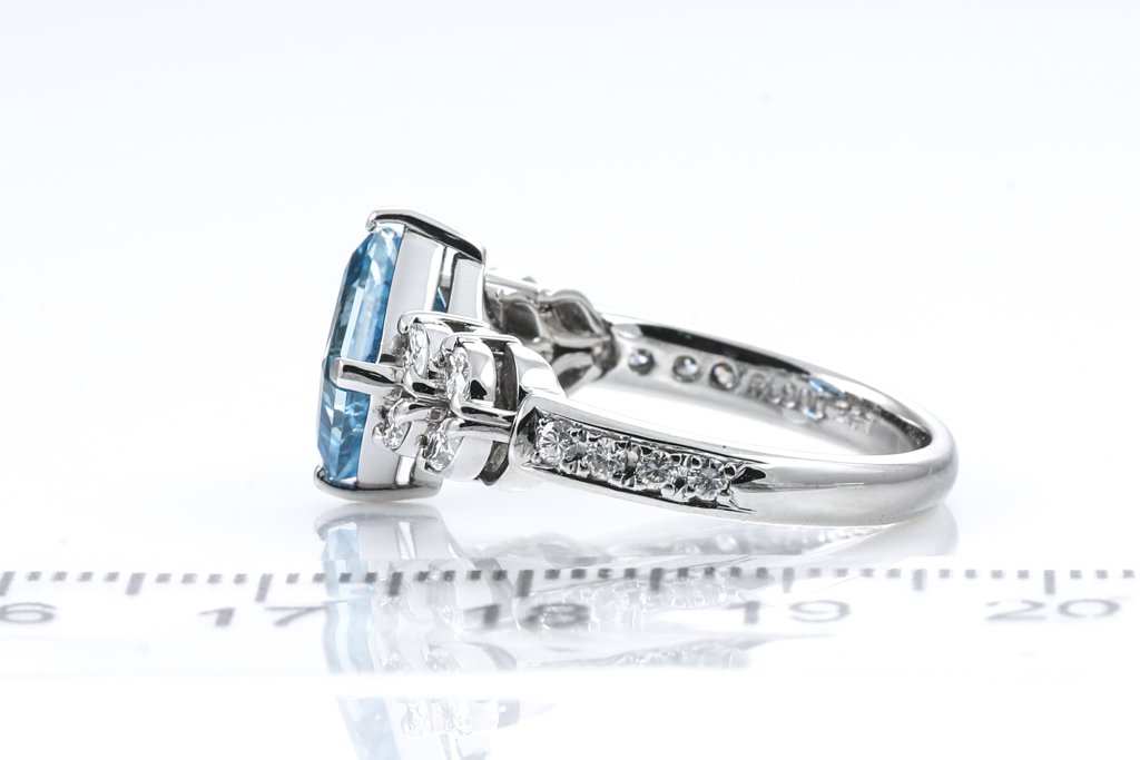 Aquamarine and Diamond ring with emerald cut Aquamarine of 2.67ct with round and marquise cut Diamond totalling 0.40cts (Estimated grading: H SI). Platinum. Ring size P 1/2. Weight: 8.2g. (Pre-owned)