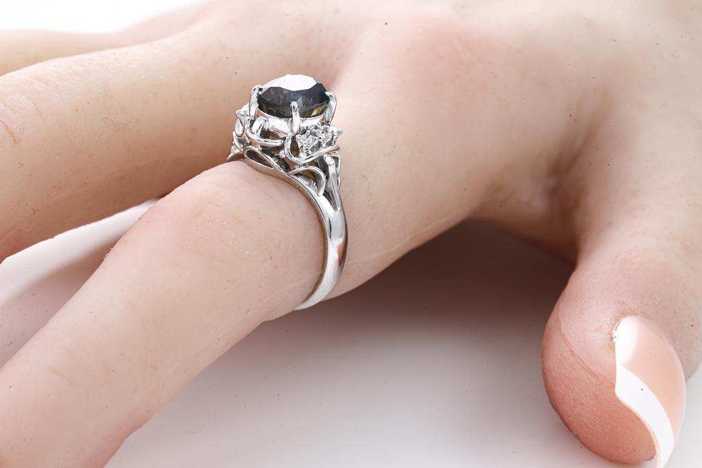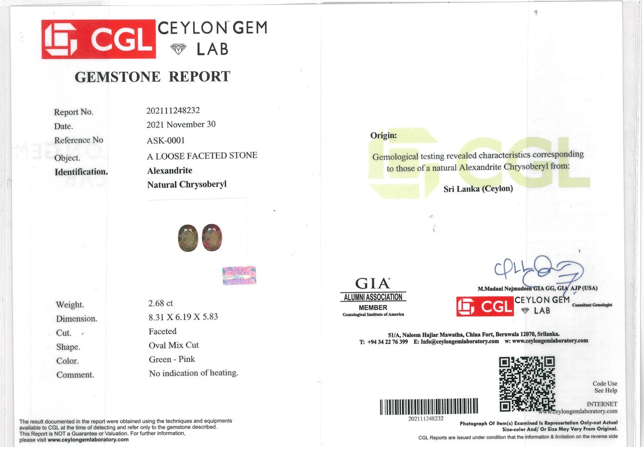 Alexandrite and Diamond ring with an oval shape unheated Ceylon Alexandrite of 2.68ct (with CGL certificate #202111248232) and 6 round Diamonds totalling 0.08cts. Platinum. Ring size J. Weight: 6.5g. (Pre-owned)