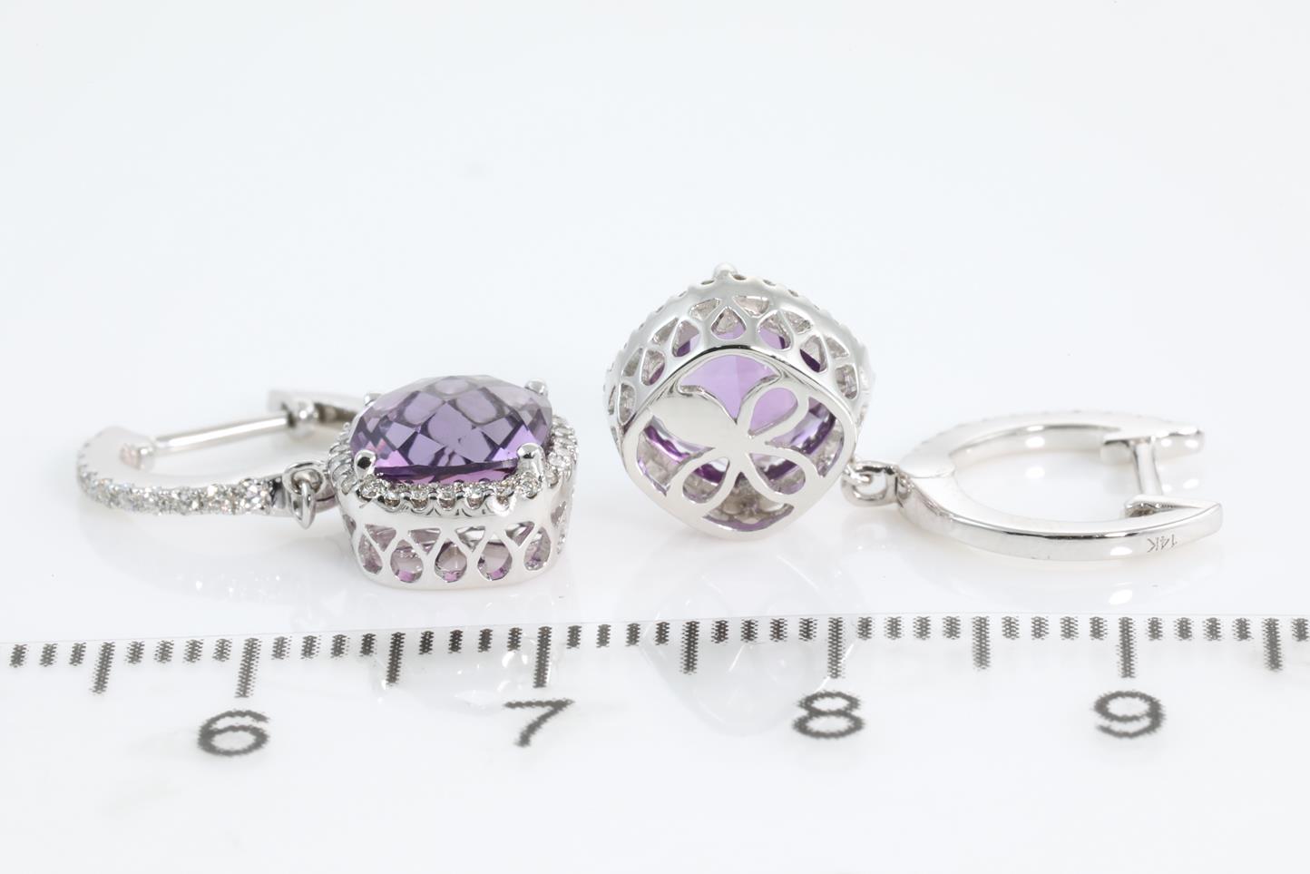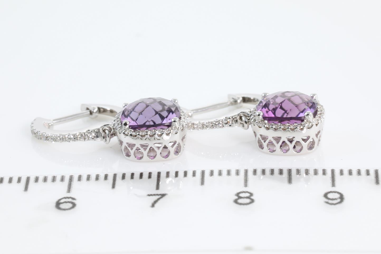 Amethyst and Diamond earrings with cushion cut Amethysts totalling 2.69ct and Diamonds totalling 0.28ct. 14ct White gold. Weight: 3.3g (New)