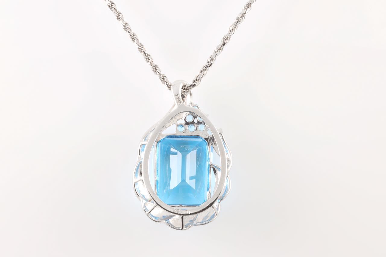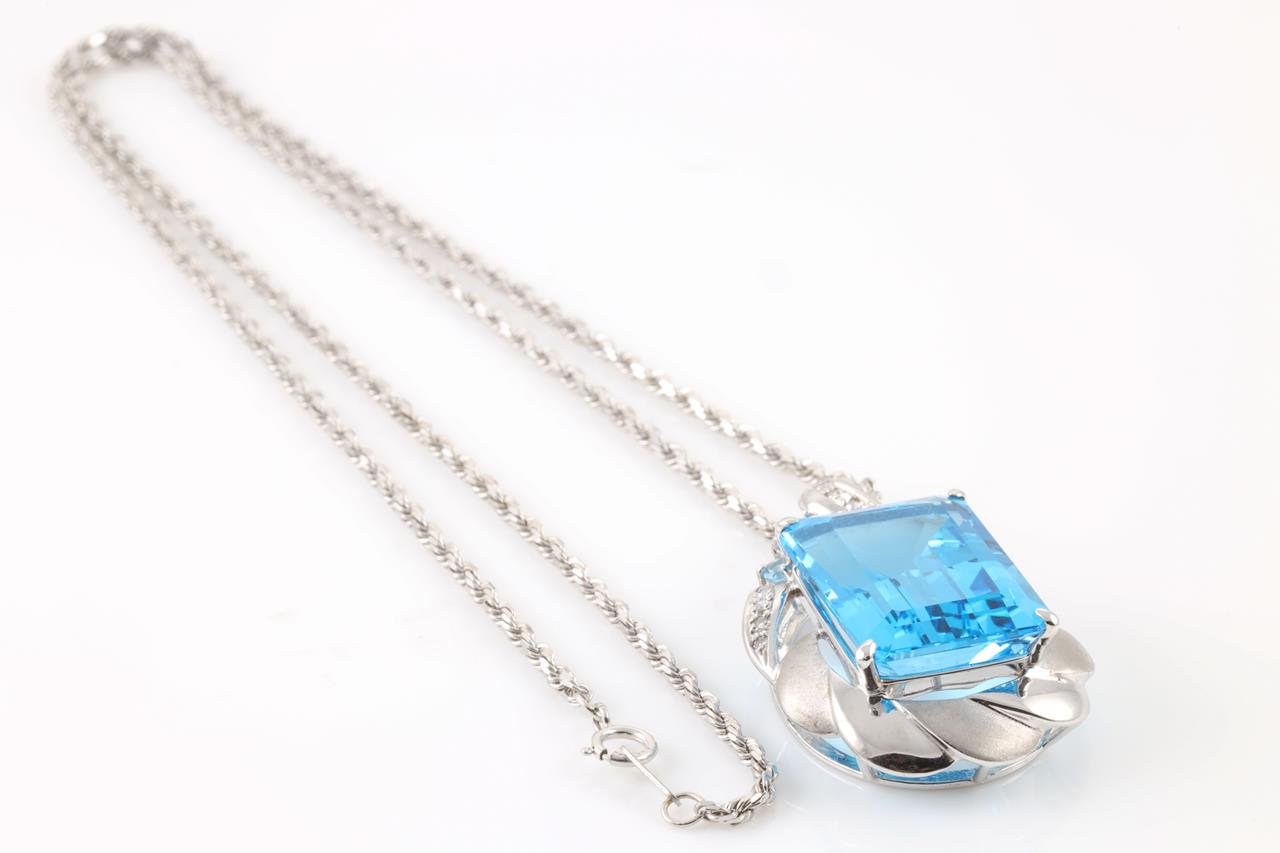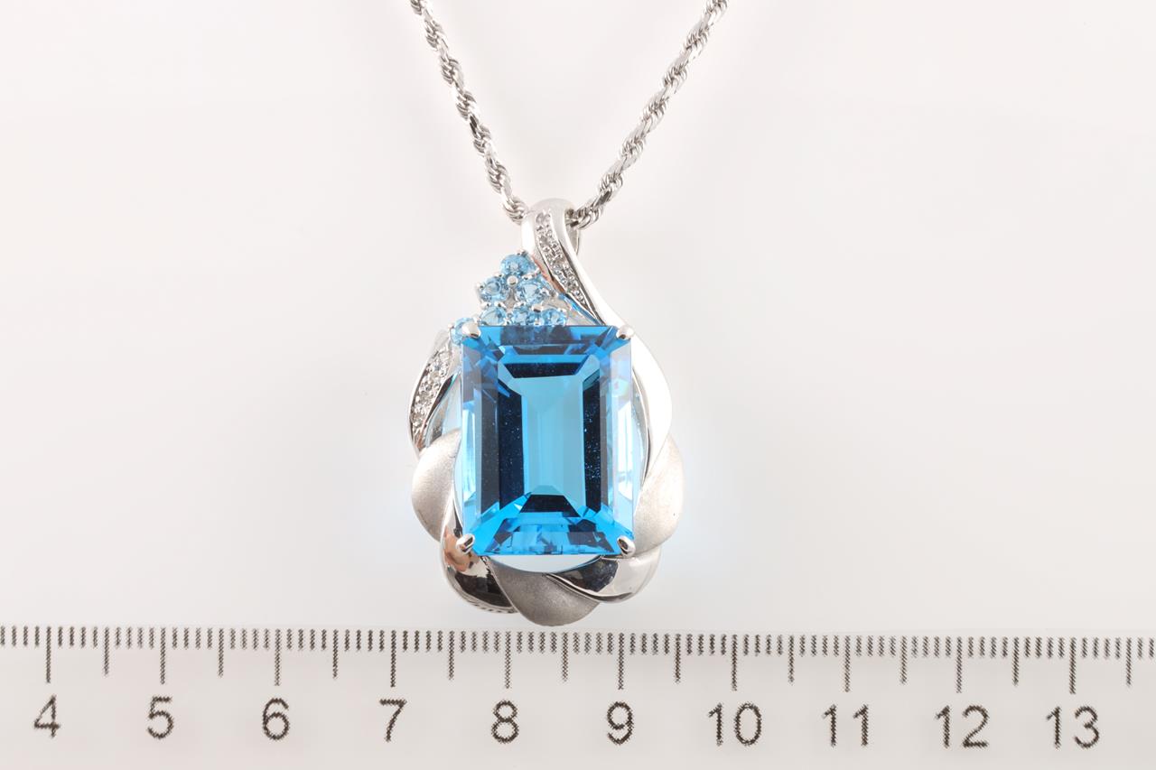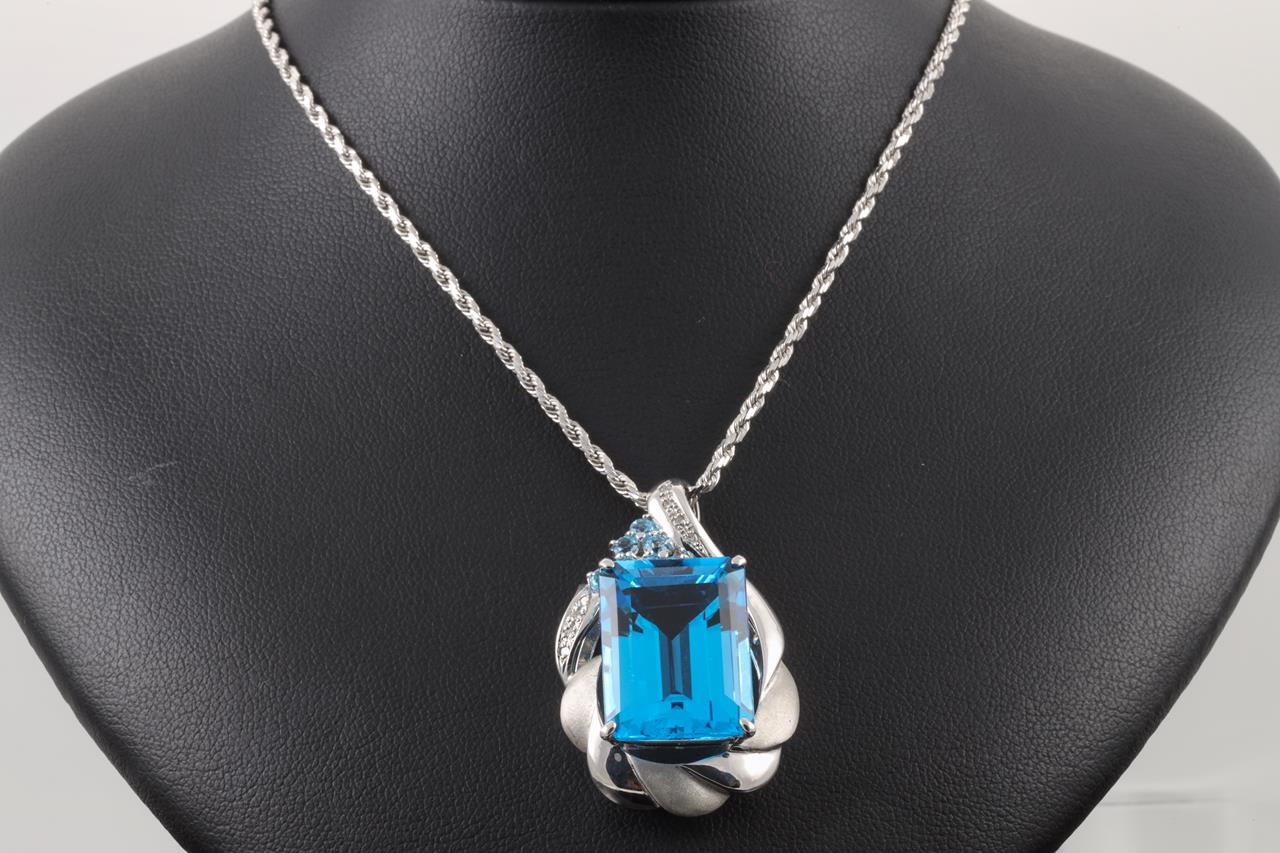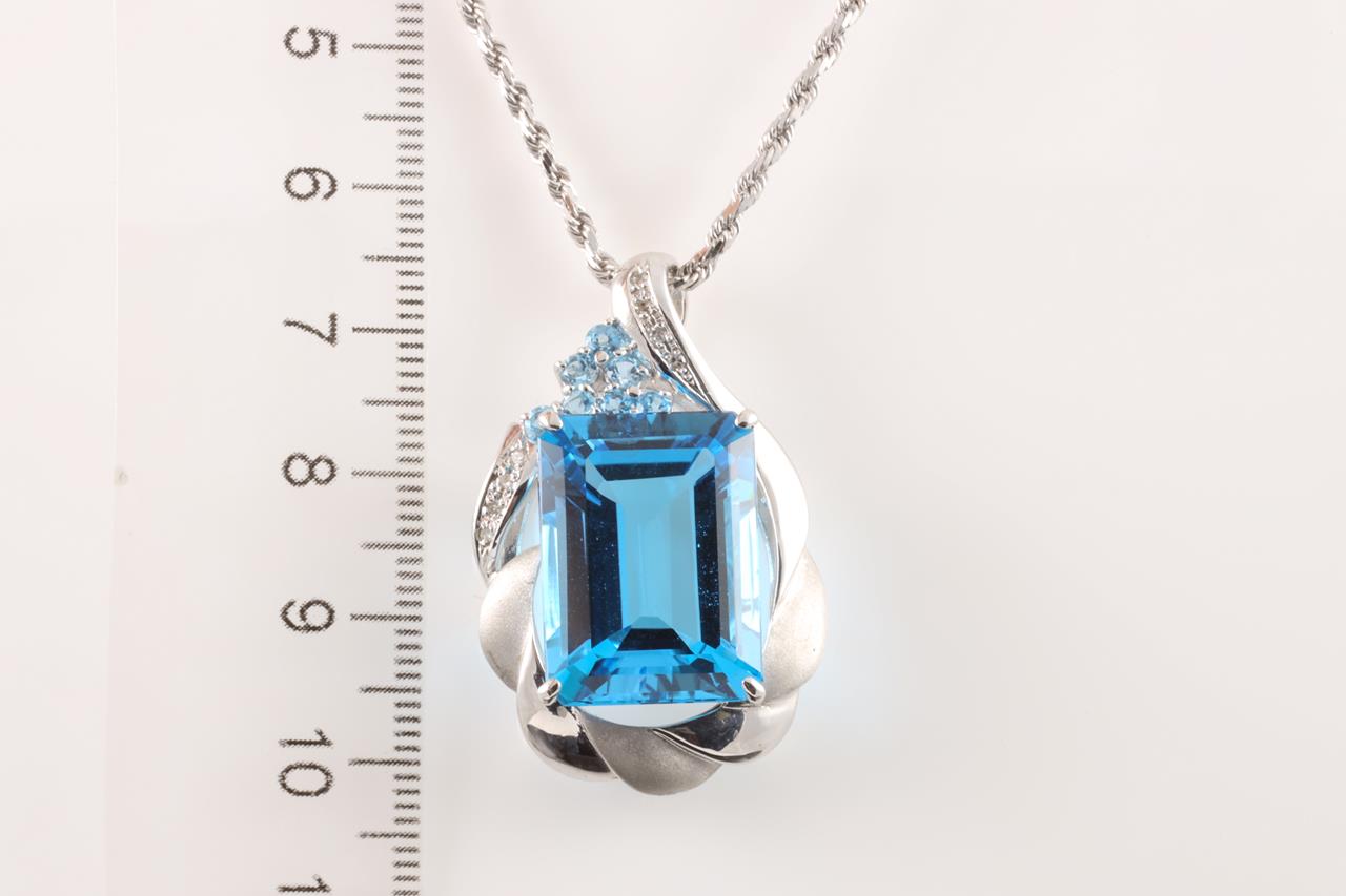 Topaz and Diamond Pendant with a centre emerald cut Topaz of 27.01ct, 7 round blue topaz totalling approximately 0.35cts and Diamonds totalling approximately 0.08cts. 14ct white gold with 50cm chain. Weight: 19.1g (Pre-owned)