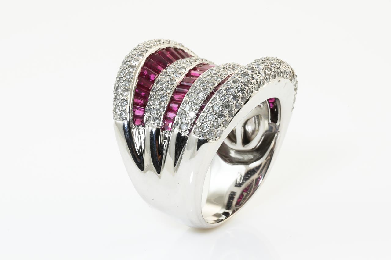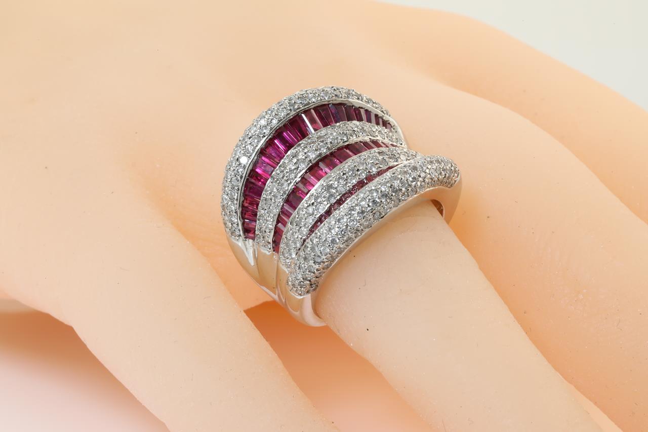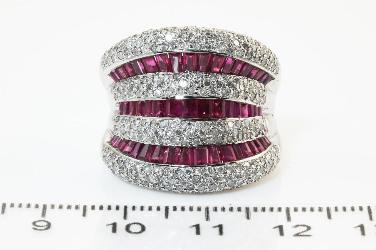Ruby and Diamond ring with baguette cut Rubies totalling 2.70cts and Diamonds totalling 1.40cts (Estimated grading: H SI). 18ct white gold. Ring size: N1/2 - Note it is not recommended to resize this ring up, it can be resized down by ring clip. Weight: 15.3g (Pre-owned)