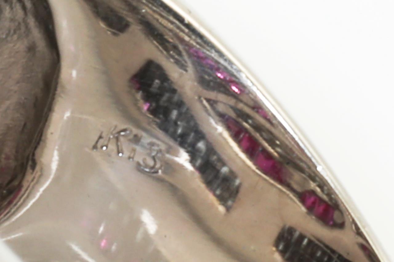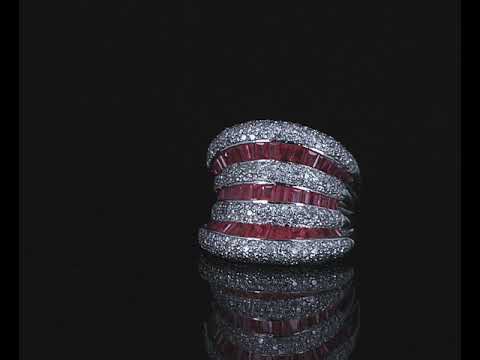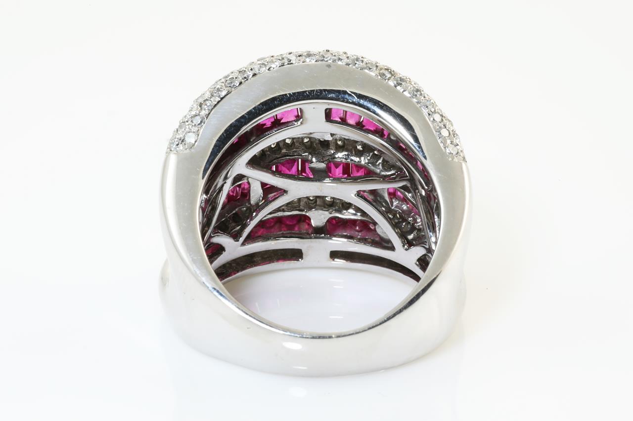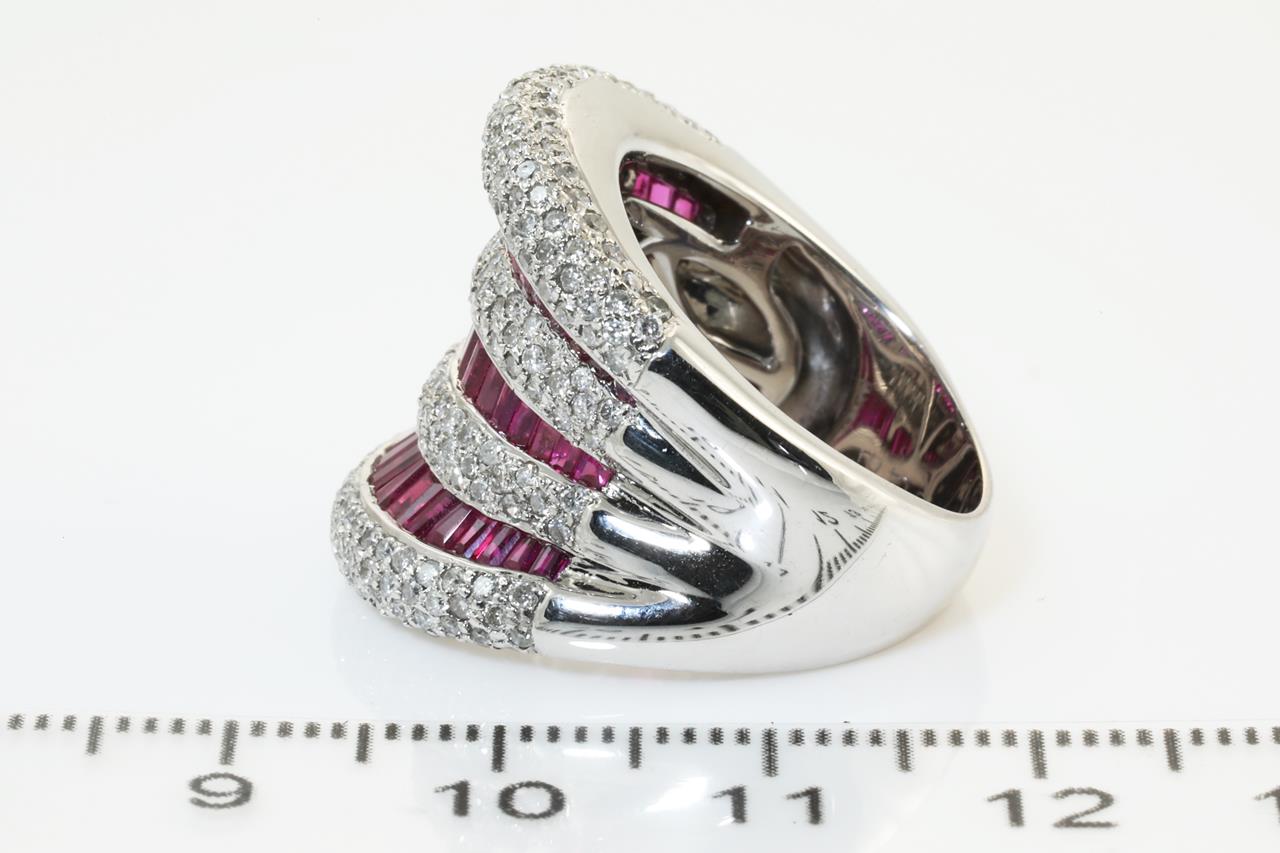 Ruby and Diamond ring with baguette cut Rubies totalling 2.70cts and Diamonds totalling 1.40cts (Estimated grading: H SI). 18ct white gold. Ring size: N1/2 - Note it is not recommended to resize this ring up, it can be resized down by ring clip. Weight: 15.3g (Pre-owned)