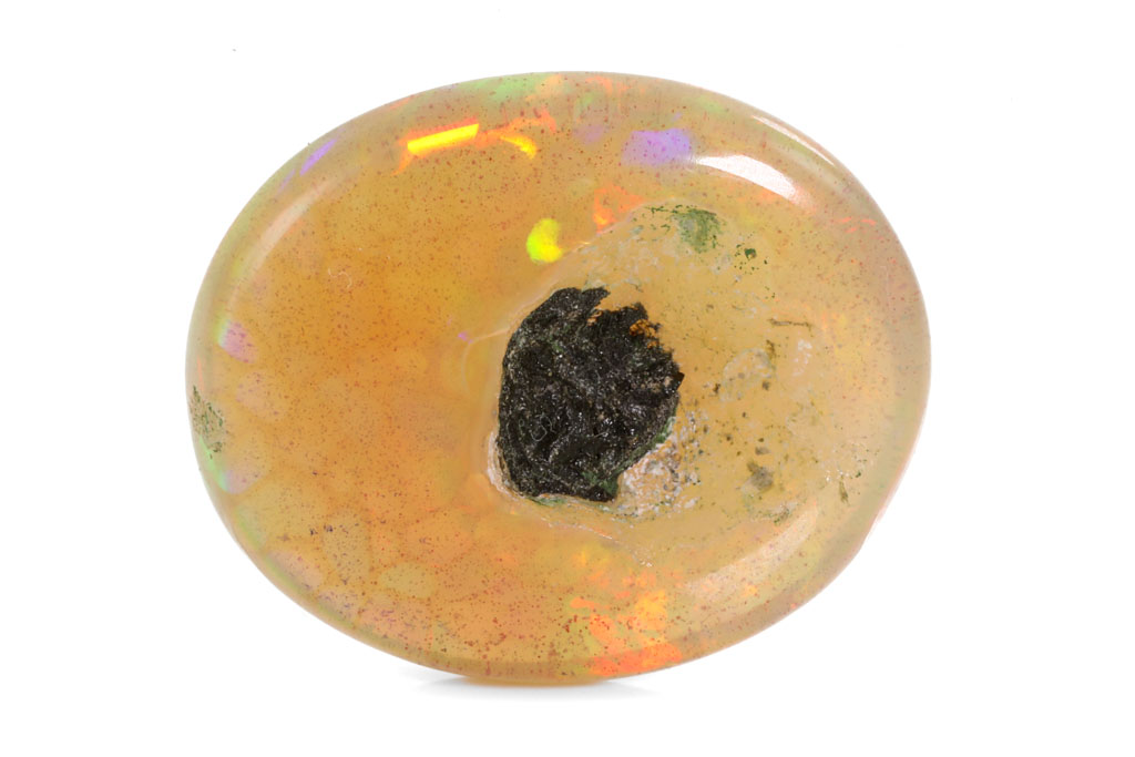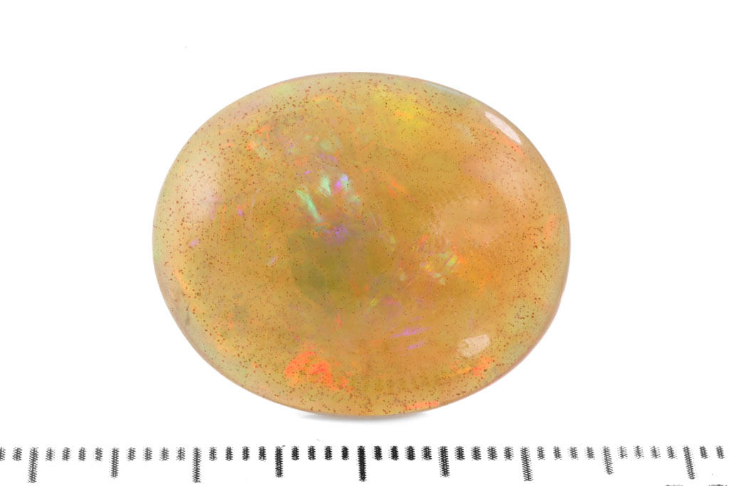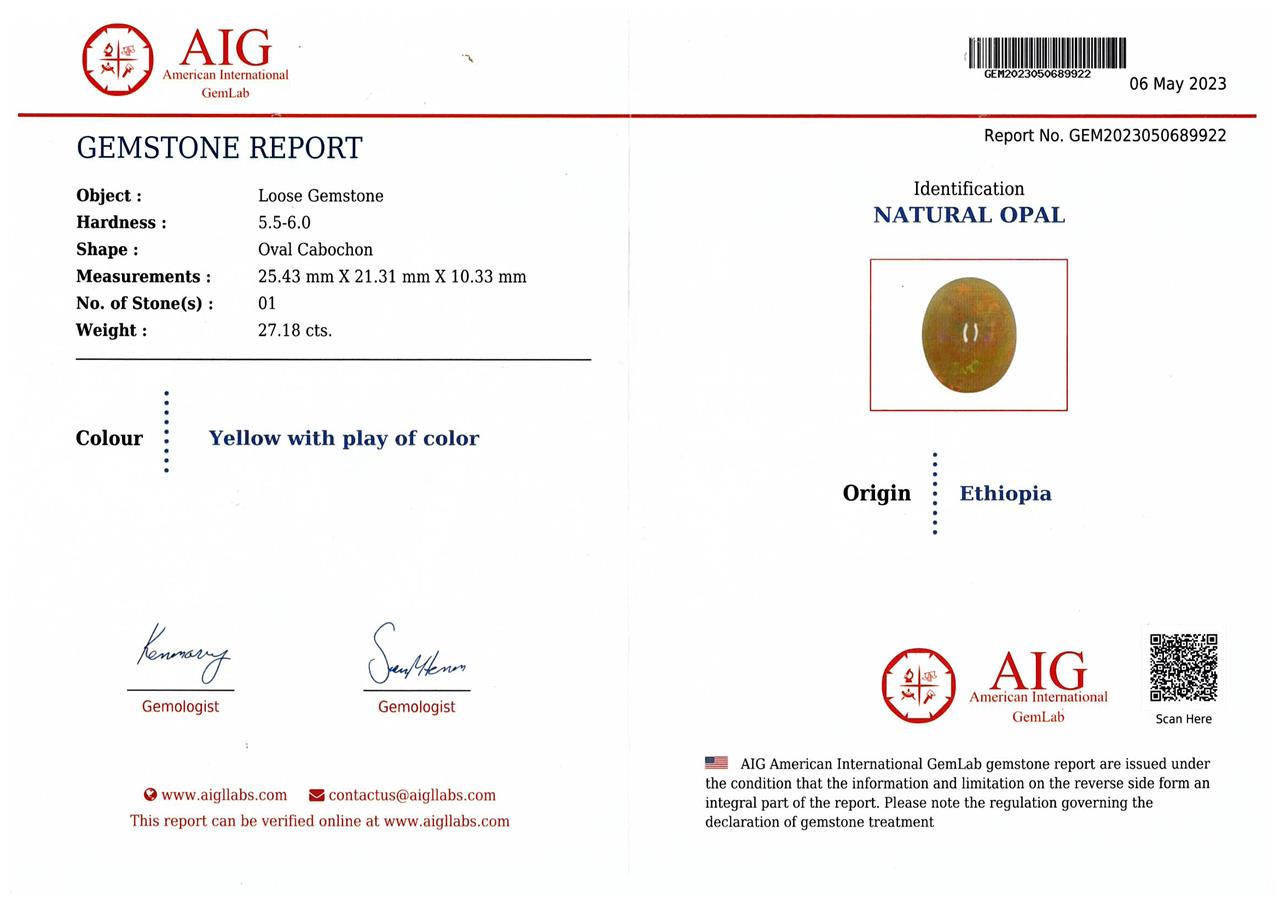 A loose oval cabochon cut solid Ethiopian yellow Cystal Opal of 27.18ct (with AIG Gemstone Report #GEM2023050689922). (As New)
